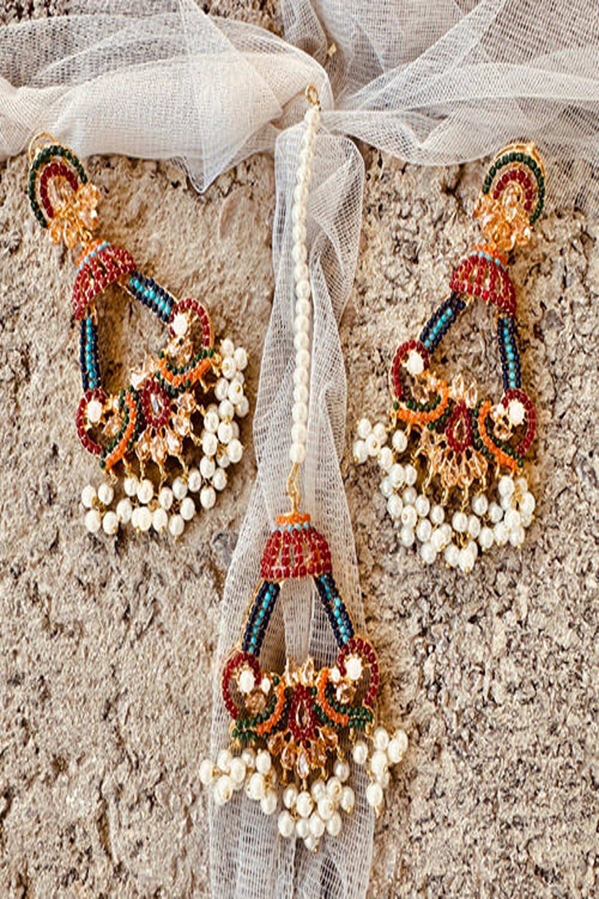 The Nauratan Glimmer Set in Gold is all about timeless elegance. The warm golden tones bring an aura of luxury and refinement, making it the perfect choice for any grand celebration. The choker, earrings, and tikka set will elevate your ensemble with a radiant, regal finish.