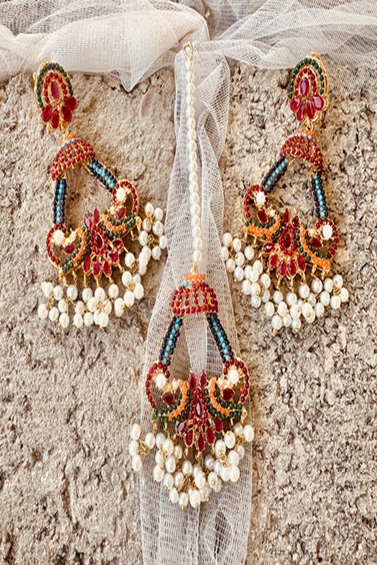 Stand out in the stunning Nauratan Glimmer Set in Ruby. With its deep, fiery red tones, this set exudes passion and royalty. Ideal for weddings and special events, the ruby choker, earrings, and tikka combination will add a bold yet graceful touch to your look.