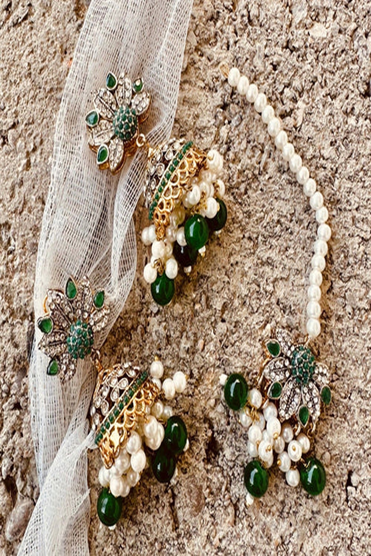 A stunning choker set in rich green, inspired by vintage luxury. The intricate craftsmanship, paired with matching earrings and a tikka, adds a touch of sophistication, making it an ideal choice for celebrations and traditional gatherings.