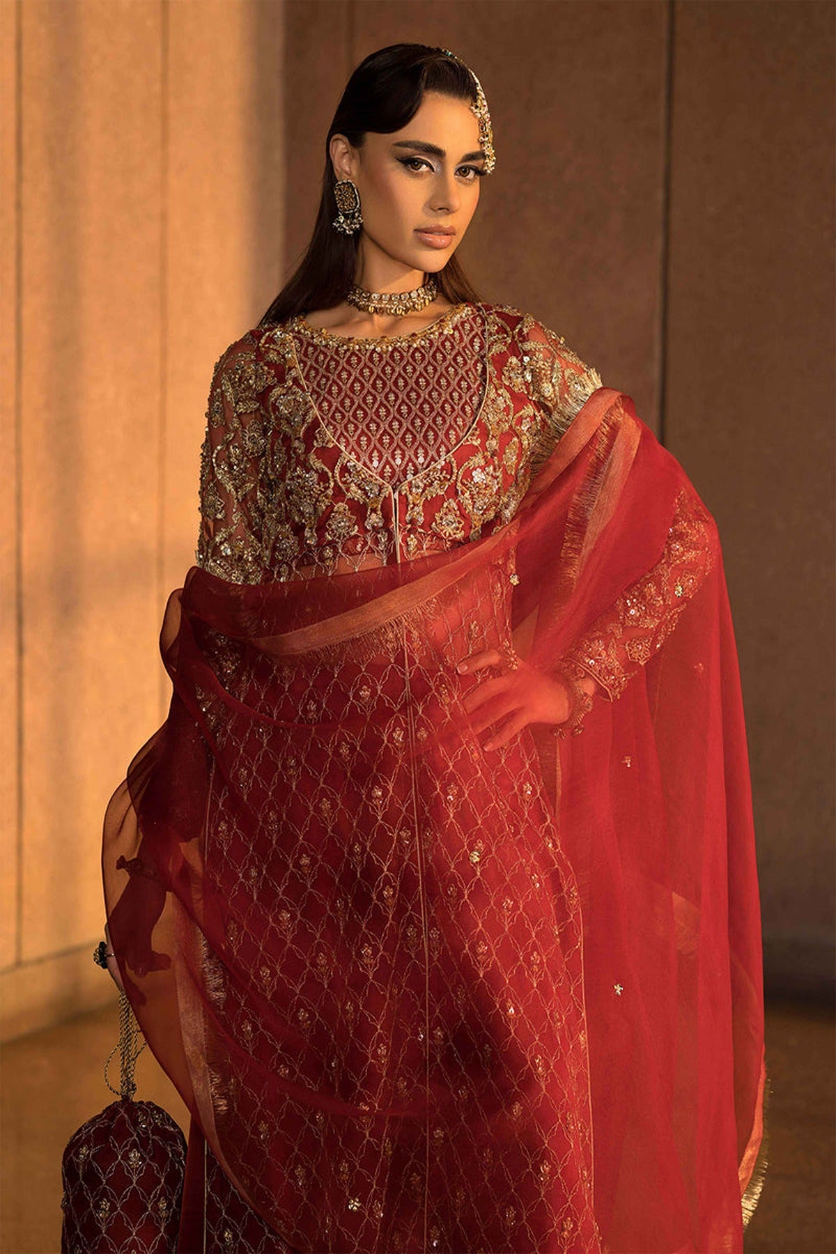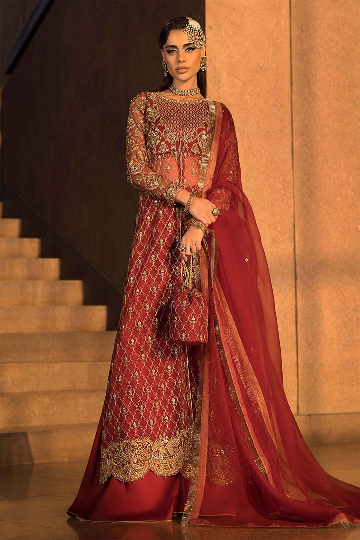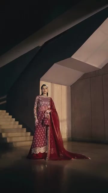 This stunning red long dress is a bold and glamorous statement piece, expertly crafted to exude both elegance and daring sophistication. Made from luxurious organza in a rich reddish-maroon hue, the dress cascades gracefully to the floor, creating a statuesque and regal silhouette. The form-fitting bodice enhances the curves while ensuring a flattering and comfortable fit. What truly sets this dress apart are the intricate embellishments—delicate embroidery, sequins, and exquisite details that add a radiant touch of sparkle and opulence. Paired with a matching sharara, this ensemble seamlessly combines classic design with contemporary refinement, making it the perfect choice for those seeking a look that is both timeless and captivating.