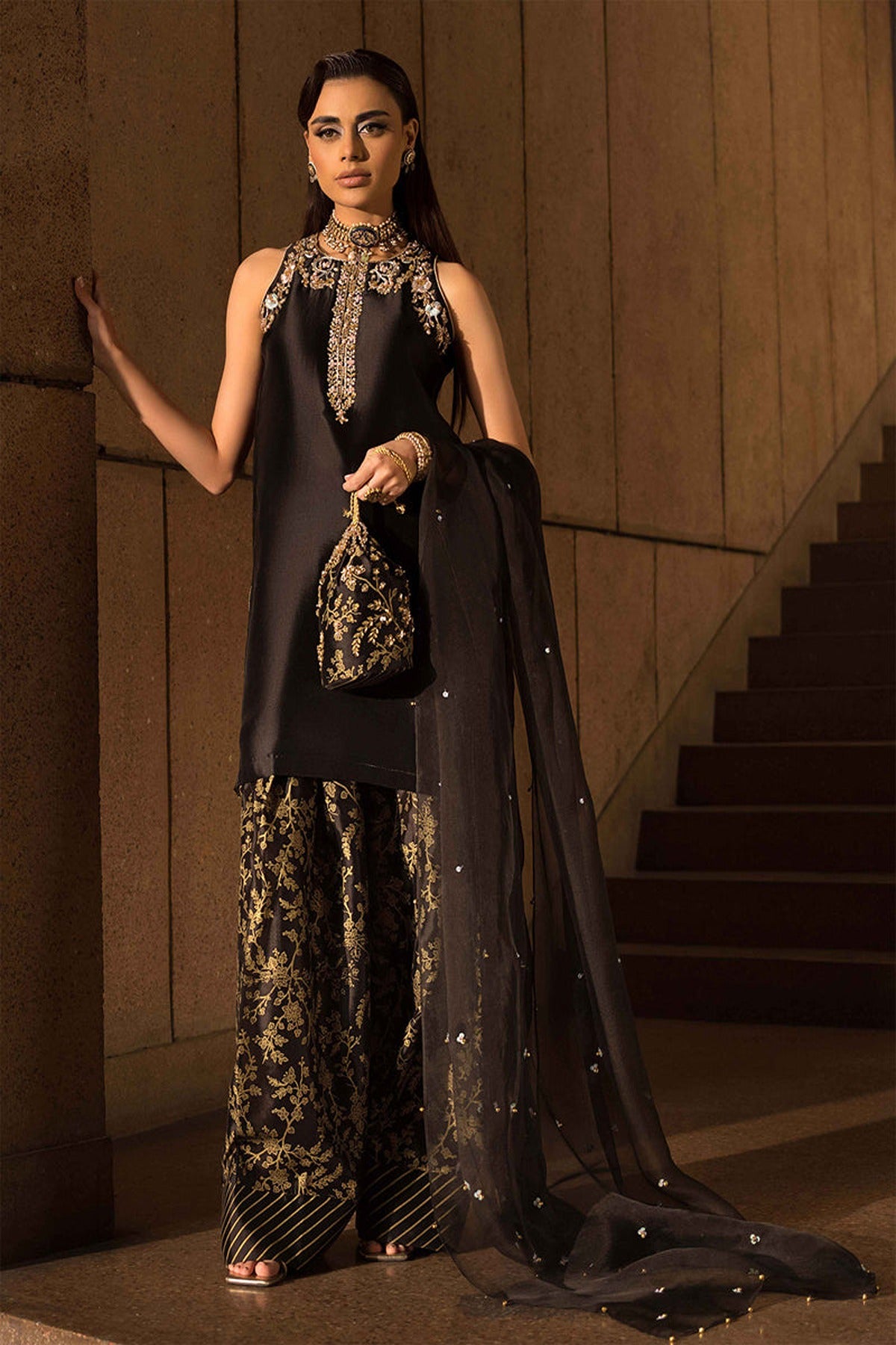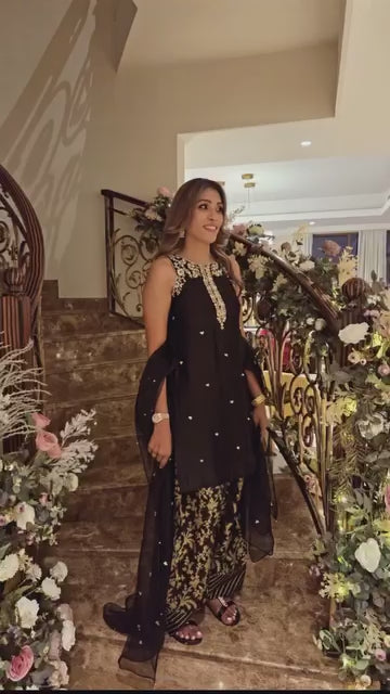 It is paired with a stylish shalwar, enhanced with intricate screen printing that adds depth and texture to the ensemble. The look is completed with a stunning printed organza dupatta, adorned with a delicate spray of sequins and ghungroos, which catches the light and creates a mesmerizing effect with every movement.