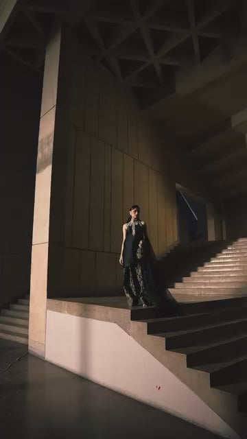 This absolute elegant black silk tissue shirt exudes timeless sophistication, featuring a beautifully embellished neckline that adds a touch of luxury and charm. The fine craftsmanship of the shirt perfectly complements its sleek, modern silhouette, making it a versatile choice for various occasions.