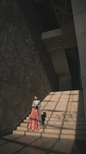 This dreamy pink lehenga paired with an ice-blue choli is a true work of art, richly embroidered with zardozi and resham accents. The intricate zardozi embroidery adds a luxurious touch, with its metallic sheen contrasting beautifully against the soft, delicate resham work. The lehenga exudes a refined elegance, while the ice-blue choli brings a cool, refreshing contrast. The ensemble is completed with a sequin net dupatta, which provides a sheer, ethereal look that catches the light with every movement, creating a stunning and graceful effect. This outfit is perfect for those seeking a combination of tradition and modern glamour.