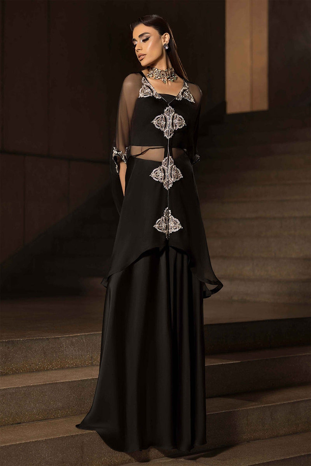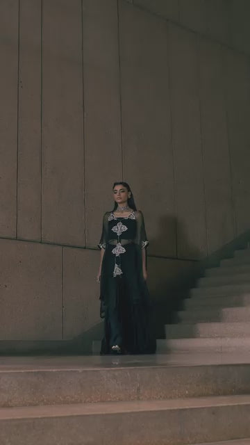 The Spark cape, crafted from sheer organza and adorned with intricate hand-embroidery in zardozi, is a stunning piece that seamlessly transitions between effortless glamour and extravagant elegance. The light, airy texture of the organza contrasts beautifully with the luxurious, metallic threads of zardozi, creating a visual masterpiece. Whether draped casually over a simple outfit or worn to elevate a more formal ensemble, the cape’s detailed craftsmanship adds a touch of opulence and sophistication. Its versatility makes it perfect for any occasion, whether you're aiming for understated elegance or bold, extravagant style.
