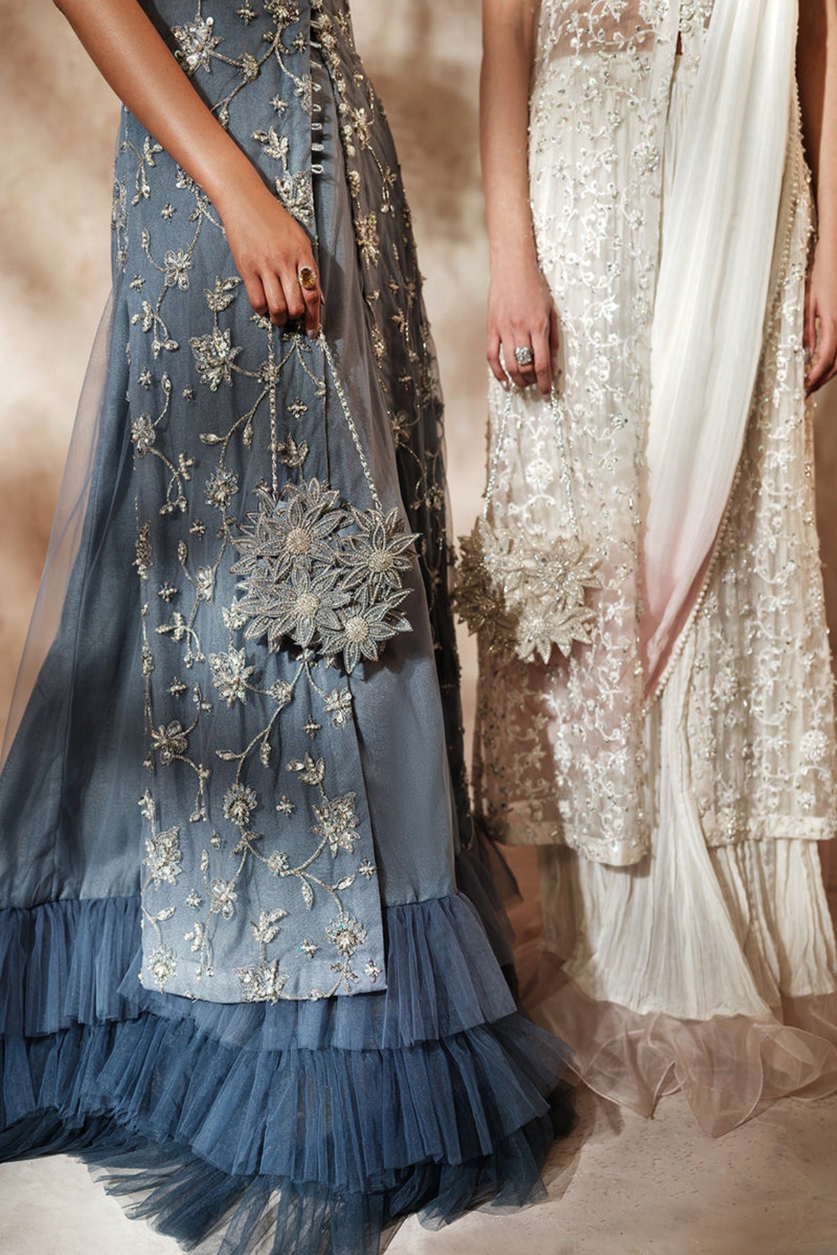 A dainty Grey silhouette, lavishly adorned with intricate embellishments . The opulent front open panneled shirt evokes a regal charm fit for royalty. Accompanying this divine piece is the resplendent net 3 layer ruffle lehnga draping gracefully and exuding a fairy-tale like aura.