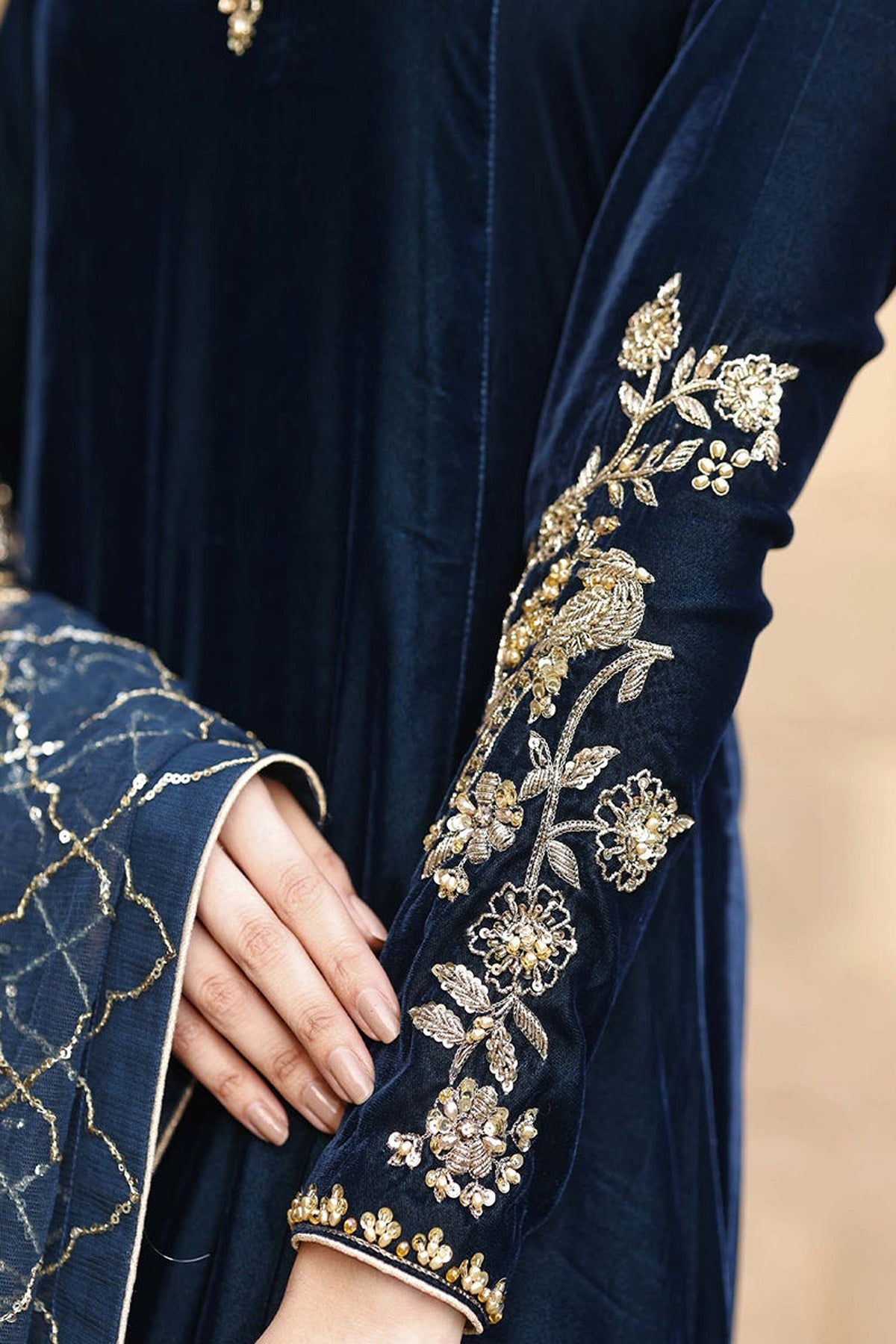 Experience timeless elegance with our Teal Blue velvet flared shirt featuring a captivating shimmering gold dabka embellishments on the neck and sleeves, adorned with Swarovski and silk French knots. Pair it with a mesmerizing dupatta boasting intricate sequin work.
