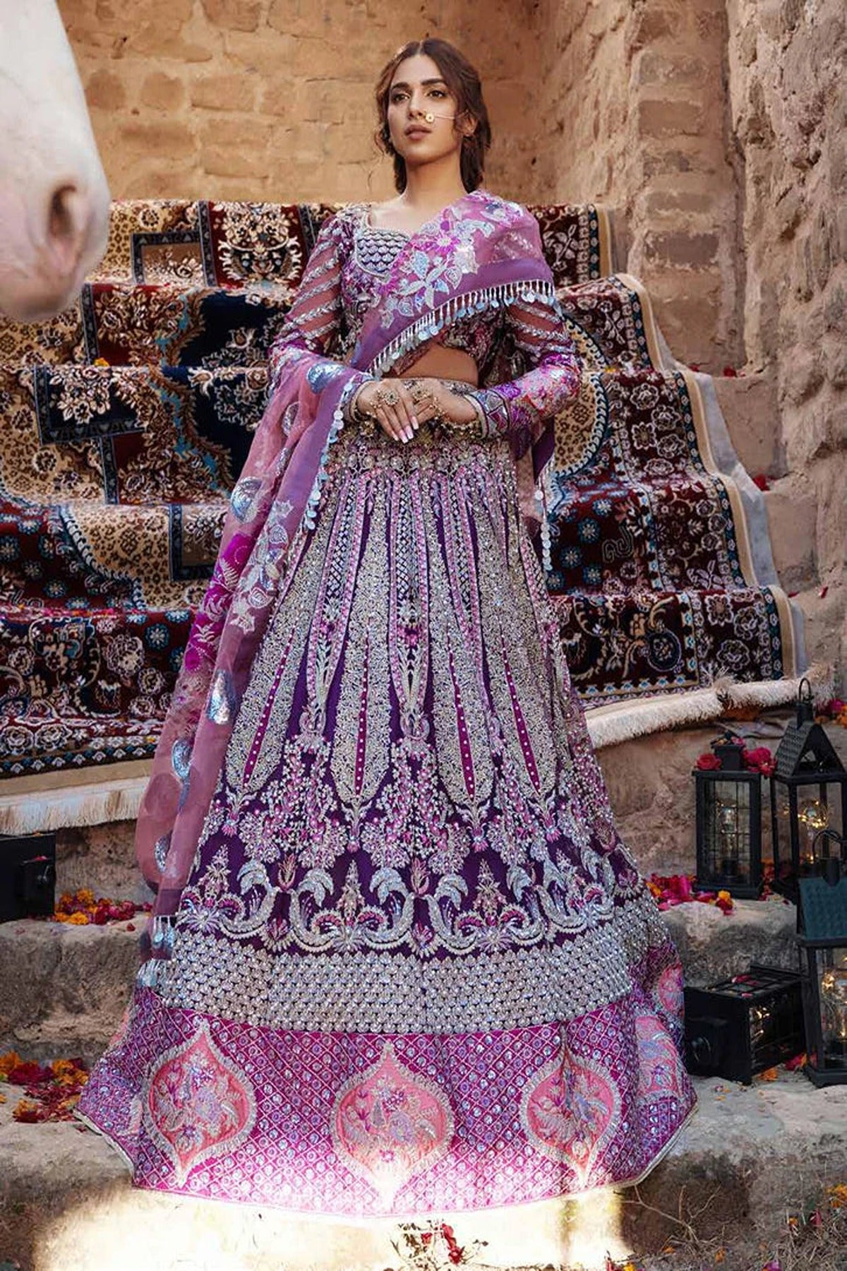 Exuding royalty, ‘Mehfil’ is a purple creation fit for queens and raanis alike. The most grand of the grand, a hand embellished bodice with lehnga panels heavily beaded with crystal and pearl hand work over resham and roll embroideries overlapping sequin details. The grandeur of this ensemble is exemplary as it is for those who want to make a statement this season.
