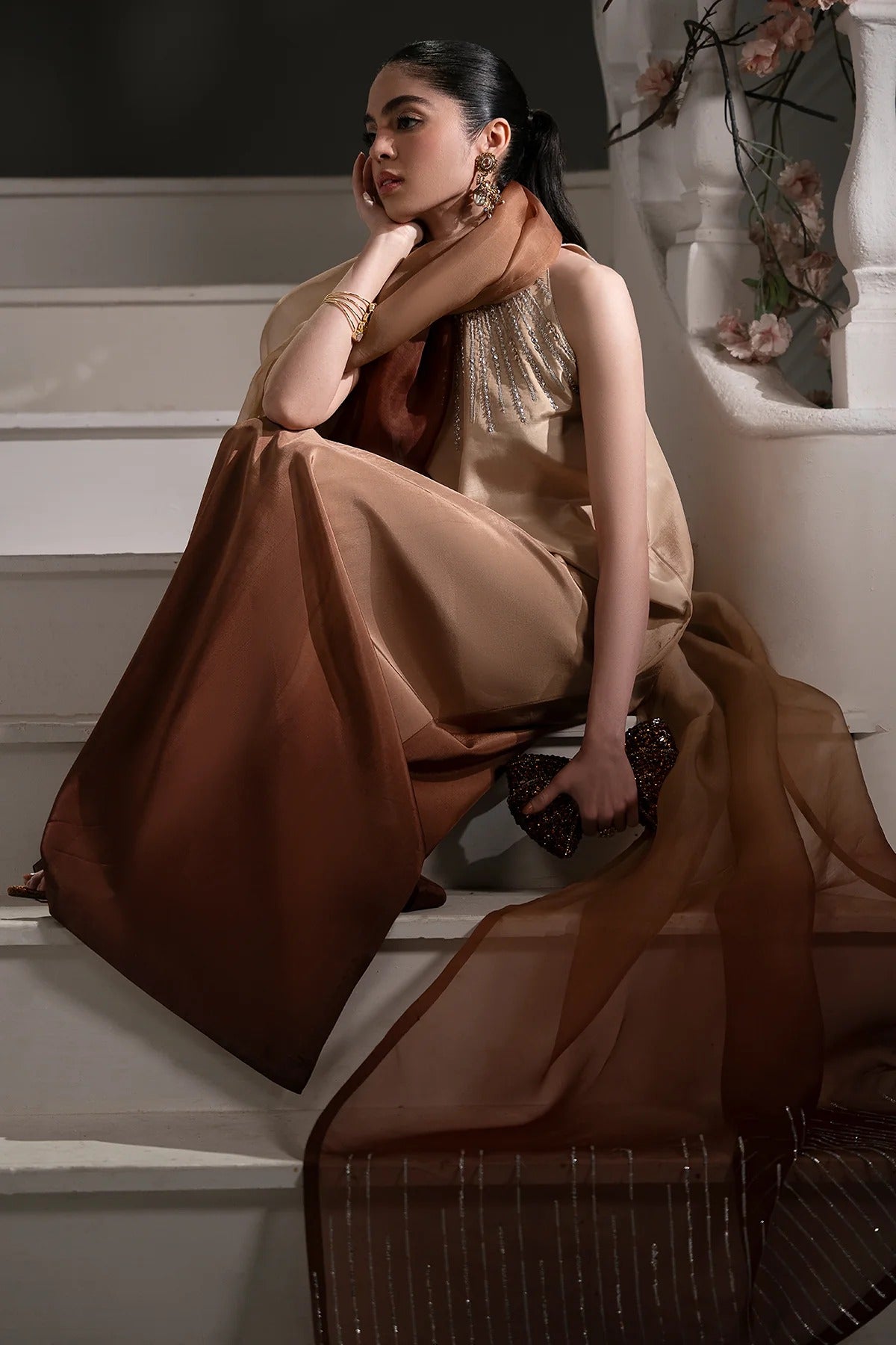 - Cut Line: Long Flared ombr'e gown with sleeves paired with ombr'e Organza Dupatta