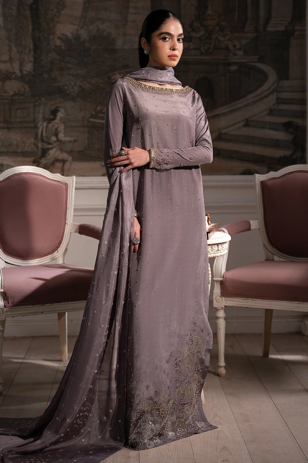 - Work Details: Intricately embellished on embroidered base