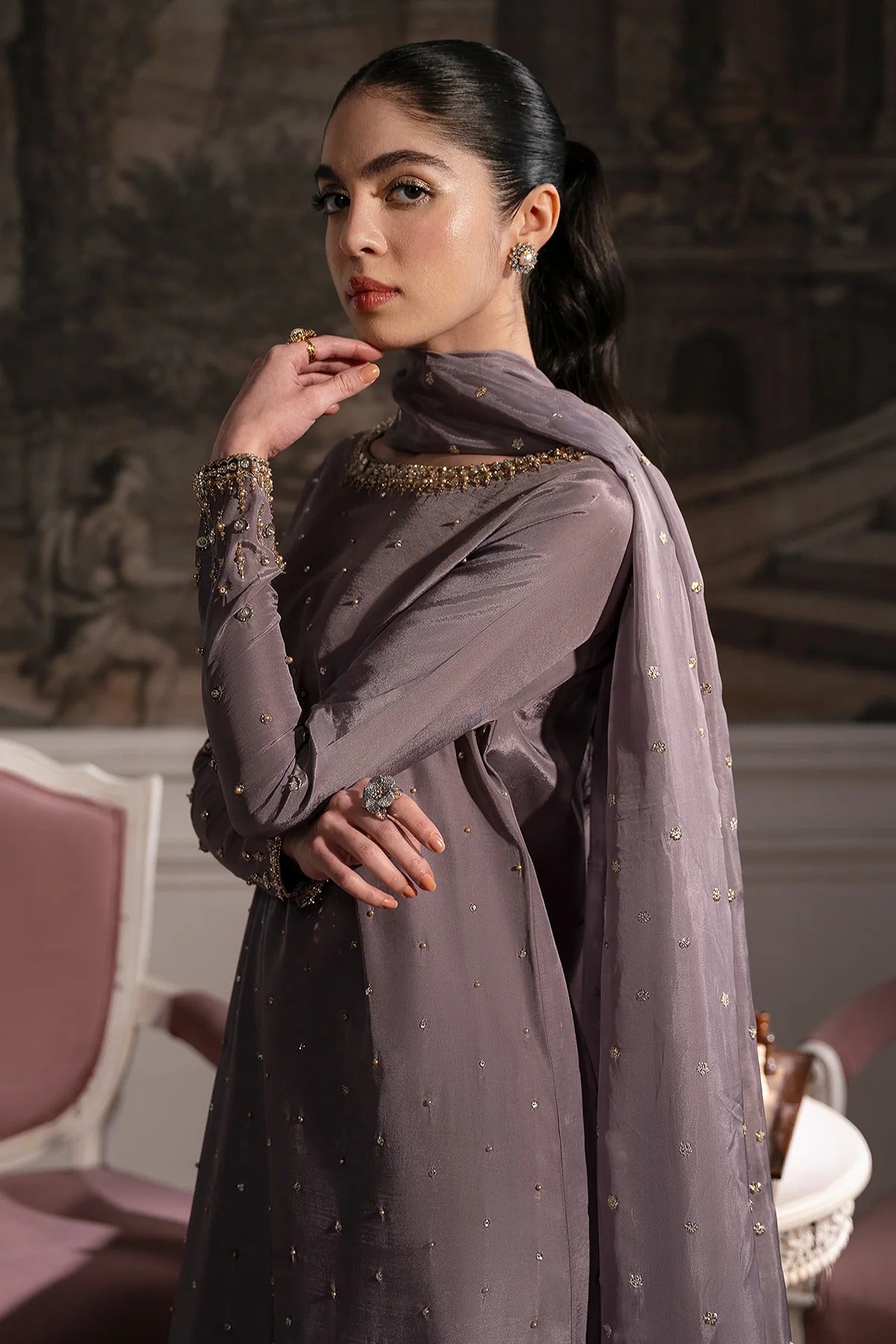 Lurex and sequin embroidery, enriched with intricate hand embellishments, showcasing exceptional craftsmanship and refined elegance