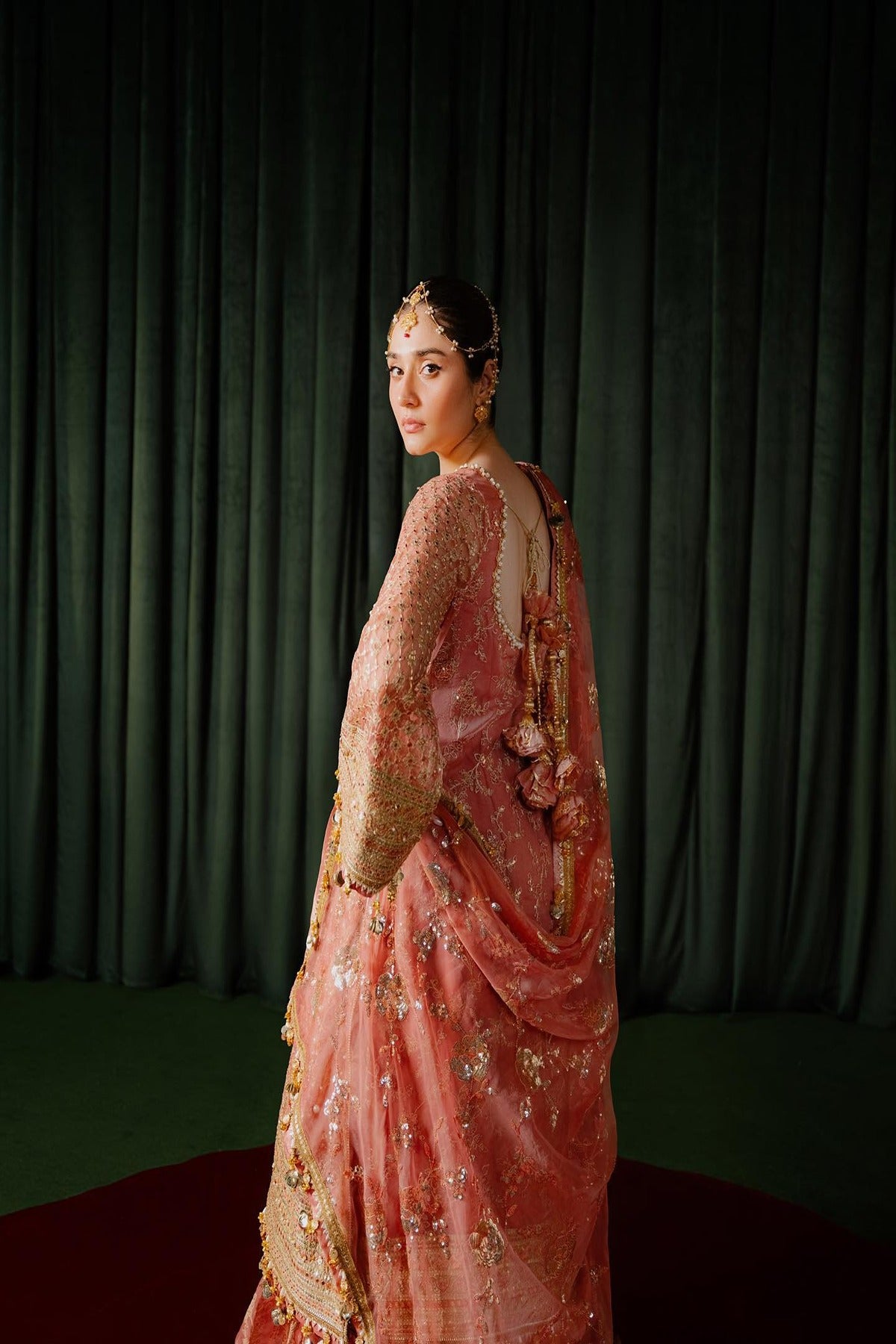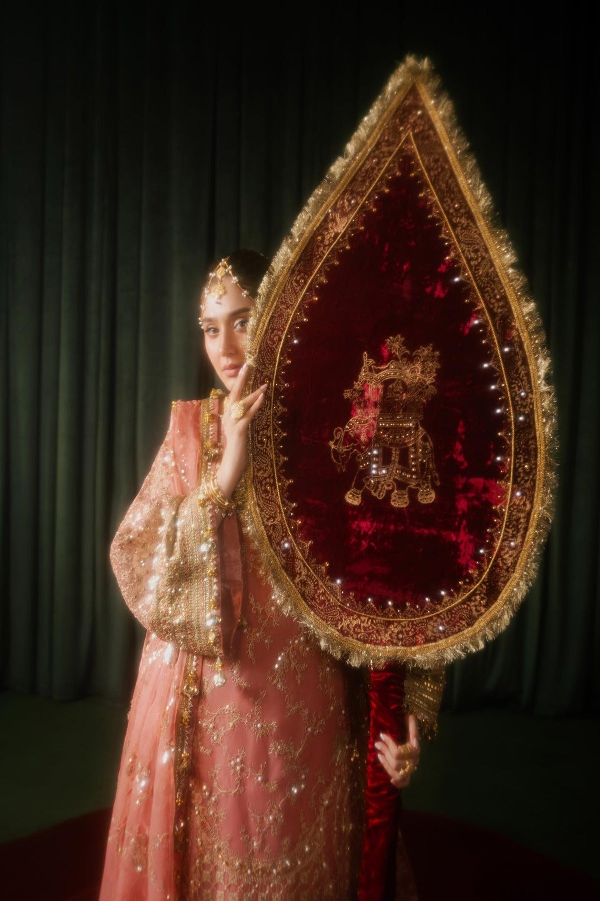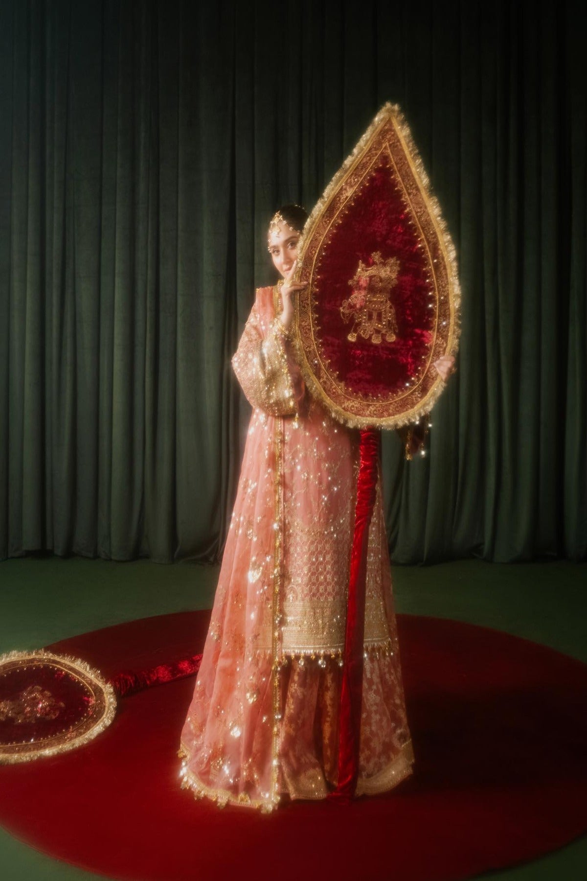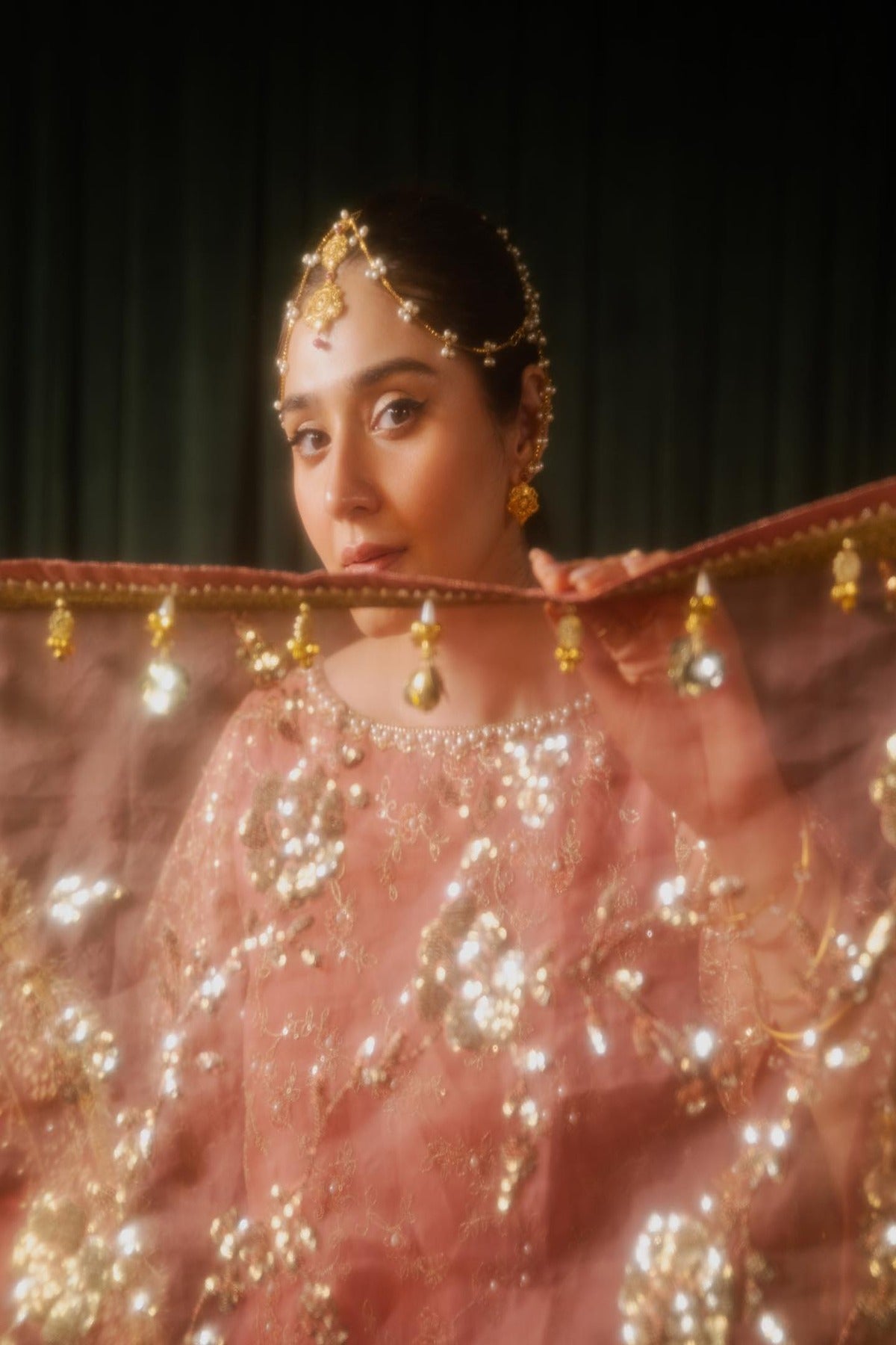 This pink organza ensemble exudes delicate artistry with its allover floral pattern and striking geometric border, echoed in the sleeves. Intricate thread and tilla embroidery, shimmering sequins, and panni details are elevated by hand-applied pearls, adding a radiant touch. The golden foil-printed gharara pants bring a subtle contrast to the soft pink hues, while the organza dupatta with its repeating motifs completes the look. "Guriya Rani" is a true showcase of grace.
