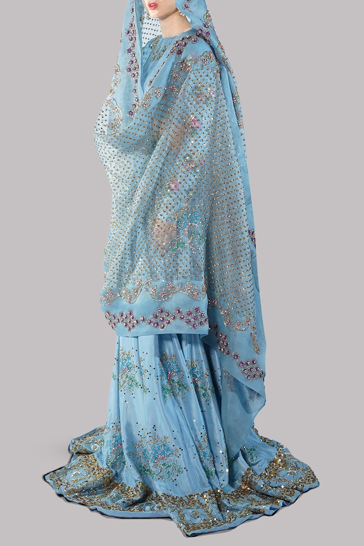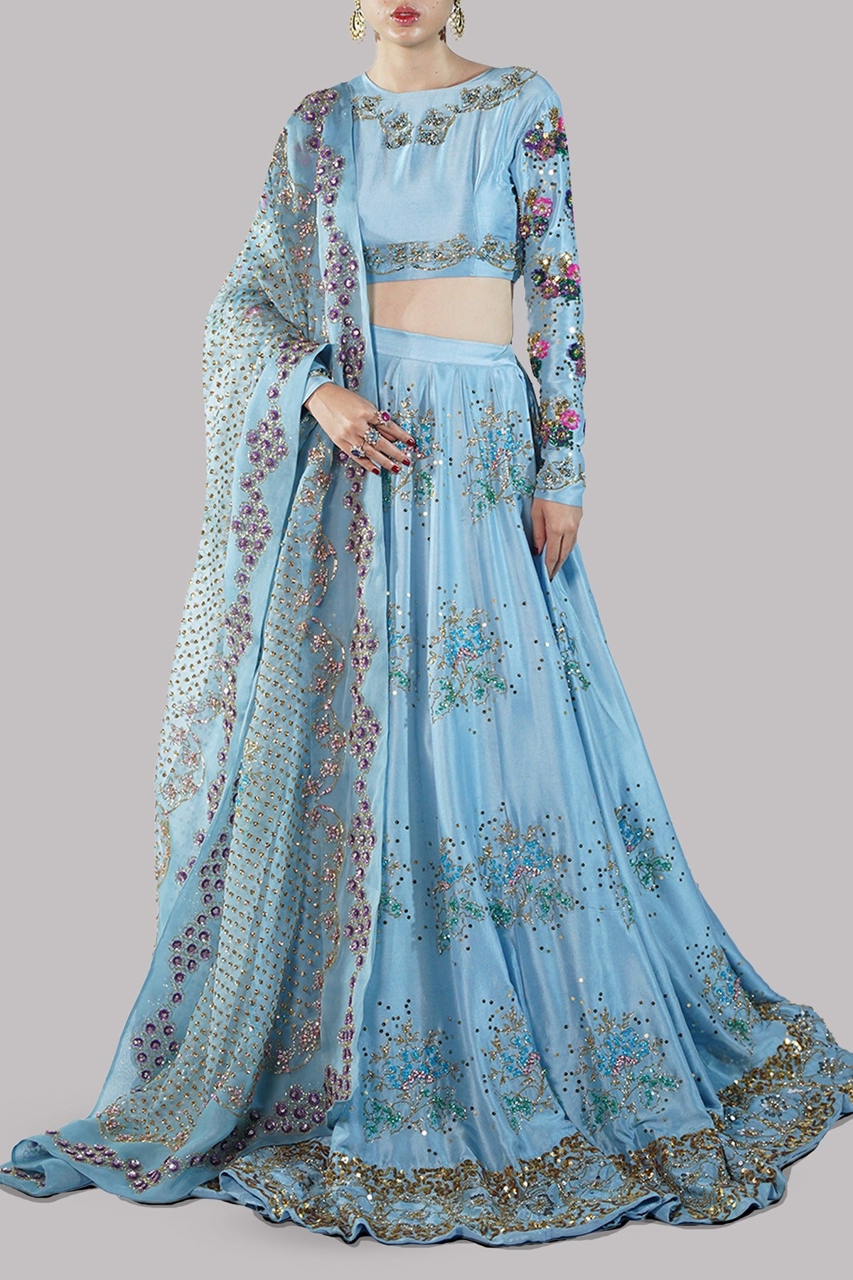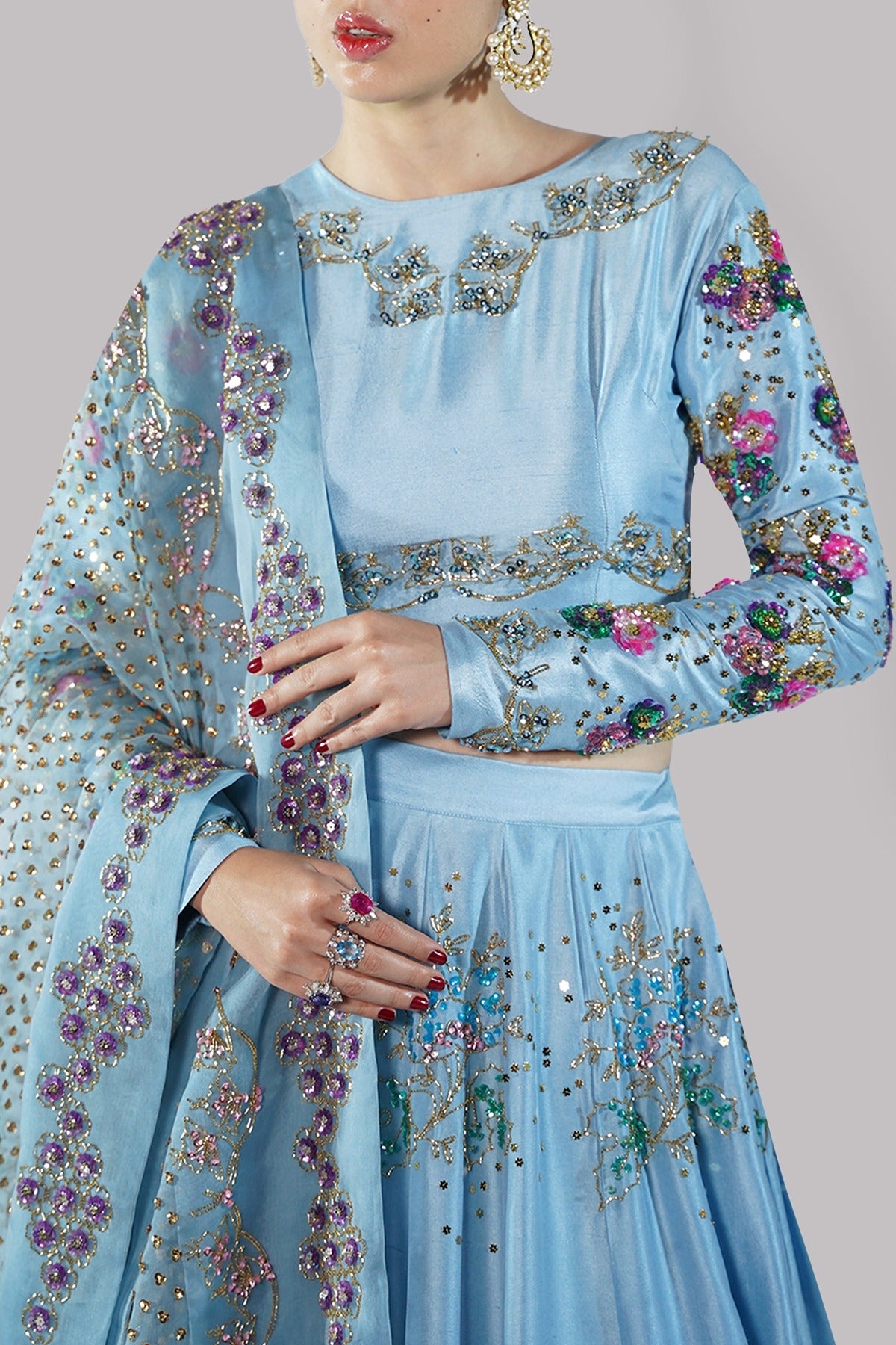 The Baltic Sea blouse is an exquisite display of couture craftsmanship, featuring a rich tapestry of sequin and gemstone-embellished sleeves that exude effortless luxury. The tailored silhouette is paired with a matching multi-hued lehenga, each pleat adorned with intricate embellishments that catch the light with every step. A sheer organza dupatta, meticulously detailed with ornate embellishments, completes this statement-making ensemble.