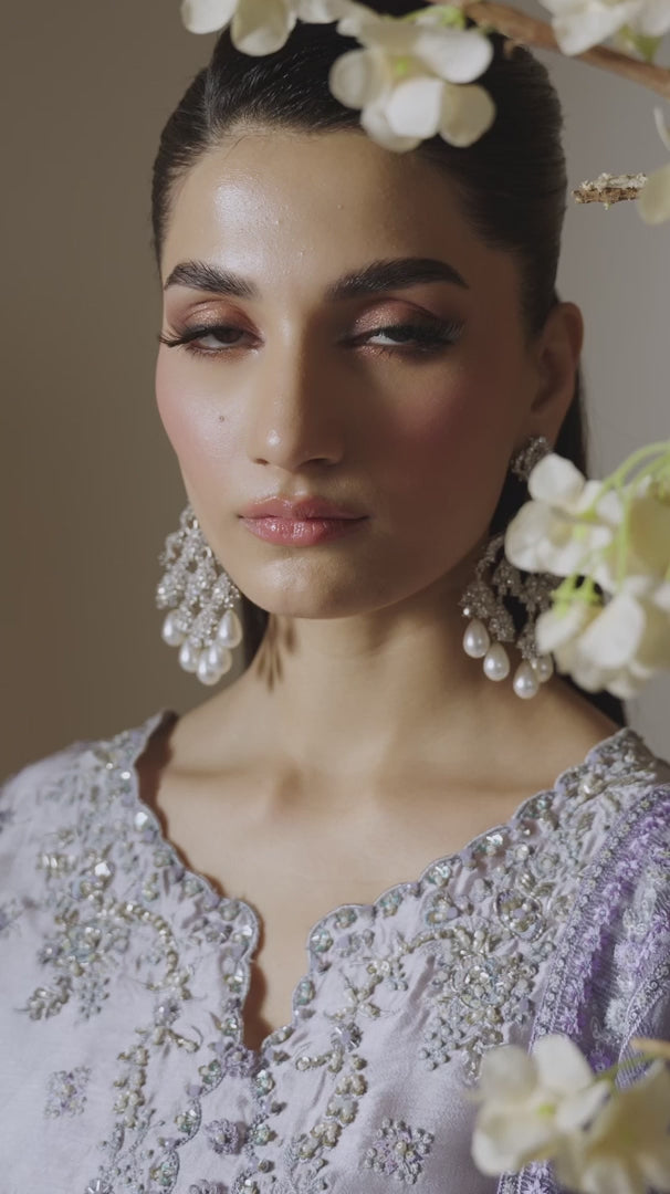 Elya - Elegance in every shimmer. Draped in a radiant silver, Elya features a sheesha silk shirt adorned with intricate floral embroidery, delicately enhanced with hand ample pearls and sequins on the neckline and sleeves for a refined sparkle. A flowing rocket net dupatta with finely embroidered borders and subtle sequin accents adds a gentle shimmer, perfectly complemented by straight-cut raw silk trousers for a polished, graceful finish. Timeless shine, effortlessly worn.