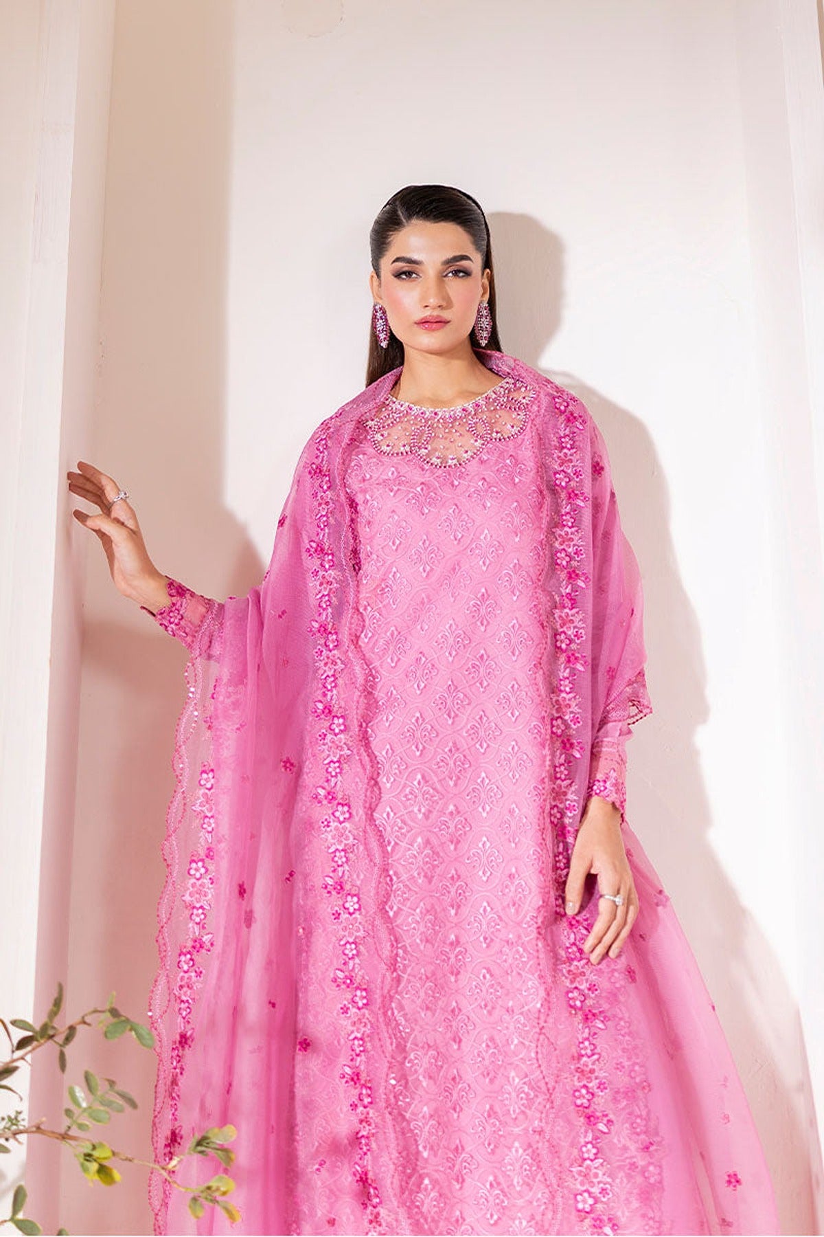The look is completed with a flowing rocket net dupatta, delicately embroidered with florals and kissed with sequin accents for a subtle shimmer. Straight-cut raw silk trousers bring balance and poise to the ensemble. A timeless expression of femininity and grace.