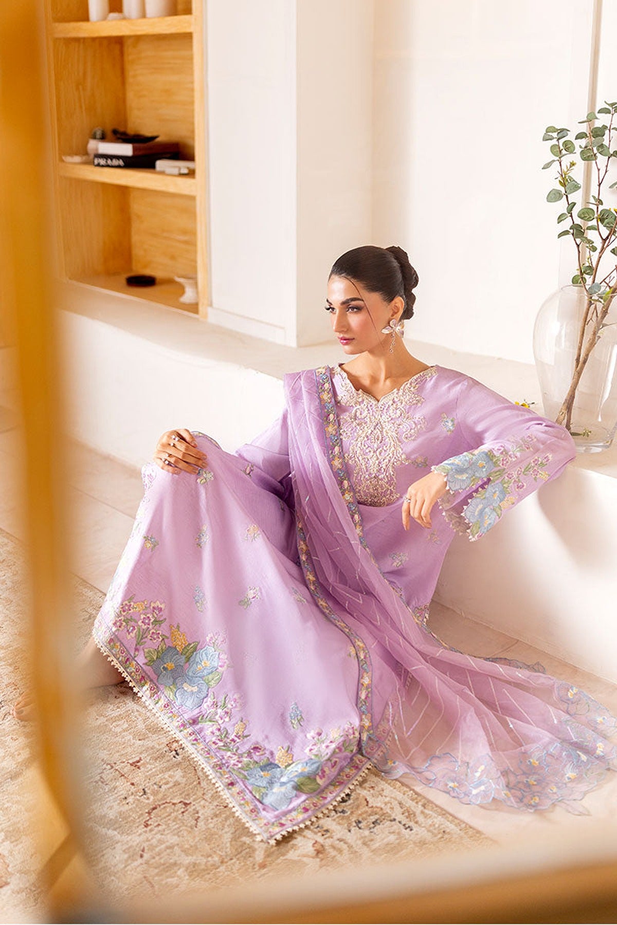 Serin - A whisper of elegance in lilac. Softly serene in tone, Serin features a raw silk shirt beautifully adorned with delicate floral threadwork and subtle hand ample sequin embellishments - striking the perfect balance between grace and sophistication. The ensemble is paired with organza dupatta, detailed with embroidered motifs and a scalloped floral border that adds a layer of ethereal charm. Straight-cut raw silk trousers complete the look with a sleek and polished finish. Romantic, refined, and effortlessly timeless.