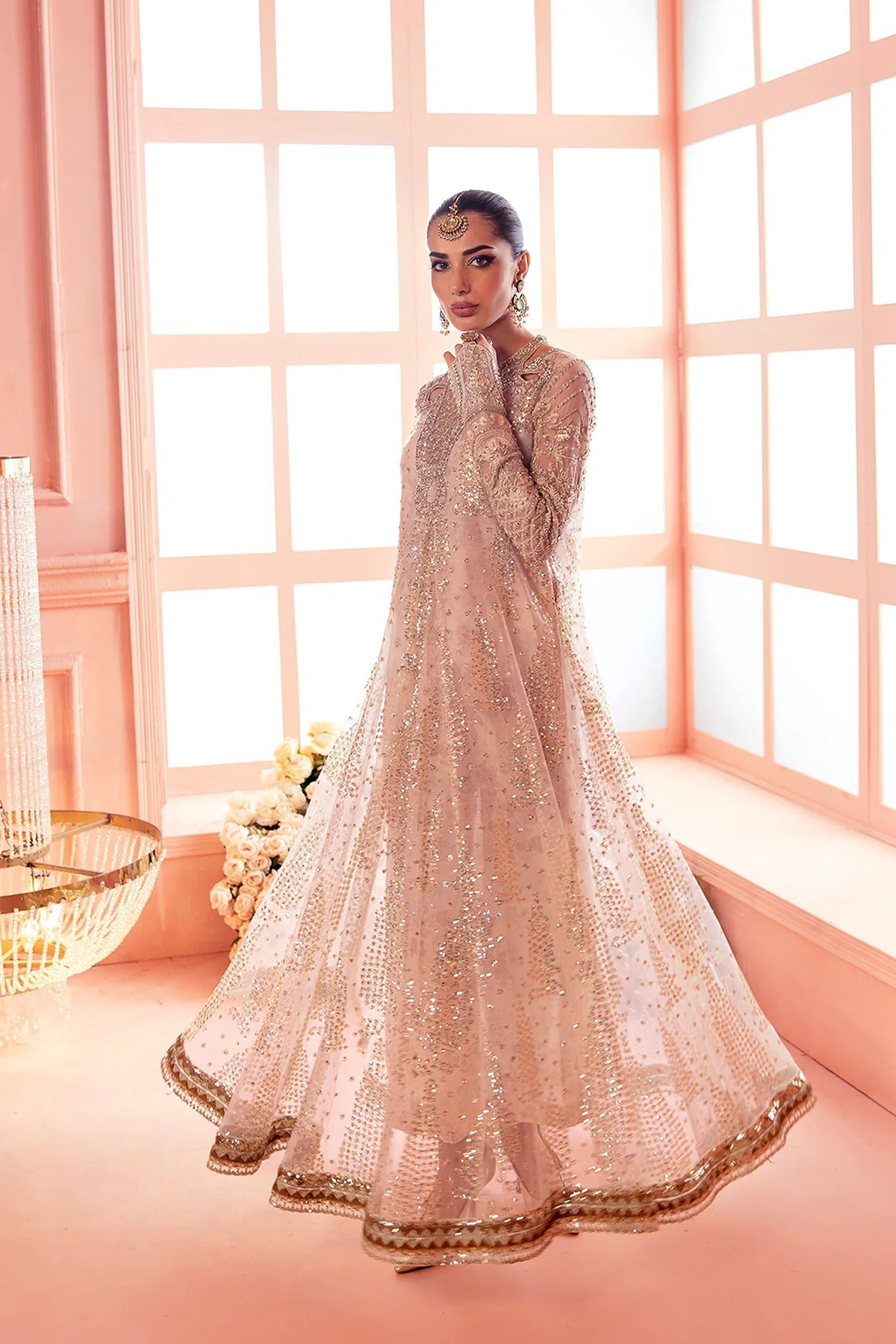 Sitaara is an exquisite pishwas made out of net fabric which features beautiful printed details on the raw-silk slip and pants. The pishwas showcases gleaming embellishments all over with the worked neckline, fitted sleeves and intricate border detailing. A stunning silhouette which can be styled to any event for the extra charm.