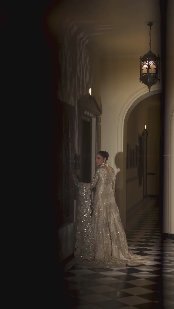 In a champagne tissue basis that is finely embroidered with threadwork in shades of pink, silver, and gold, Lila exudes classic elegance. The sparkling bodice and sleeves are embellished with exquisite pearls and crystals that brilliantly reflect light. With its opulent blush pink border, the dupatta stands out and exudes a delicately feminine appeal. With a structured PK raw silk lehnga, this outfit is a mix of royal history and modern femininity.