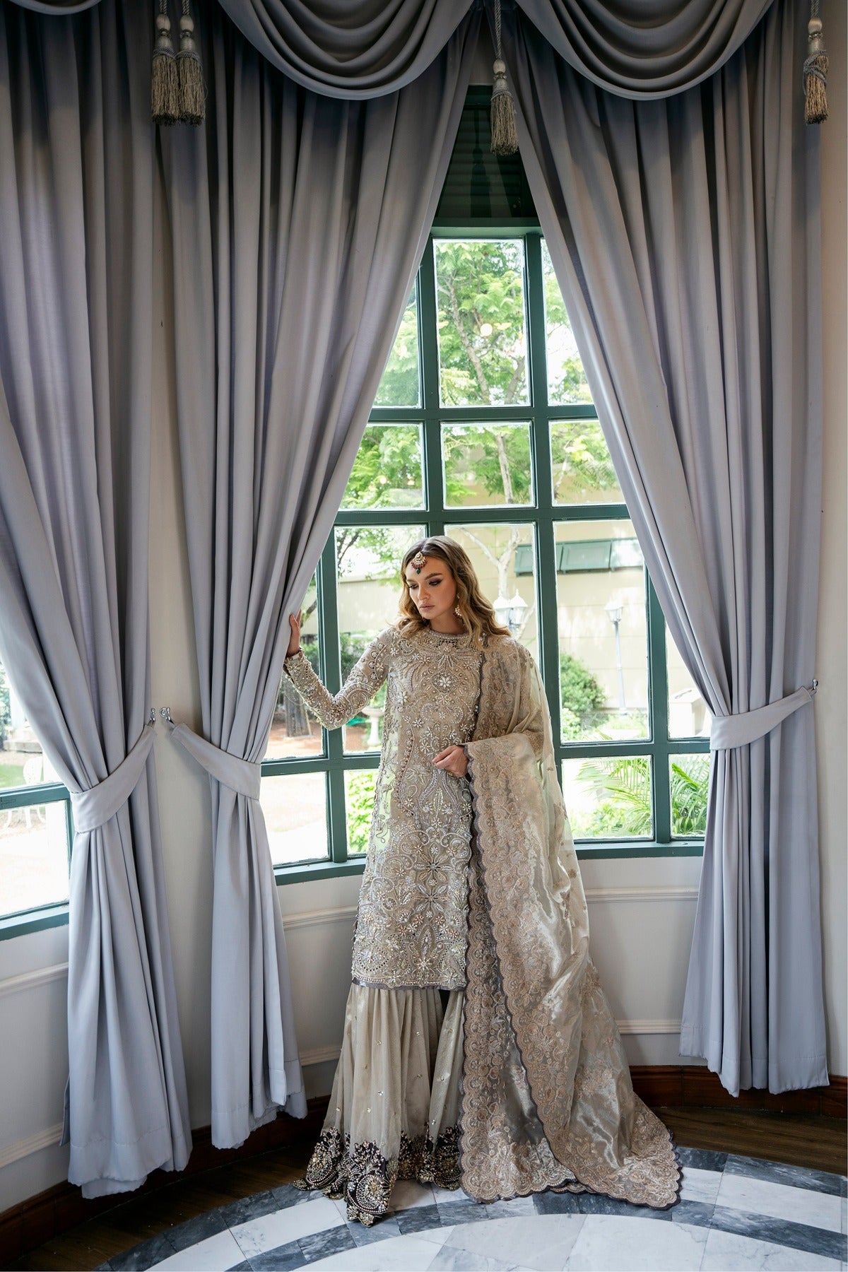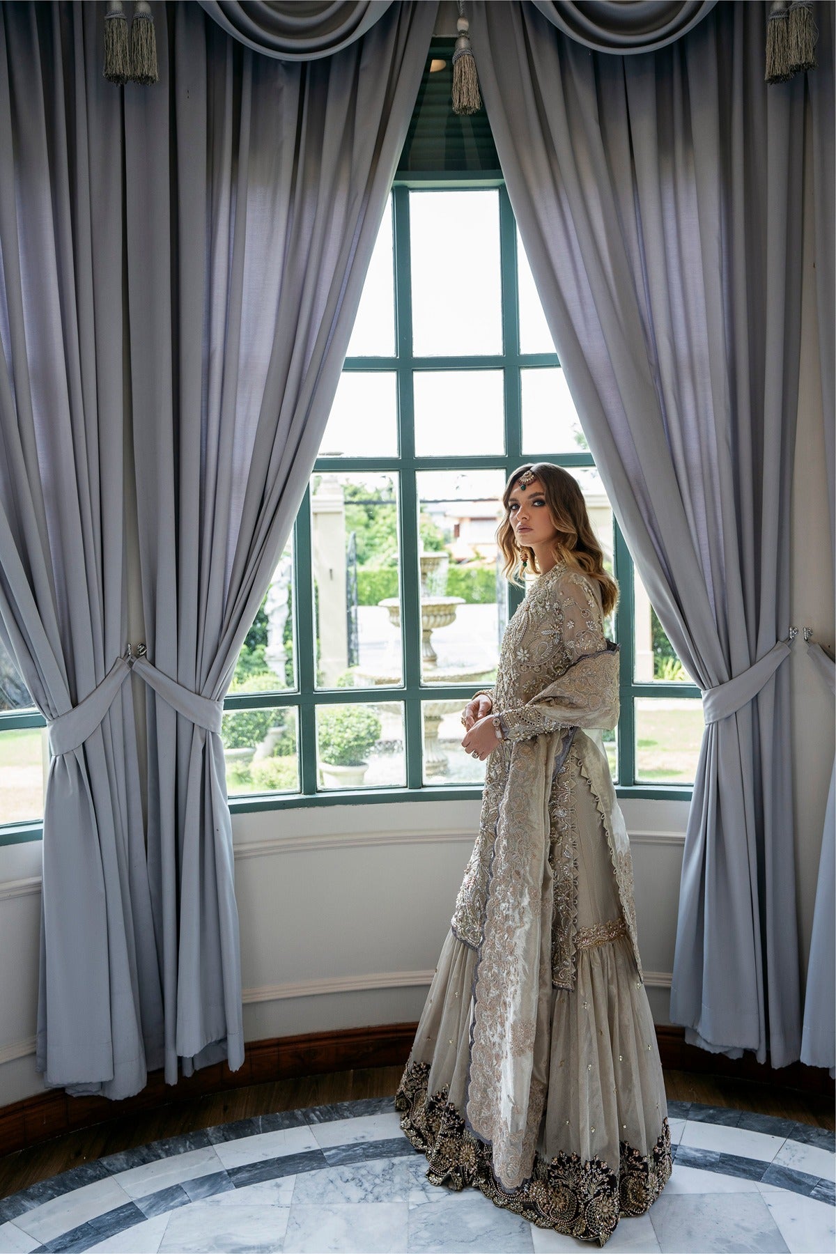 Made from opulent tissue fabric and accessorized with a delicate net dupatta, Ayra is a charming and exquisite costume from the ALARA'25 line. The ensemble has a luxurious appearance because to its superb needlework in delicate, golden tones and its elaborate beadwork that gleams in the sunlight. The net dupatta drapes gracefully with a delicate border that unifies the entire set, and the lehenga flows exquisitely, lending the ensemble a regal feel. The overall color scheme, a light champagne gold, offers the outfit a timeless appeal that is ideal for formal occasions and weddings.