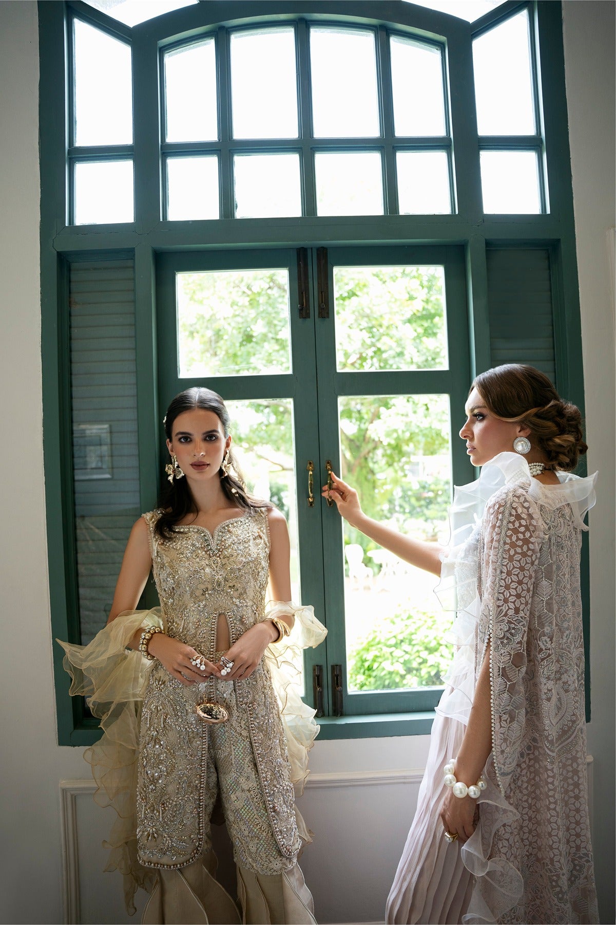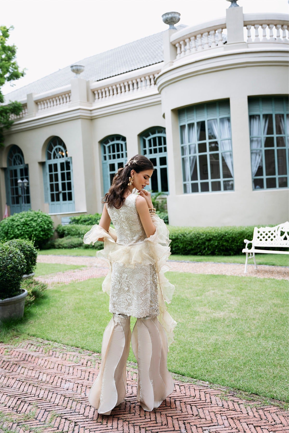 An ethereal three-piece set, Fifi is made of translucent organza and decorated with delicate hand-beadwork in pearl and gold hues. Delicate floral designs with subtle glistening sequin and bead accents adorn the front-open shirt. This ensemble seamlessly integrates classical elegance with a bold, contemporary silhouette when paired with statement wave-cut trousers and a ruffled dupatta. Fifi is elegant, glamorous, and blatantly feminine, making her perfect for fancy parties and small get-togethers.