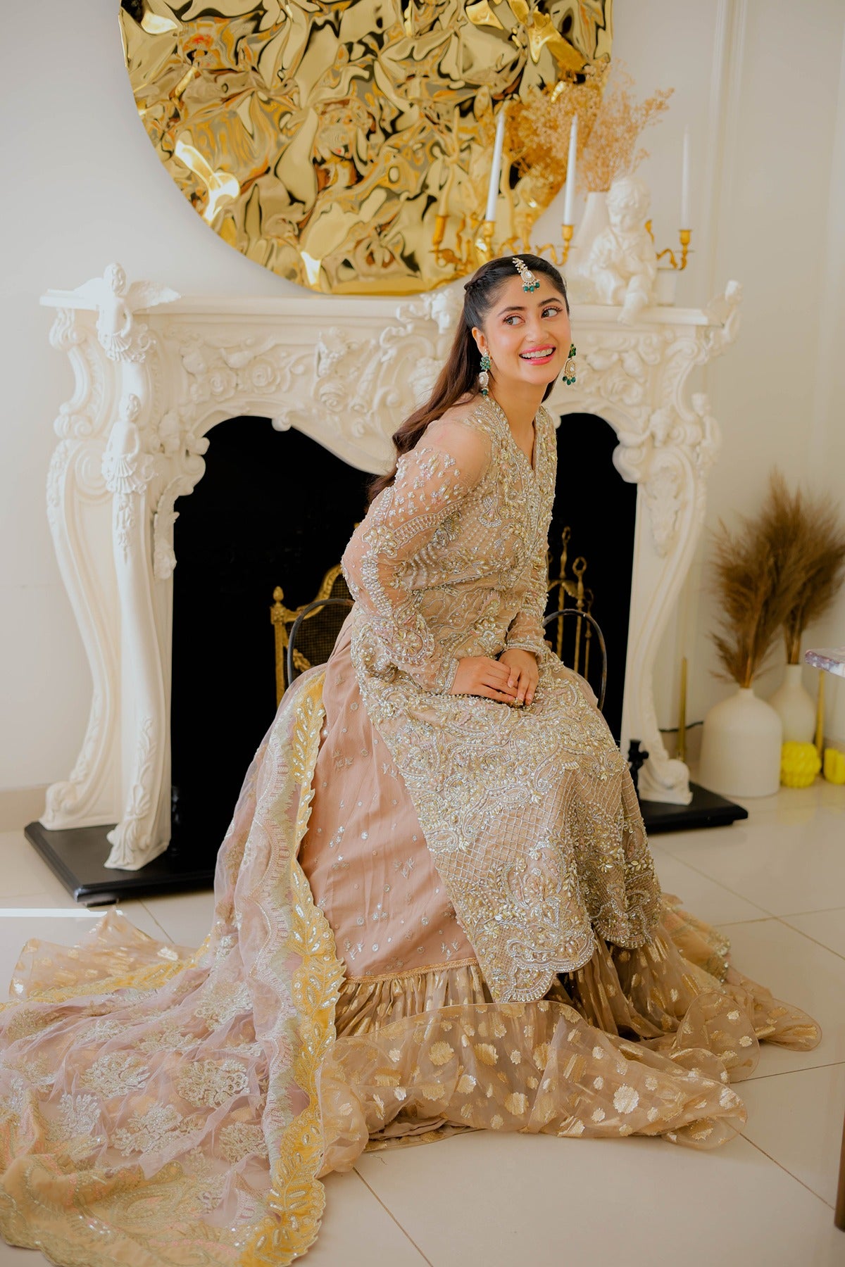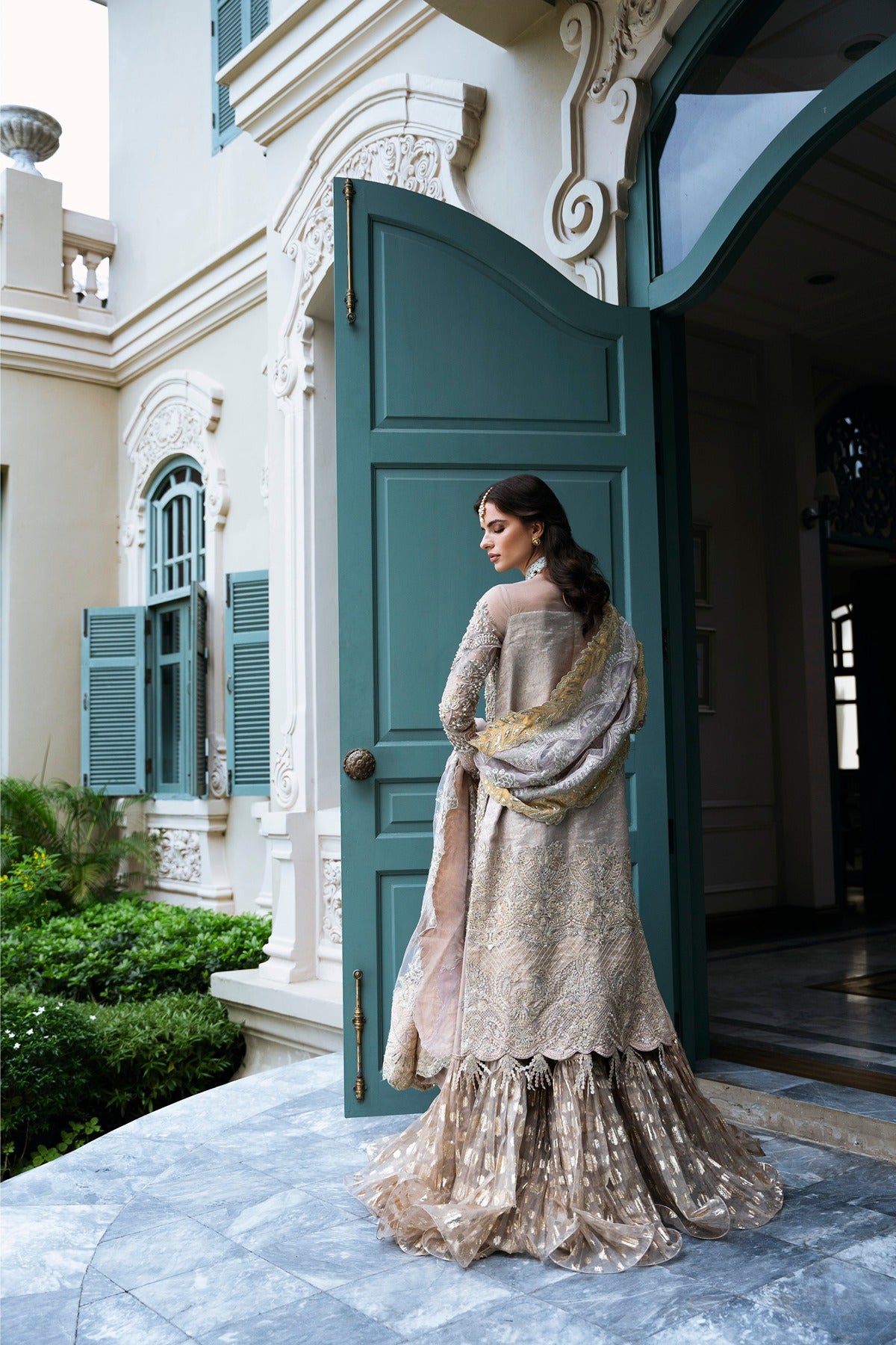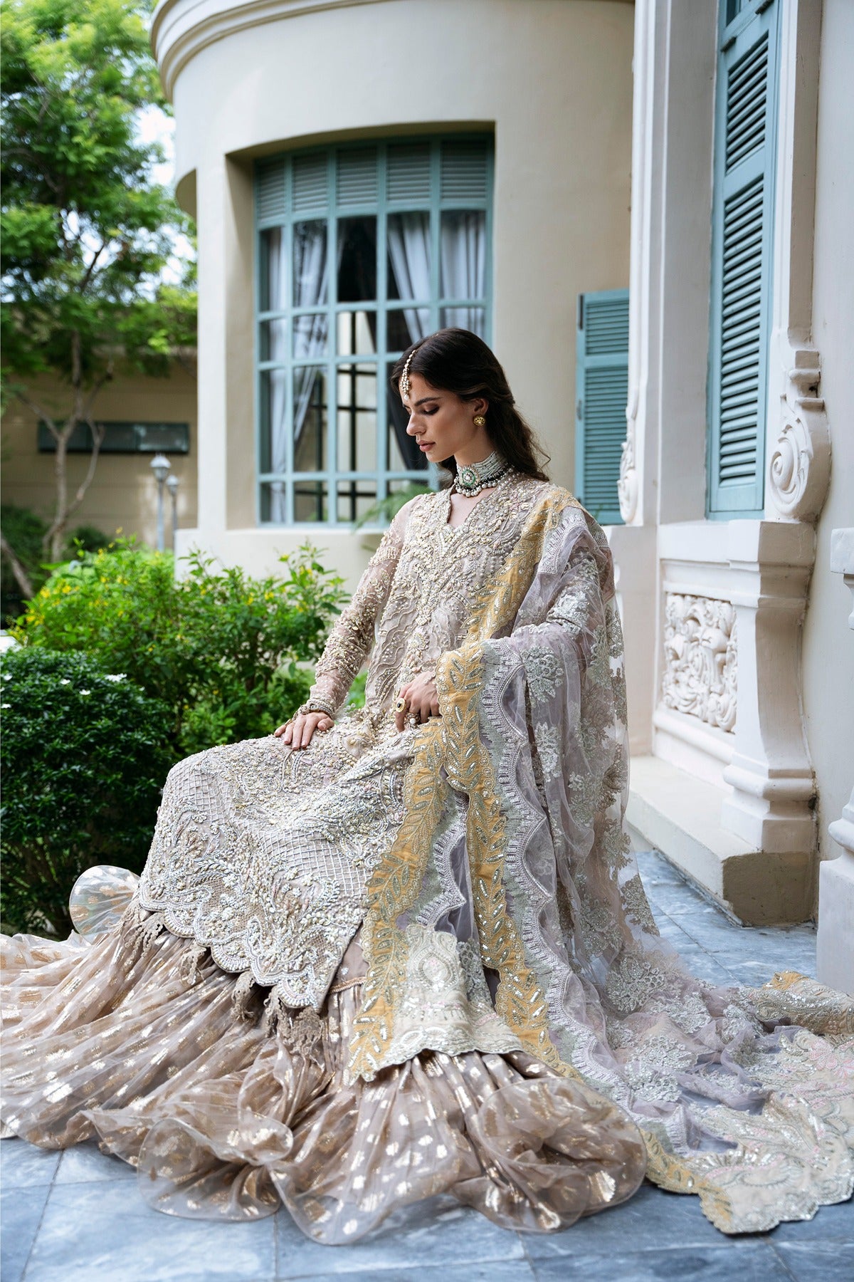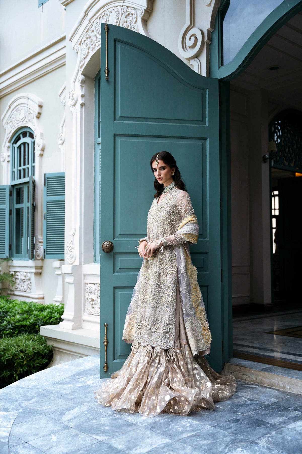 The stunning three-piece Peony set from the ALARA'25 collection blends sophistication and grace. Luxurious jamawar raw silk is used to create the lehenga, which has elaborate handwork in subtle gold and silver hues. A gorgeously embroidered organza blouse completes the ensemble, which seamlessly combines traditional and modern features. The ensemble is finished with a gorgeous net dupatta that has a golden border and intricate flower embroidery, giving it a regal feel. The gentle pastel tones of this suit make it ideal for large weddings or formal parties, giving it a really ethereal appearance.