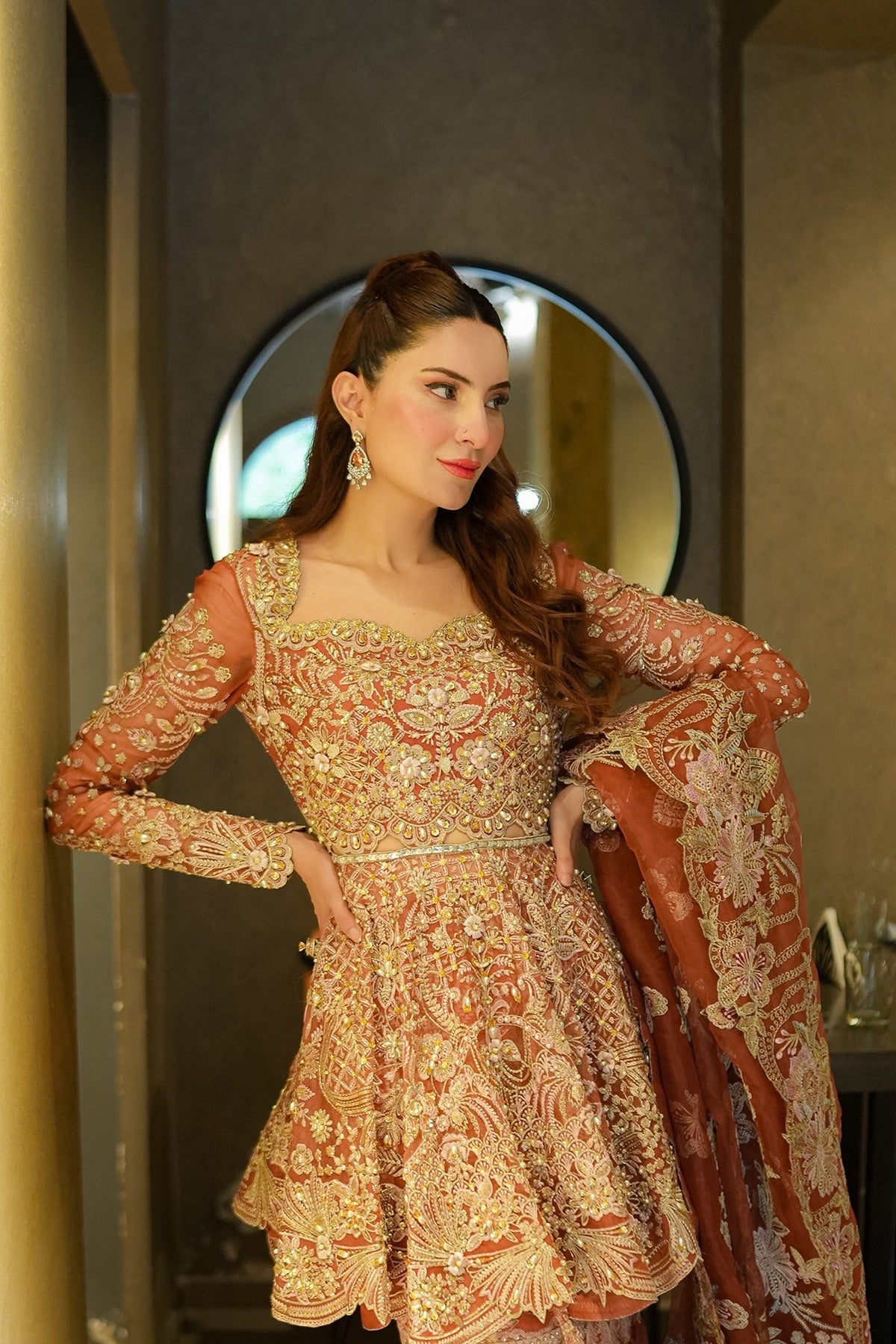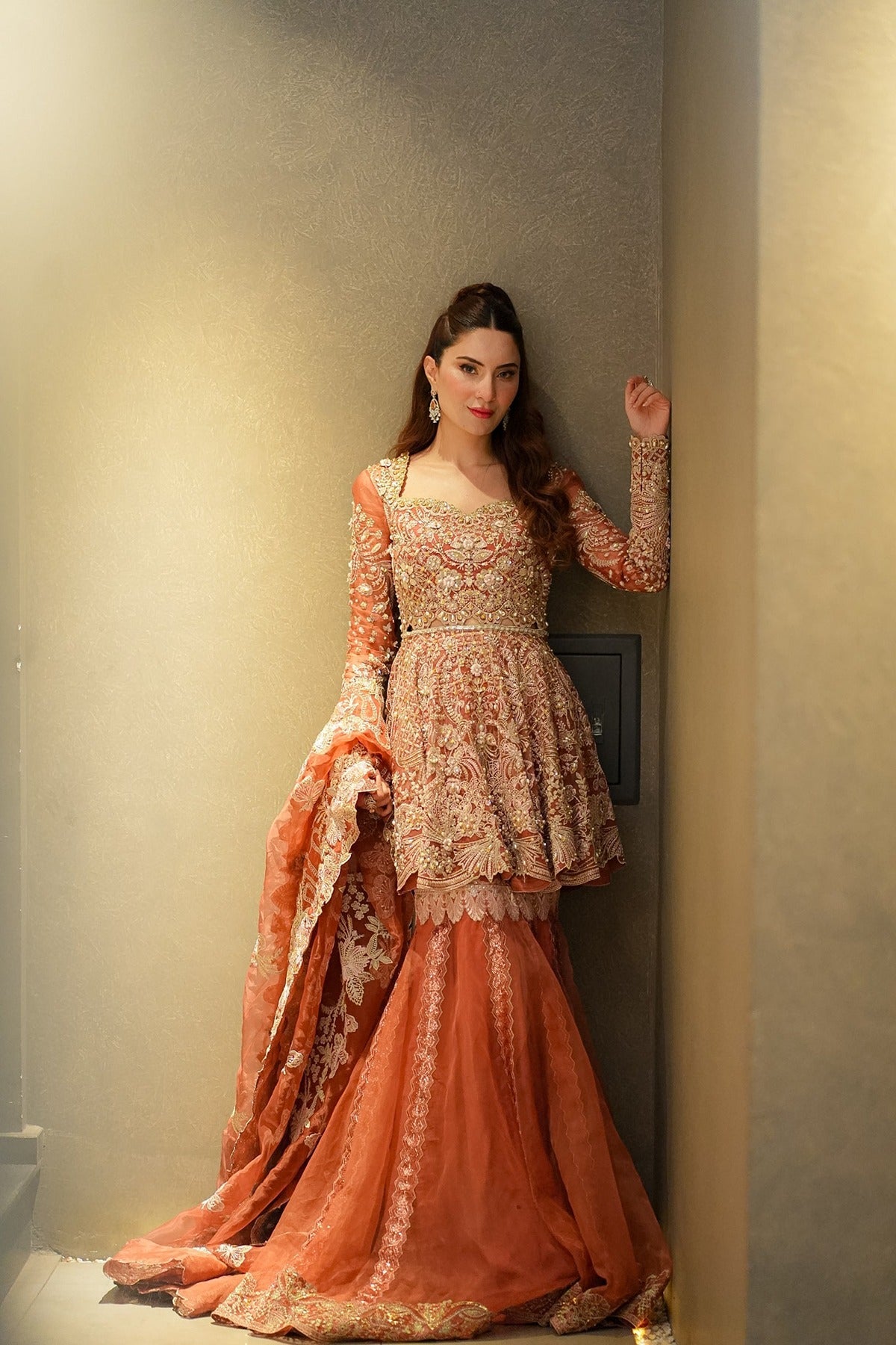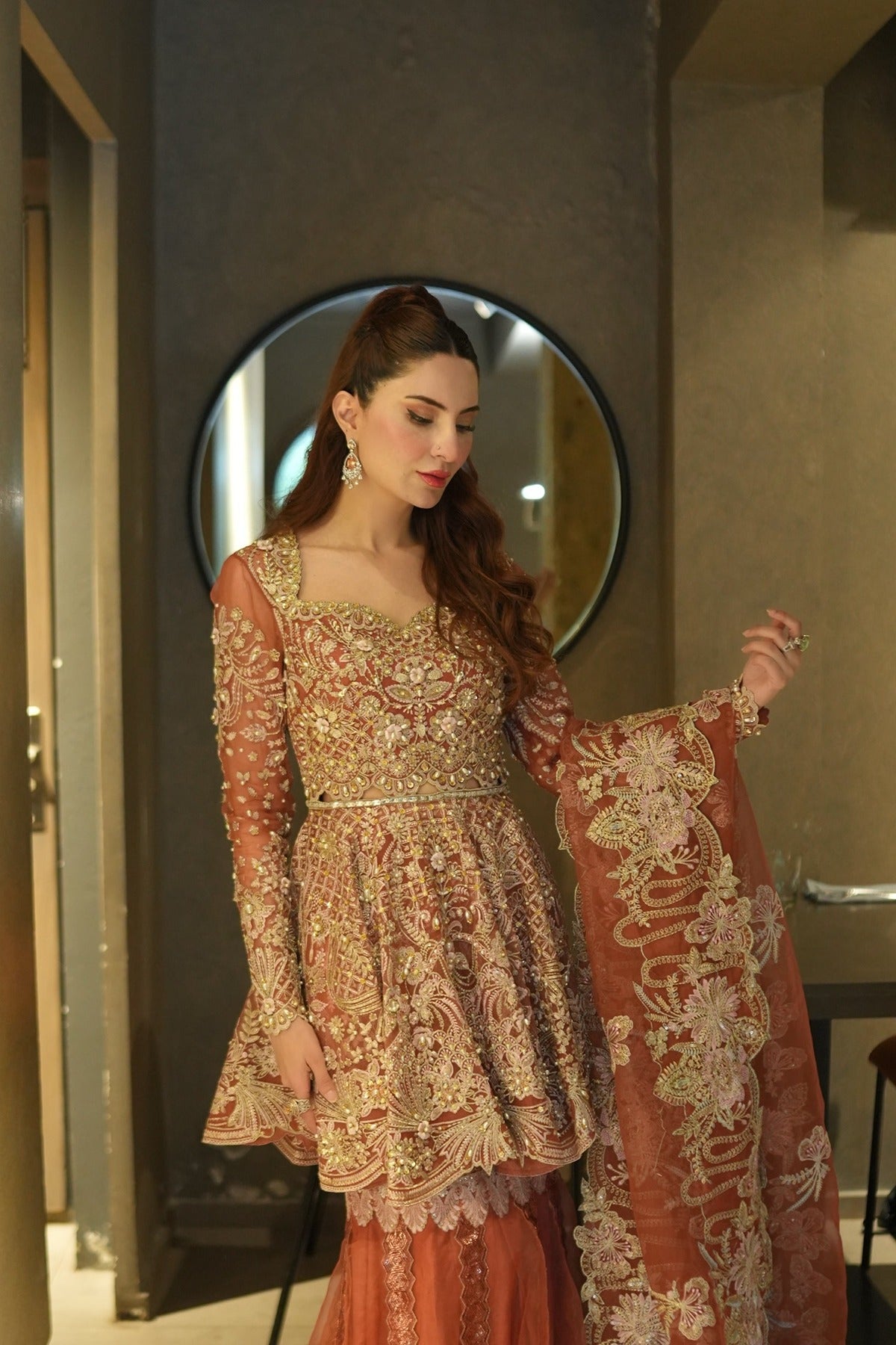 This magnificent three-piece set, called Cammi, is made of luxurious organza in a striking shade of terracotta rose. The shirt has gorgeous floral and geometric handwork in gold, ivory, and soft pink tones, all delicately adorned on the sheer long sleeves. When combined with a finely embroidered sharara and an organza dupatta embellished with intricate floral vines, the short flared silhouette lends a contemporary touch. This attire is ideal for festive soirées or intimate weddings since it finds the perfect combination of elegance and grandeur.