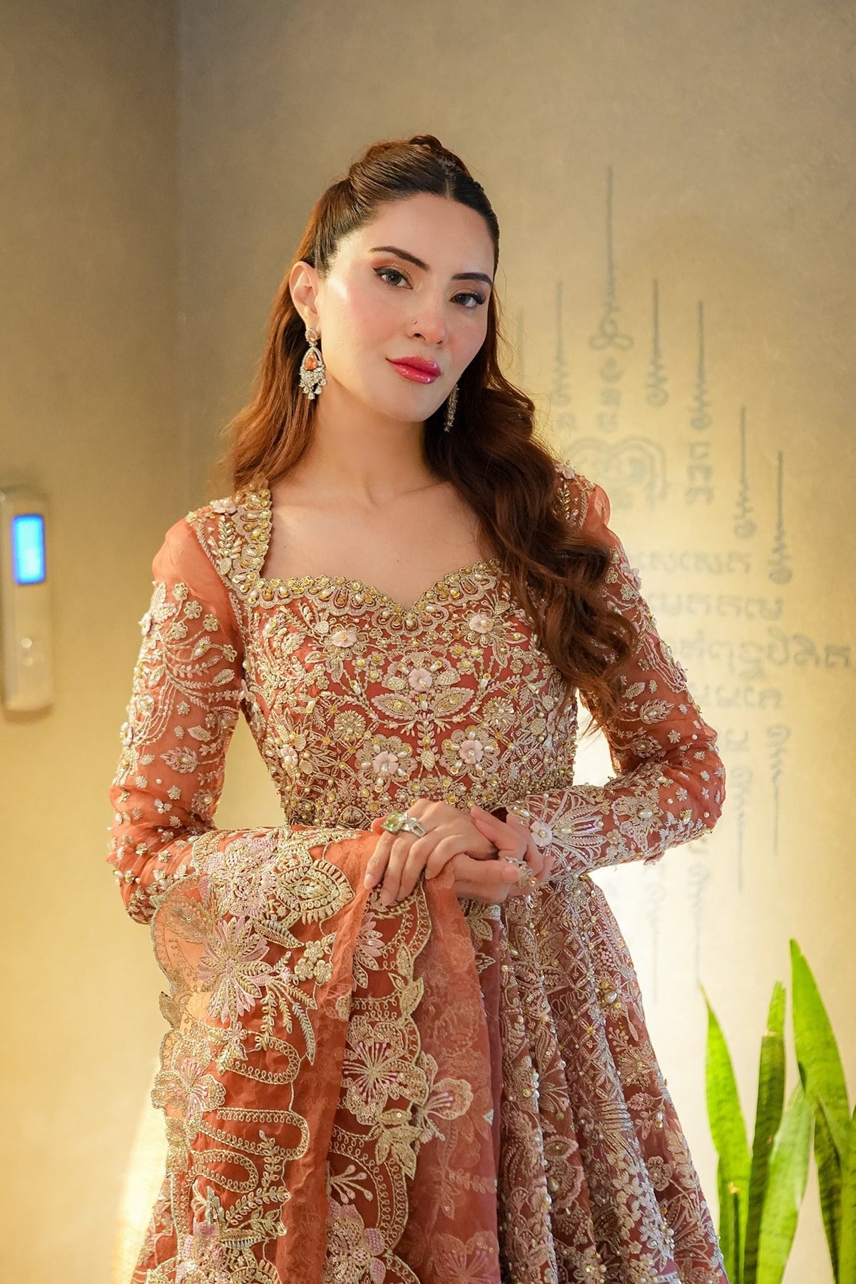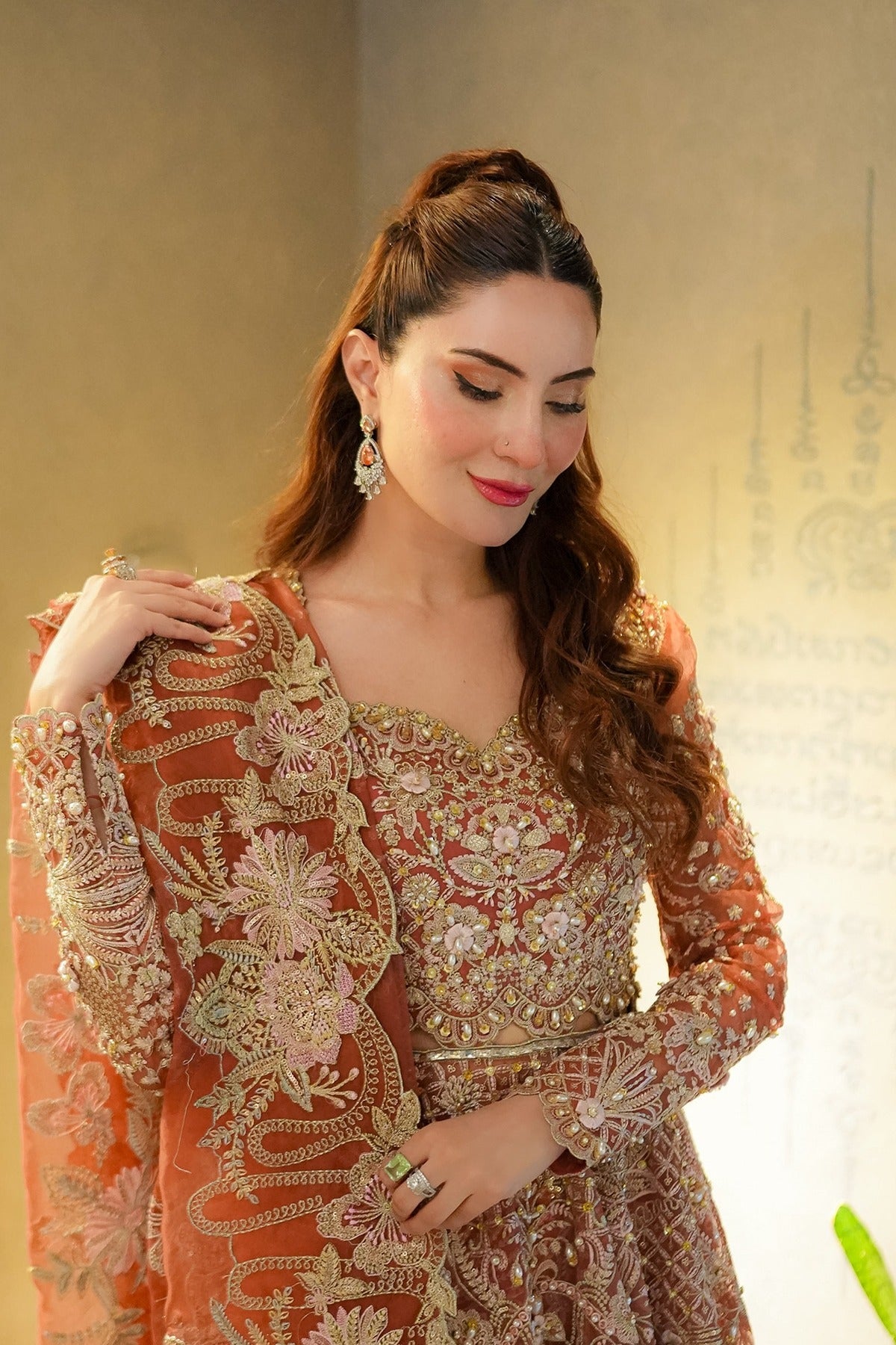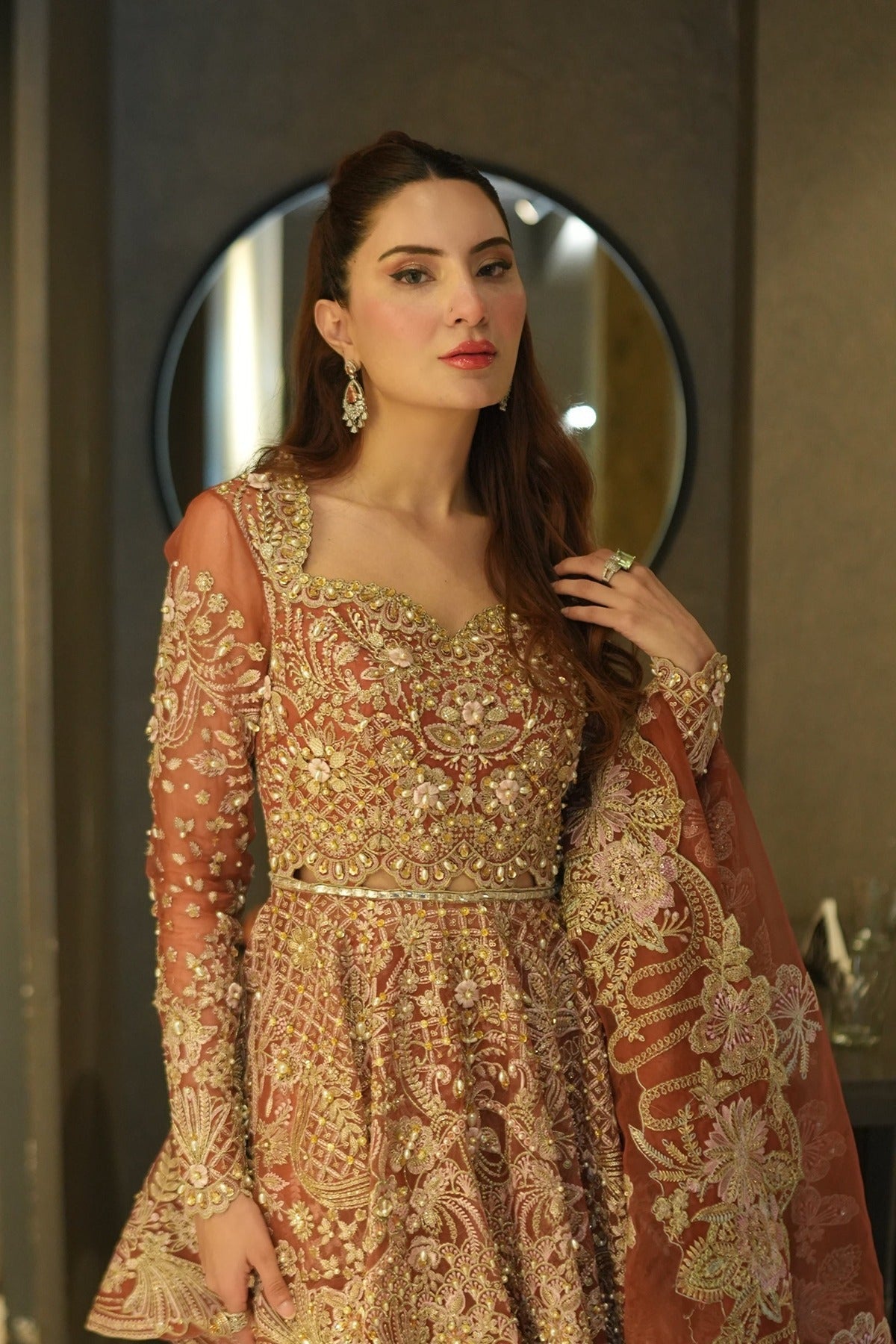 This magnificent three-piece set, called Cammi, is made of luxurious organza in a striking shade of terracotta rose. The shirt has gorgeous floral and geometric handwork in gold, ivory, and soft pink tones, all delicately adorned on the sheer long sleeves. When combined with a finely embroidered sharara and an organza dupatta embellished with intricate floral vines, the short flared silhouette lends a contemporary touch. This attire is ideal for festive soirées or intimate weddings since it finds the perfect combination of elegance and grandeur.