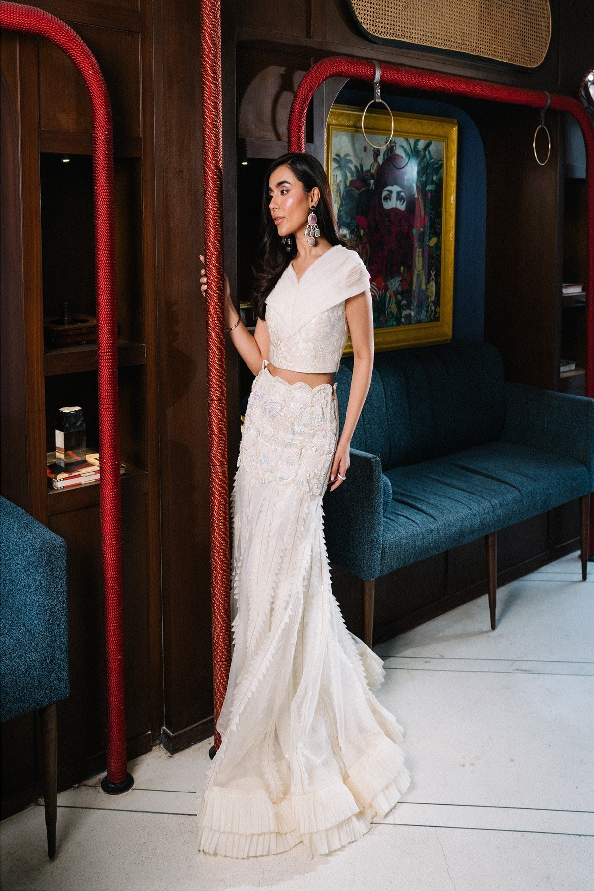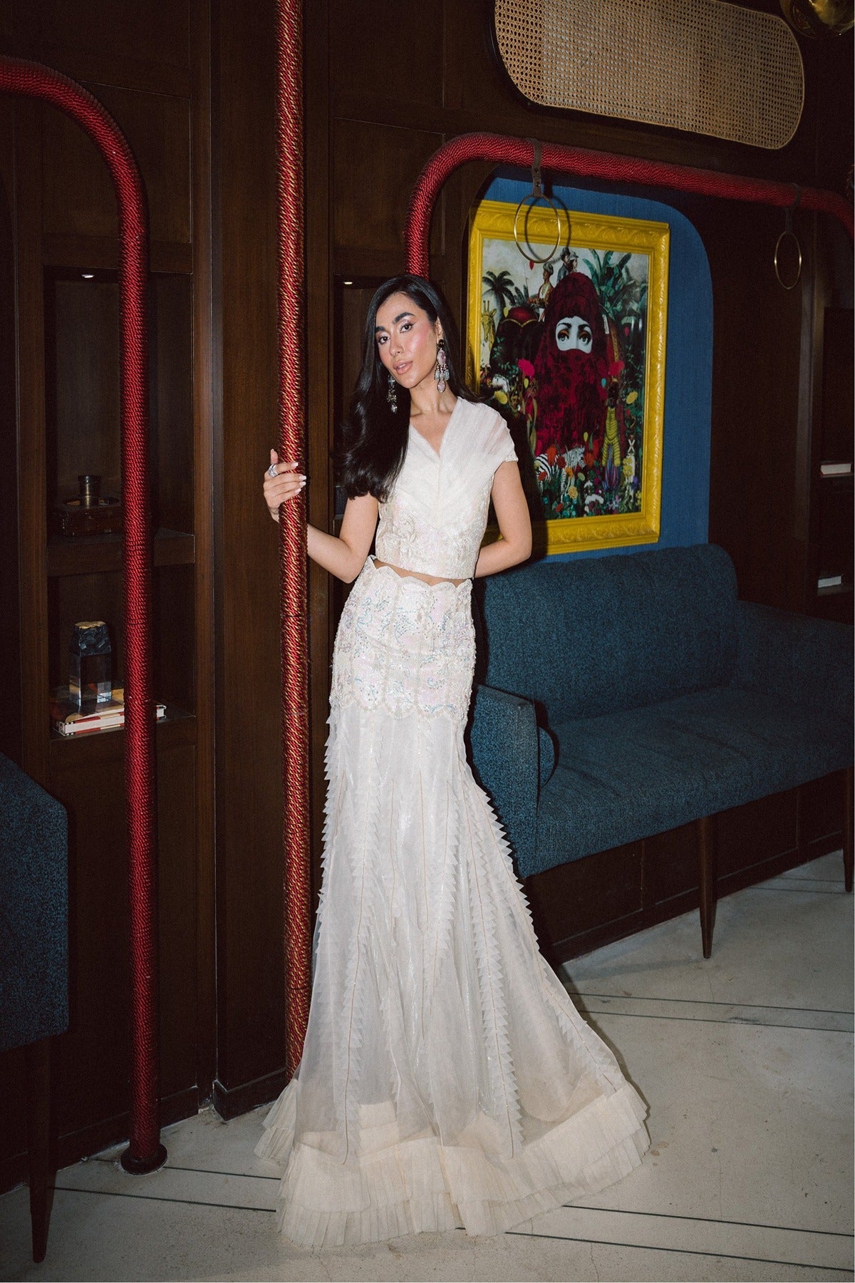 This ivory organza suit, which is ageless and epitomizes sophistication, exudes sheer beauty. The airy organza fabric has a delicate, dreamlike look, and the outfit’s adjustable design allows for optional sleeves to suit your taste. It is the ideal color for Eid celebrations or formal events since it is pure white and radiates elegance and composure. This gorgeous ensemble makes a statement at any event by fusing elegance and simplicity.