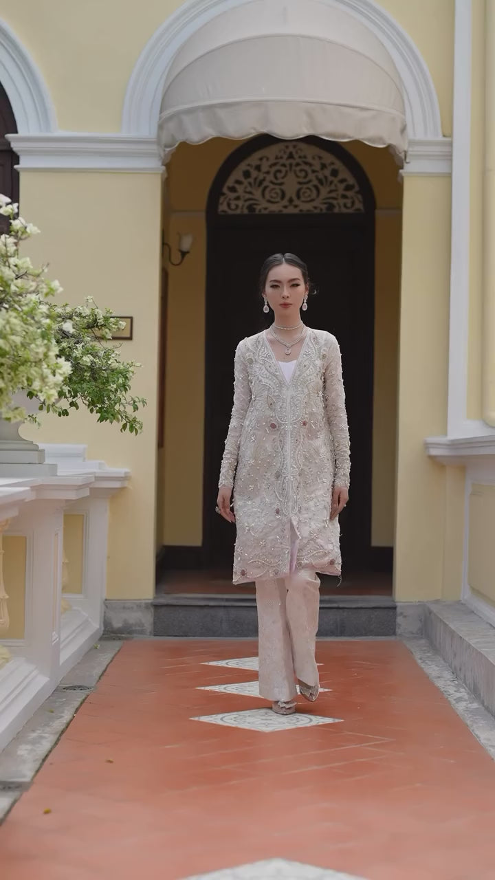 This stylish three-piece costume consists of a finely embroidered blouse, a matching slip, and slim slacks made of printed cotton net fabric. The shirt’s delicate embroidery provides a sumptuous and festive touch, while the soft, breathable cotton net ensures comfort and elegance. The light and breezy fabric makes it ideal for warmer weather while still suited for formal or semi-formal events. This set combines current elegance with traditional craftsmanship, making it excellent for celebratory parties, banquets, and weddings.