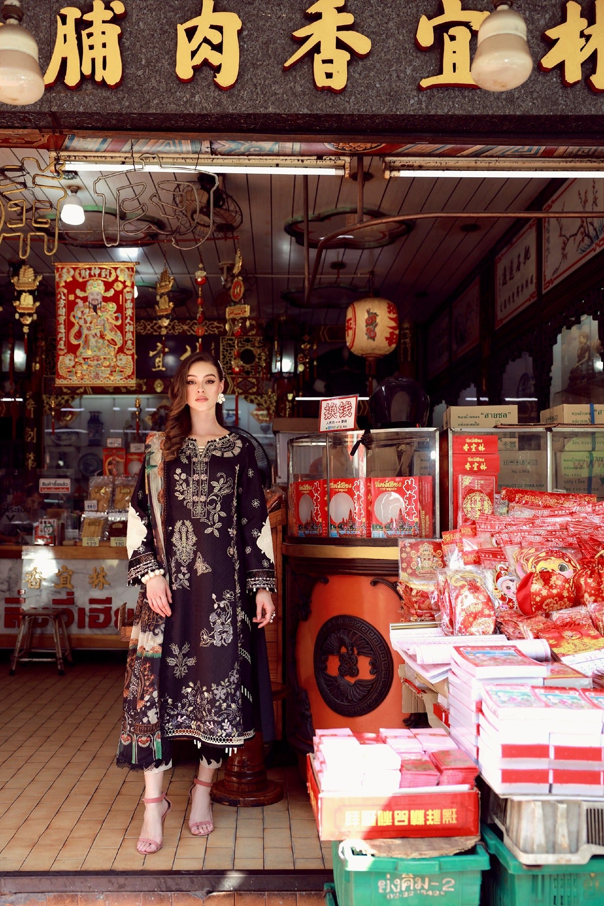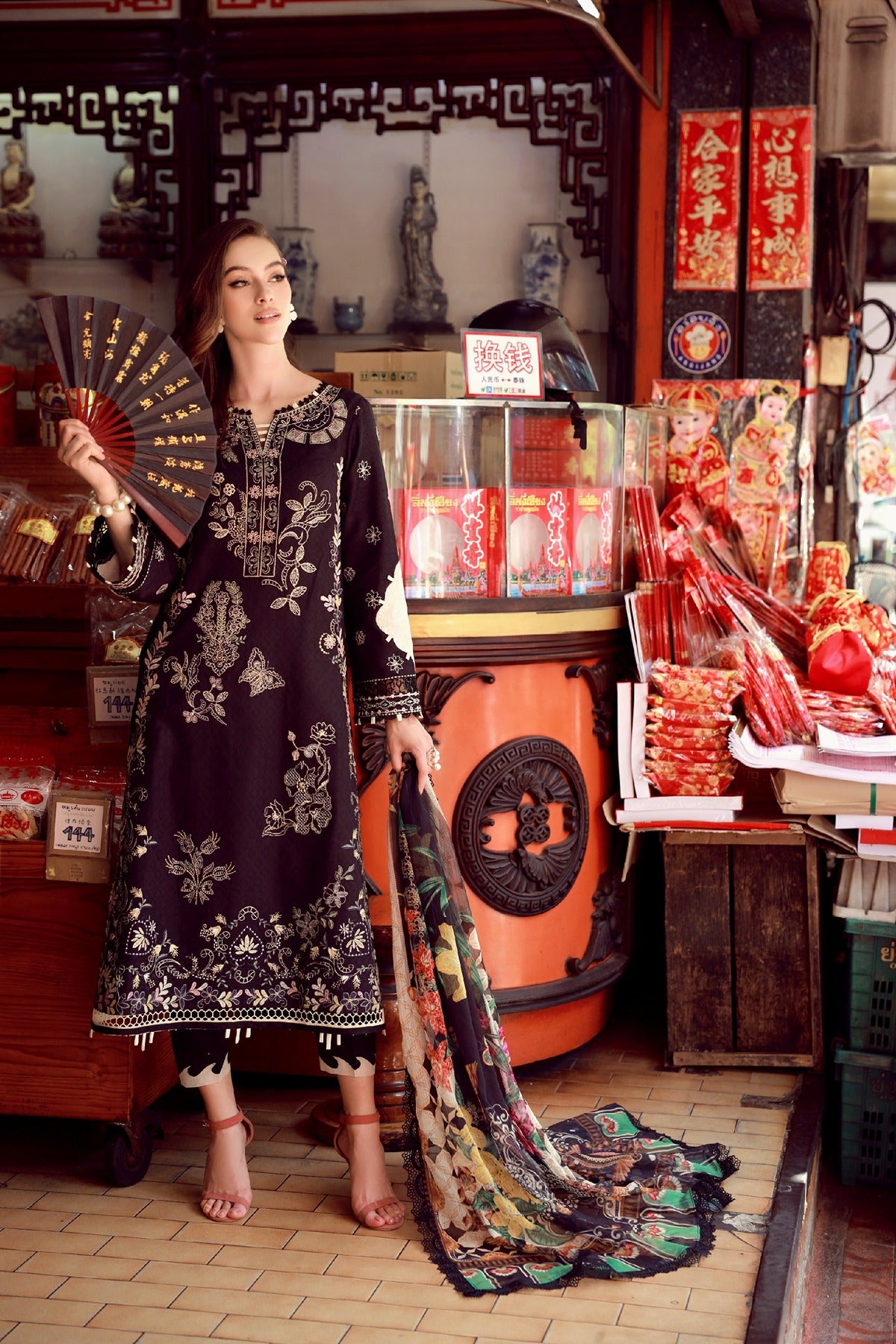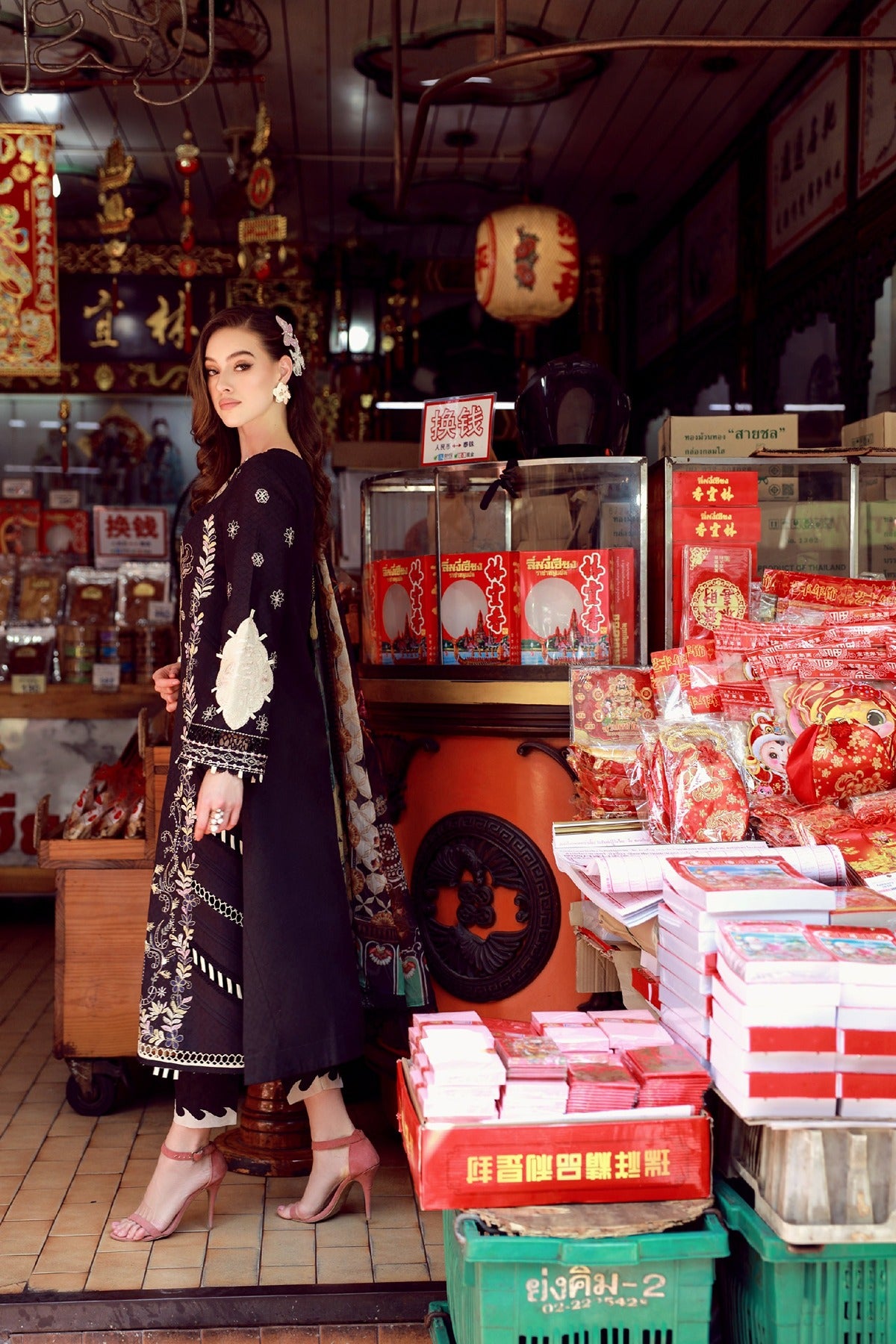 Making a statement is the goal of the opulent and elegant Rimel-Black 3-Piece Set. The rich texture and lace embellishments on this classic jacquard lawn shirt provide it an appearance of refinement. The jacquard lawn trousers provide the ideal combination between comfort and style, matching the shirt perfectly. With its distinctive print and lace details, the printed paper silk dupatta creates a flowing, elegant silhouette while adding a hint of luxury. This ensemble exudes a bold yet sophisticated charm and is ideal for celebratory occasions, formal gatherings, and nighttime events due to its deep black hue and exquisite lace work.
