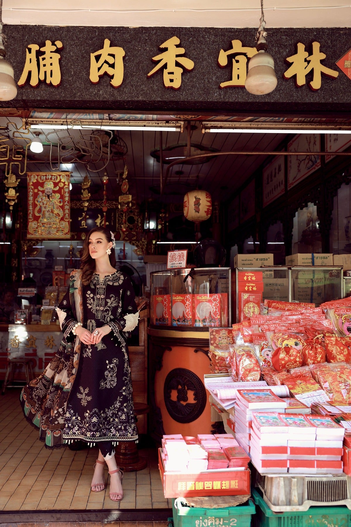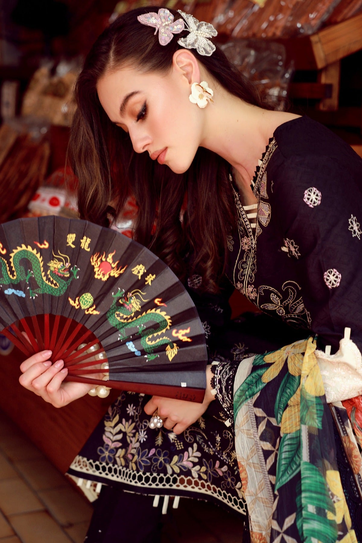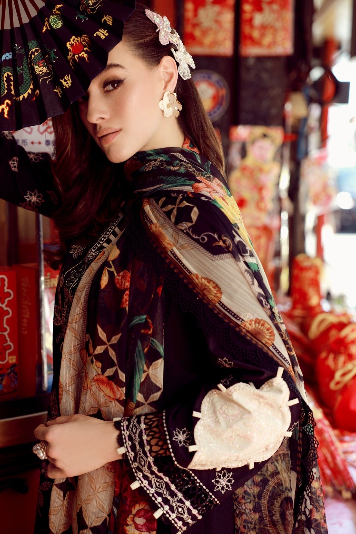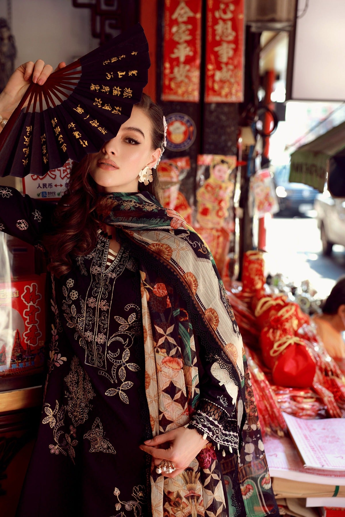 Making a statement is the goal of the opulent and elegant Rimel-Black 3-Piece Set. The rich texture and lace embellishments on this classic jacquard lawn shirt provide it an appearance of refinement. The jacquard lawn trousers provide the ideal combination between comfort and style, matching the shirt perfectly. With its distinctive print and lace details, the printed paper silk dupatta creates a flowing, elegant silhouette while adding a hint of luxury. This ensemble exudes a bold yet sophisticated charm and is ideal for celebratory occasions, formal gatherings, and nighttime events due to its deep black hue and exquisite lace work.