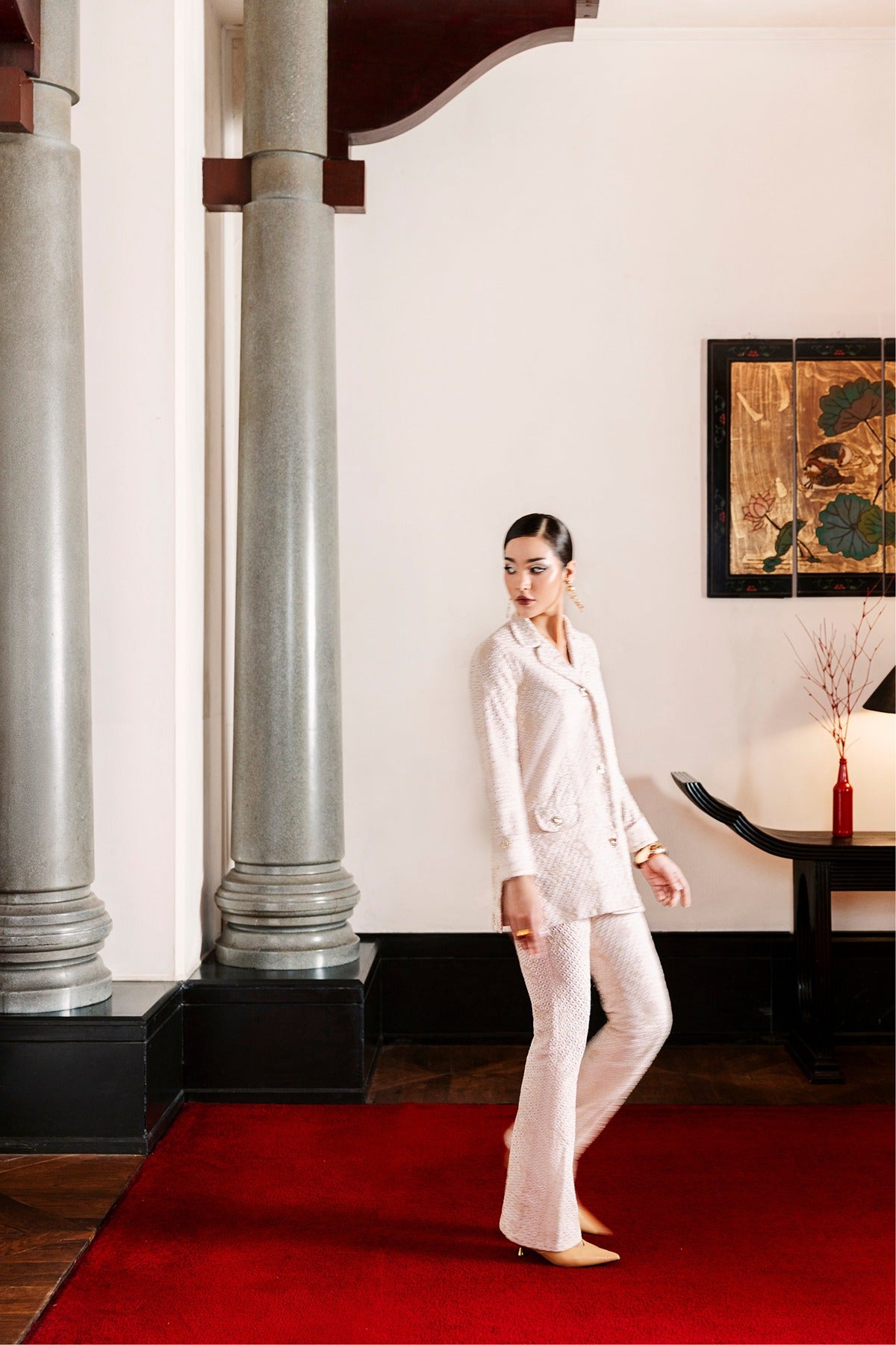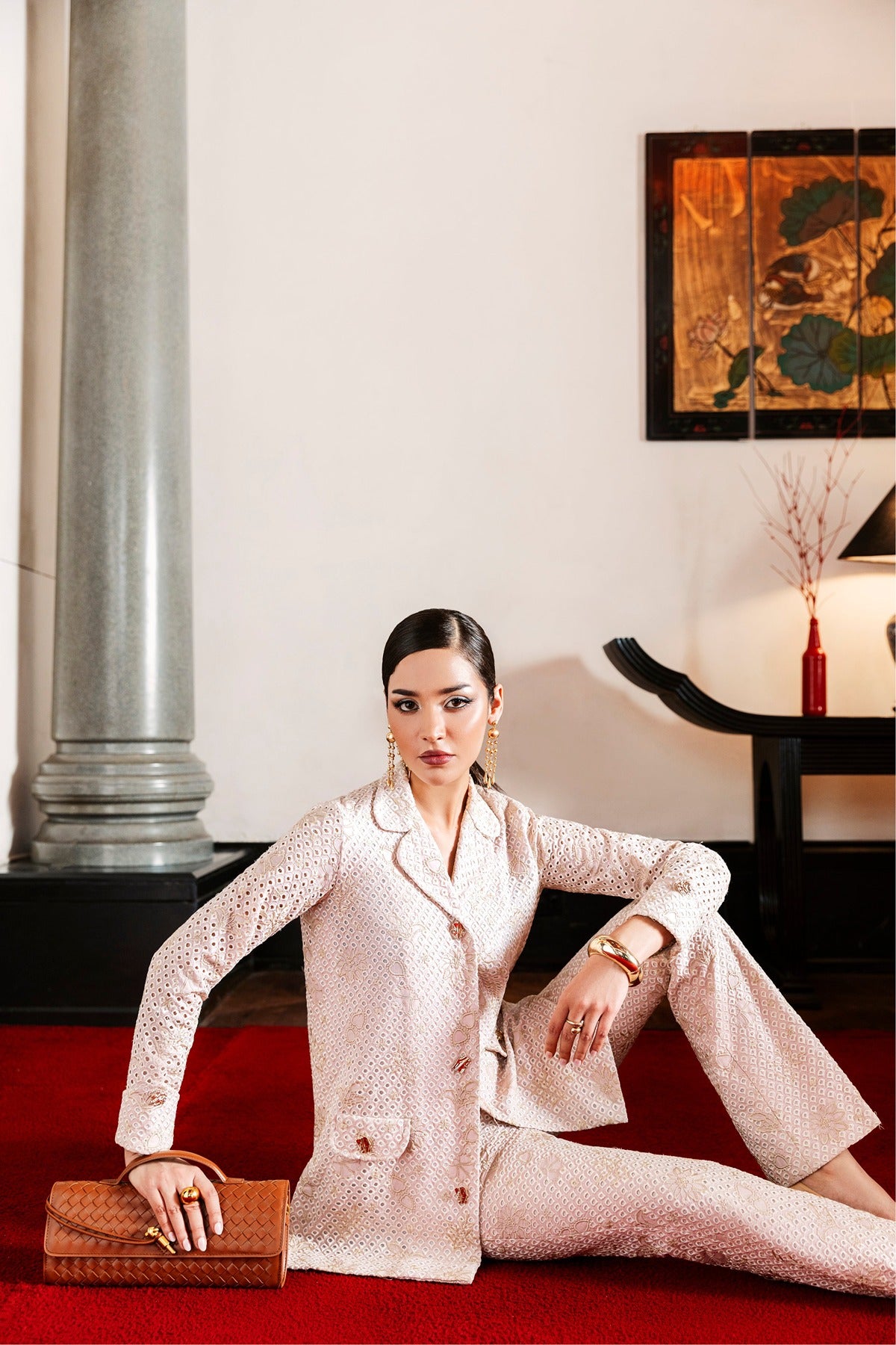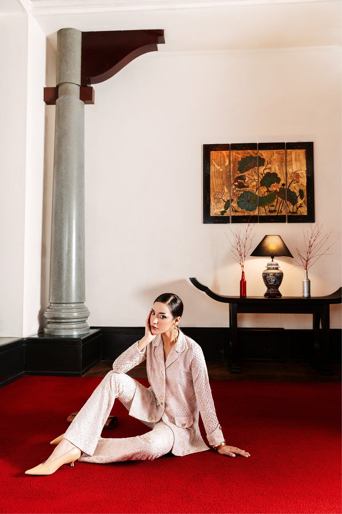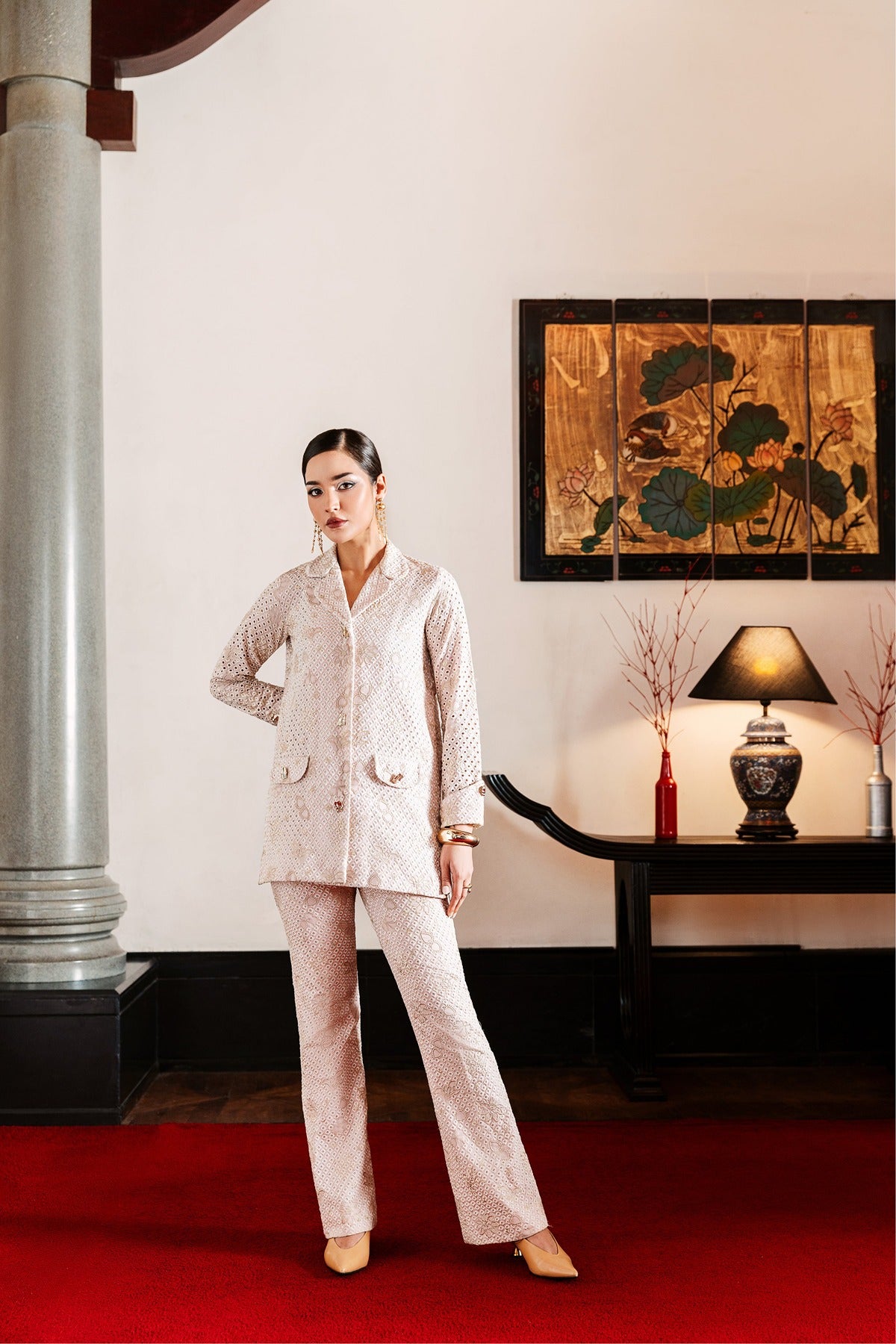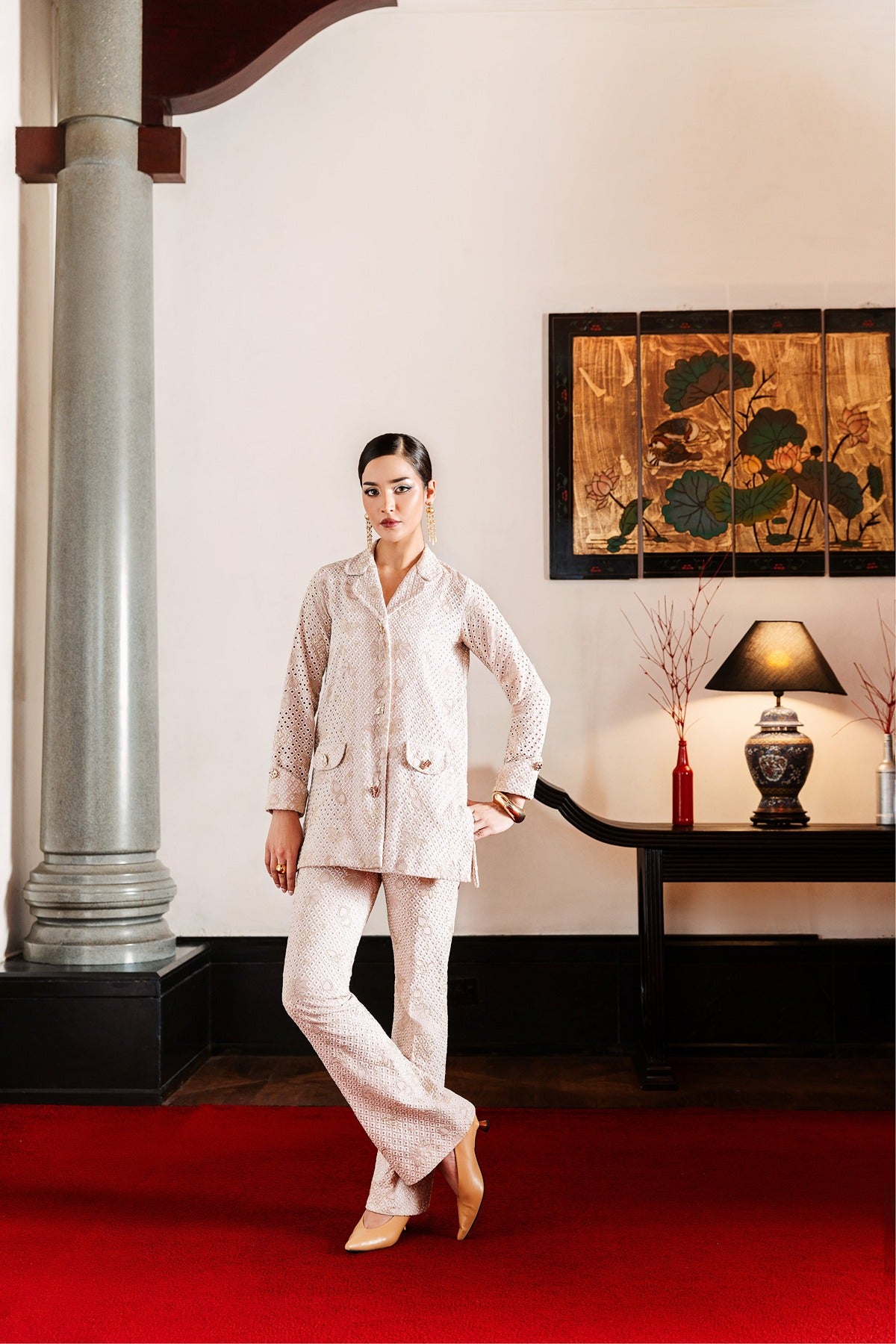 Featuring a jacket-style shirt with front pockets and gold-tone buttons, Faya is a fitted two-piece set made of embroidered lawn. The delicate eyelet embroidery, gentle floral designs, and soft blush pink color make it ideal for daytime events or sophisticated lunches. It combines modern design and Pakistani craftsmanship with a refined touch because to its structured silhouette.