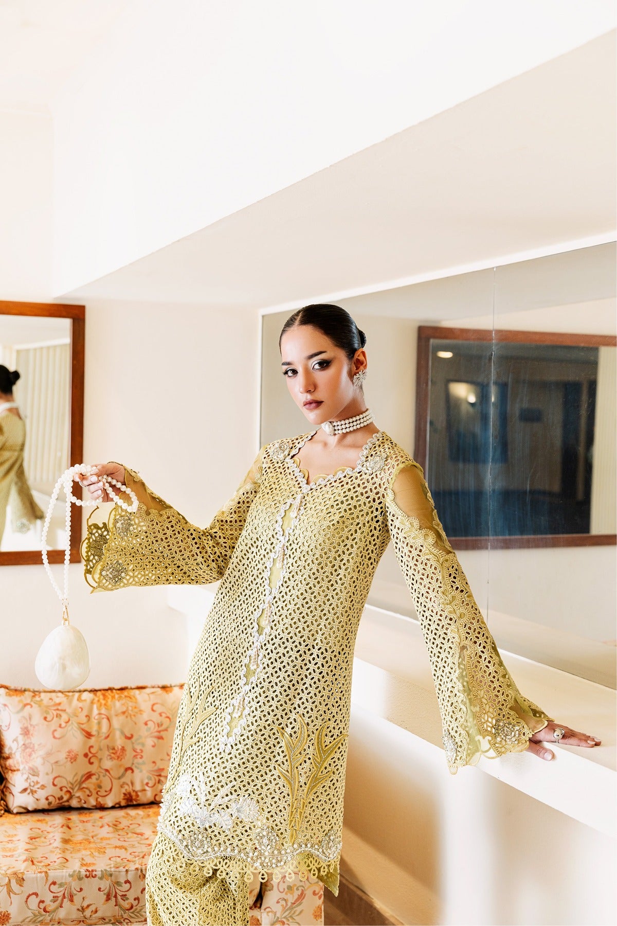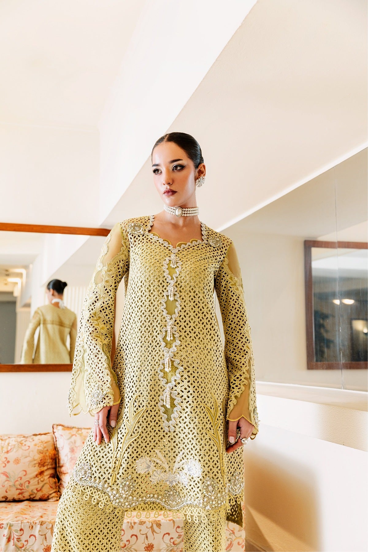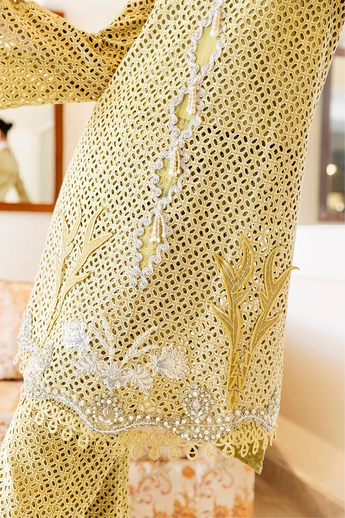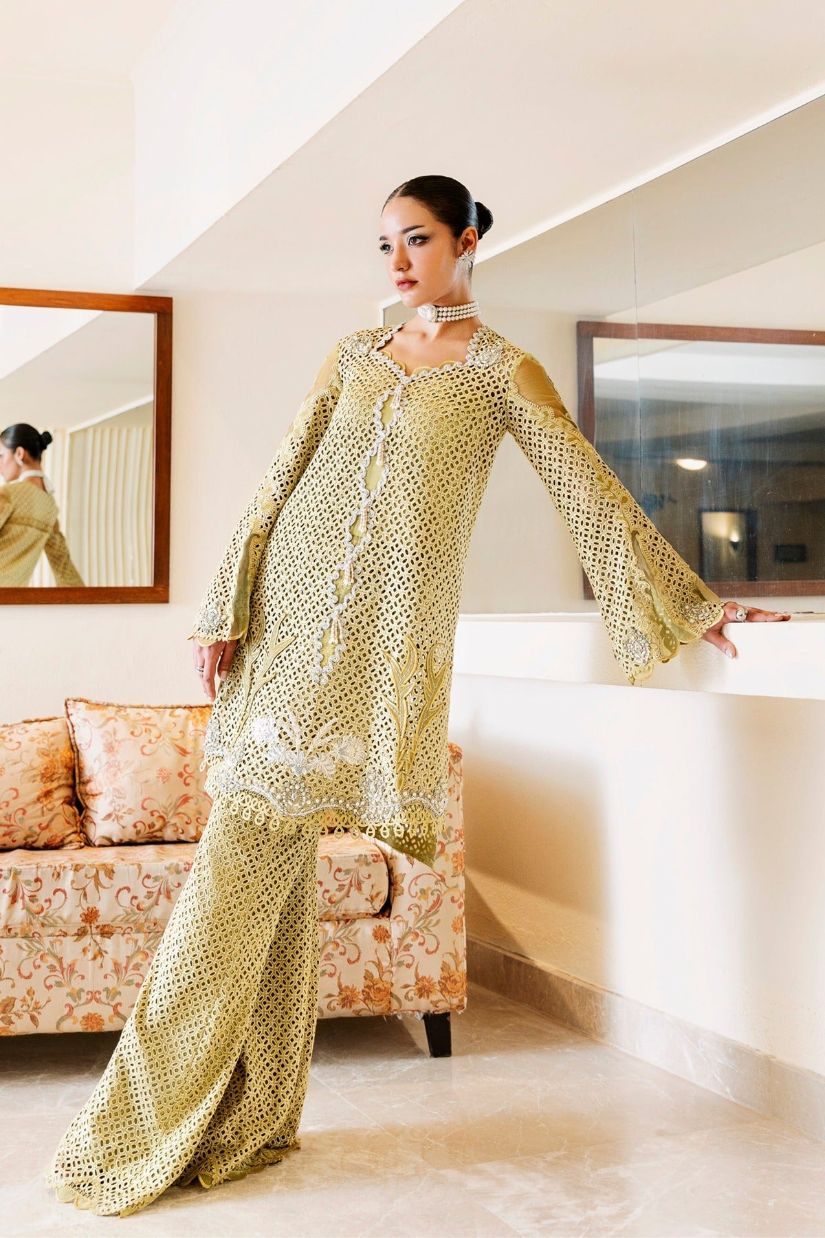 Kaze is a soft mustard-colored lawn dress with elaborate patchwork embroidery and beautiful cutwork details. The long shirt has floral and geometric themes with pearl drops along the hem and is combined with wide-leg trousers that have the same textured finish. The elegant addition of flowing sleeves and sheer panels makes it a lovely option for both private celebrations and daytime get-togethers.