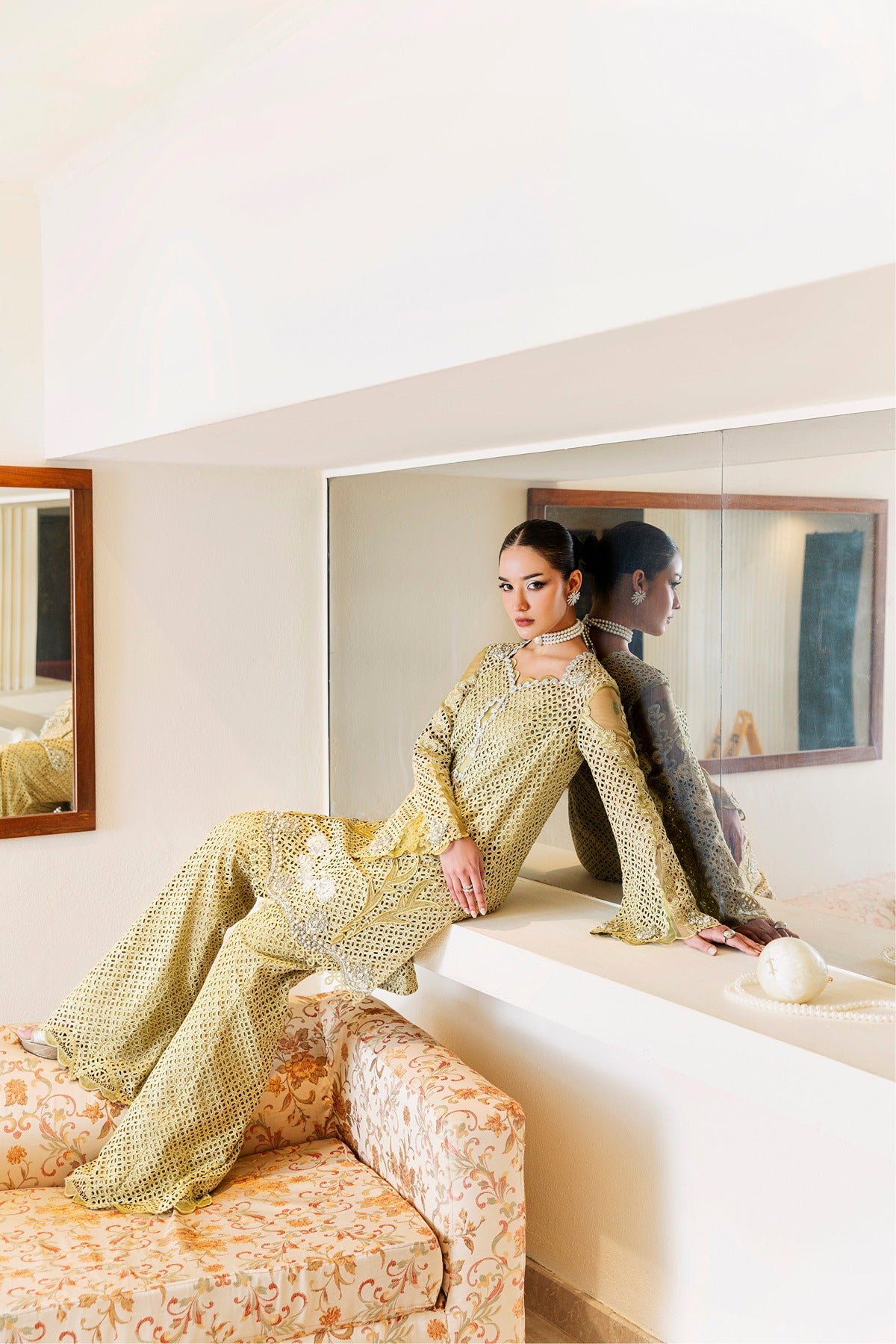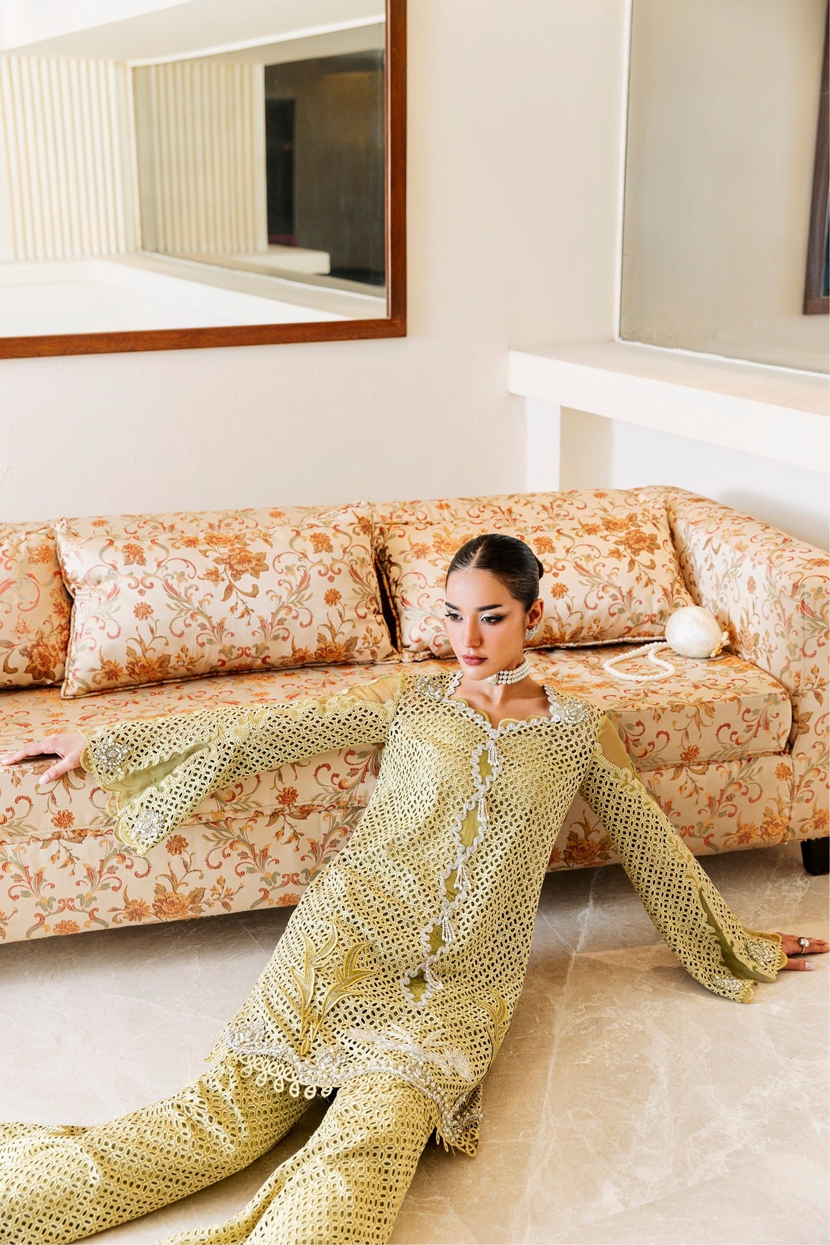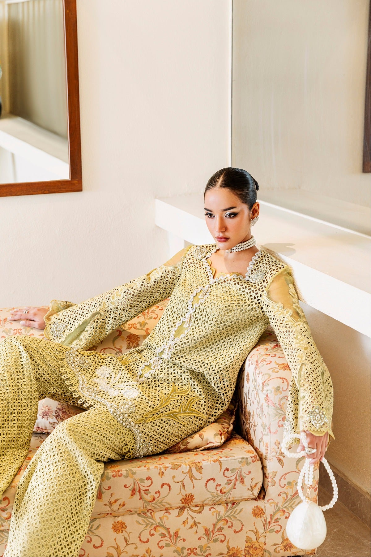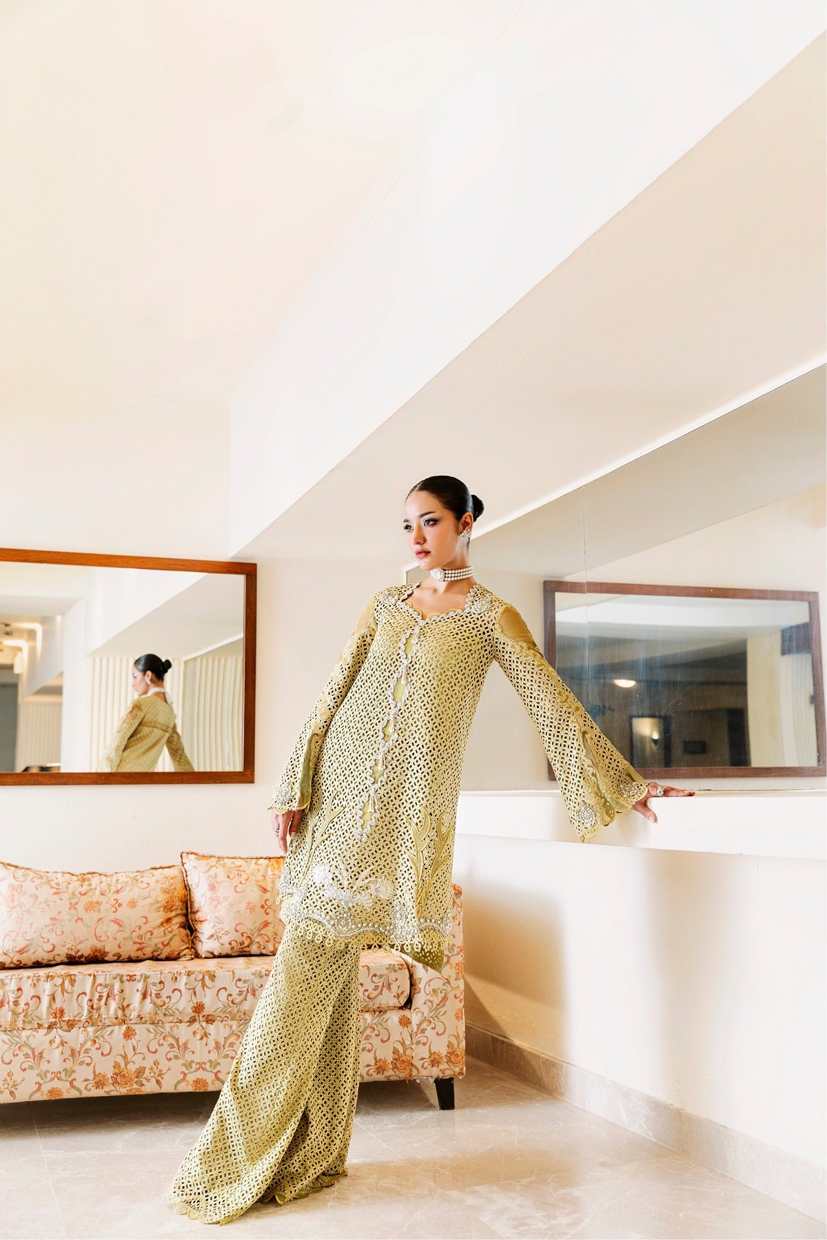 Kaze is a soft mustard-colored lawn dress with elaborate patchwork embroidery and beautiful cutwork details. The long shirt has floral and geometric themes with pearl drops along the hem and is combined with wide-leg trousers that have the same textured finish. The elegant addition of flowing sleeves and sheer panels makes it a lovely option for both private celebrations and daytime get-togethers.