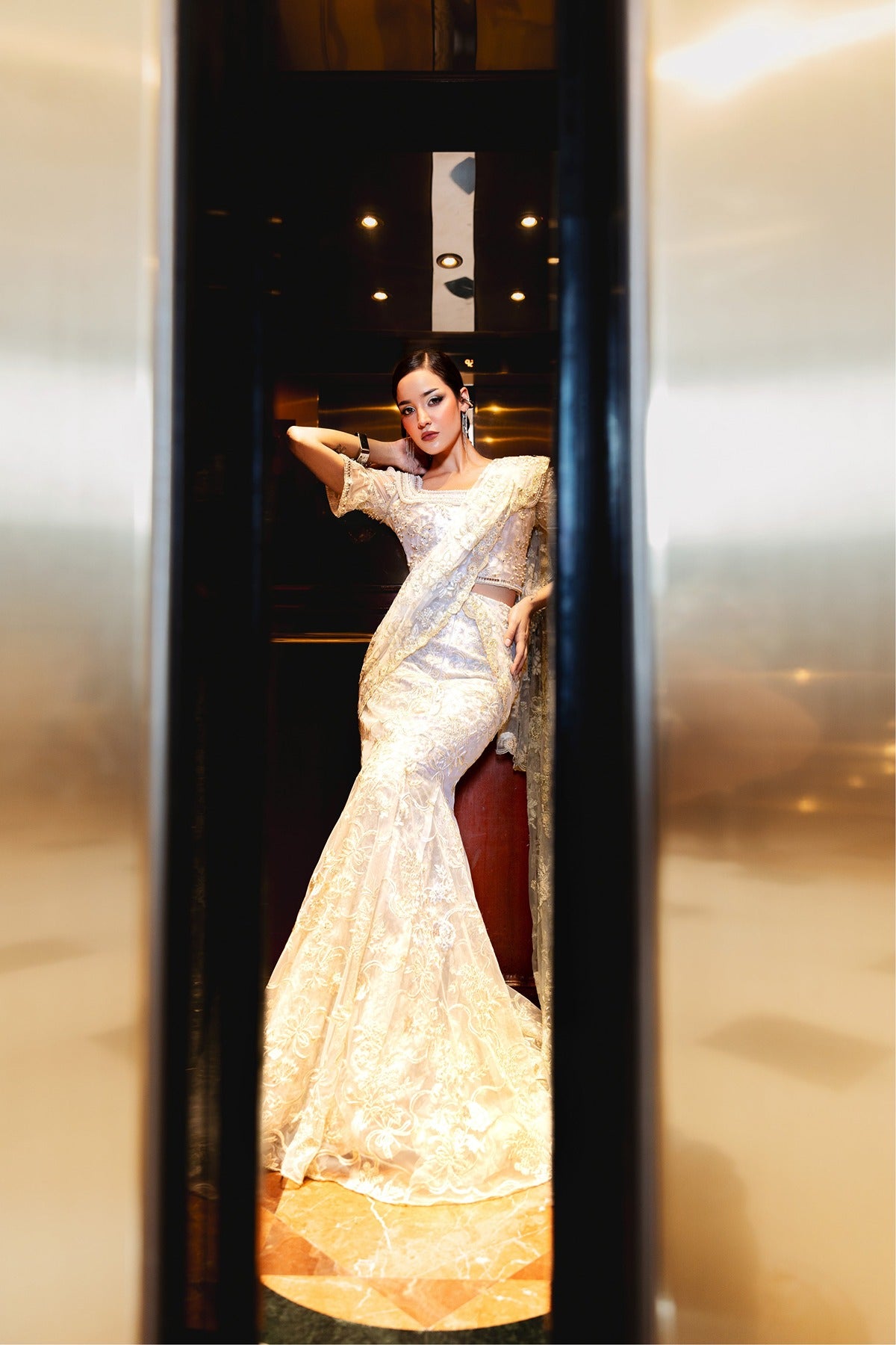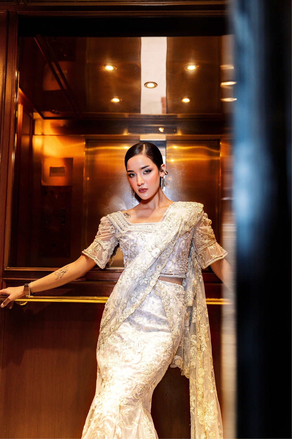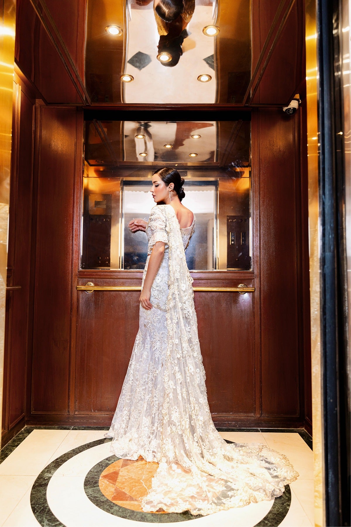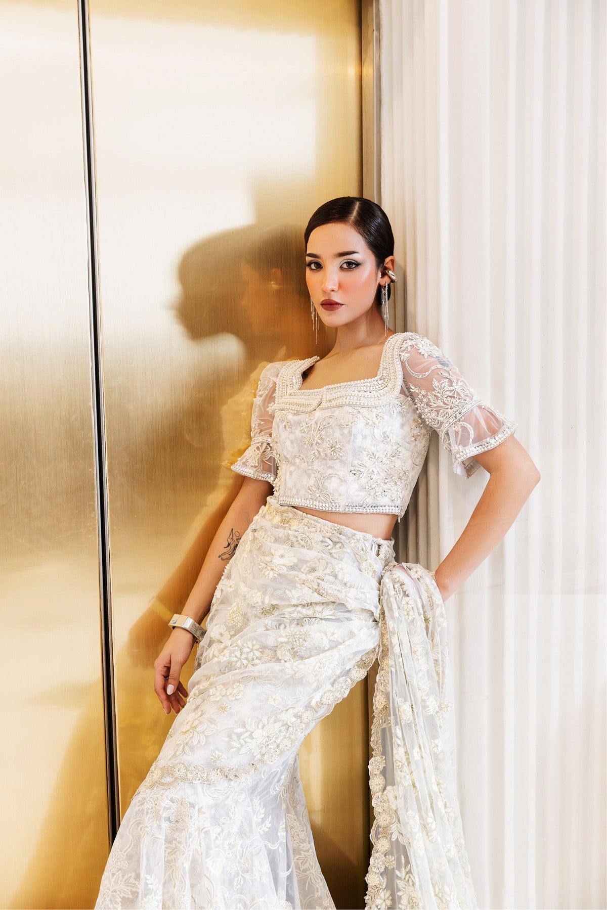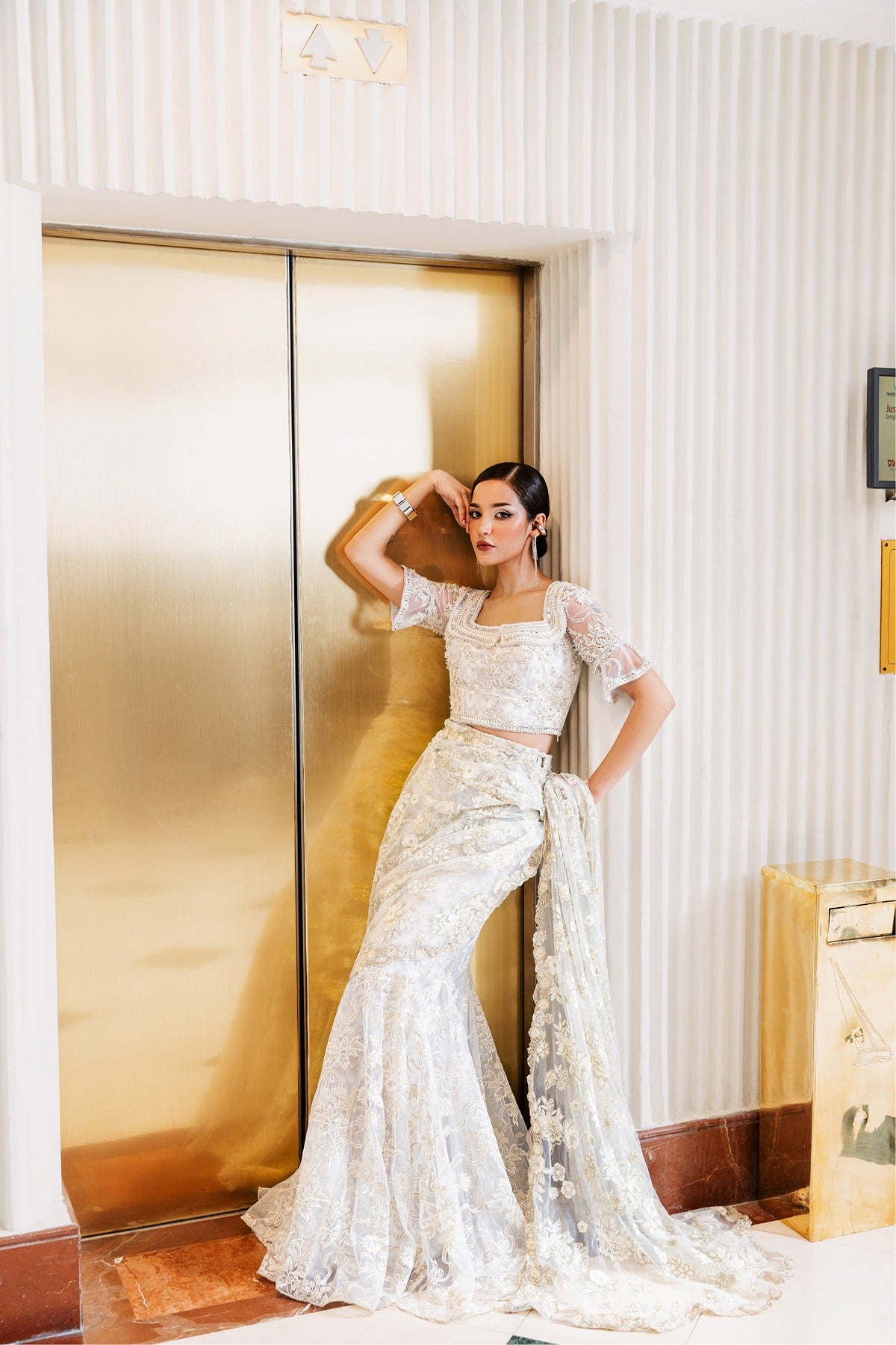 Mirene is a classic sari-style dress made of soft net fabric and accessorized with a top that is lavishly embroidered. The blouse has handworked pearls and floral threadwork, which are accented with layered lace details on the sleeves. The draped net sari has a fishtail silhouette, giving the outfit beautiful movement and a lovely look. Perfect for wedding receptions or nighttime events, this ensemble honors Pakistani couture's modern grace.