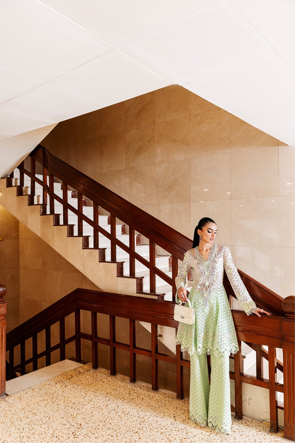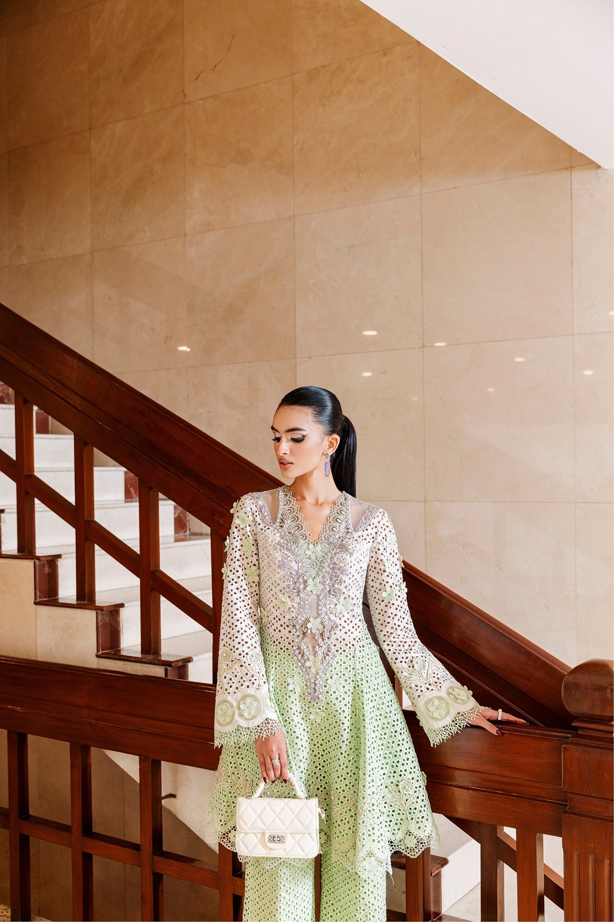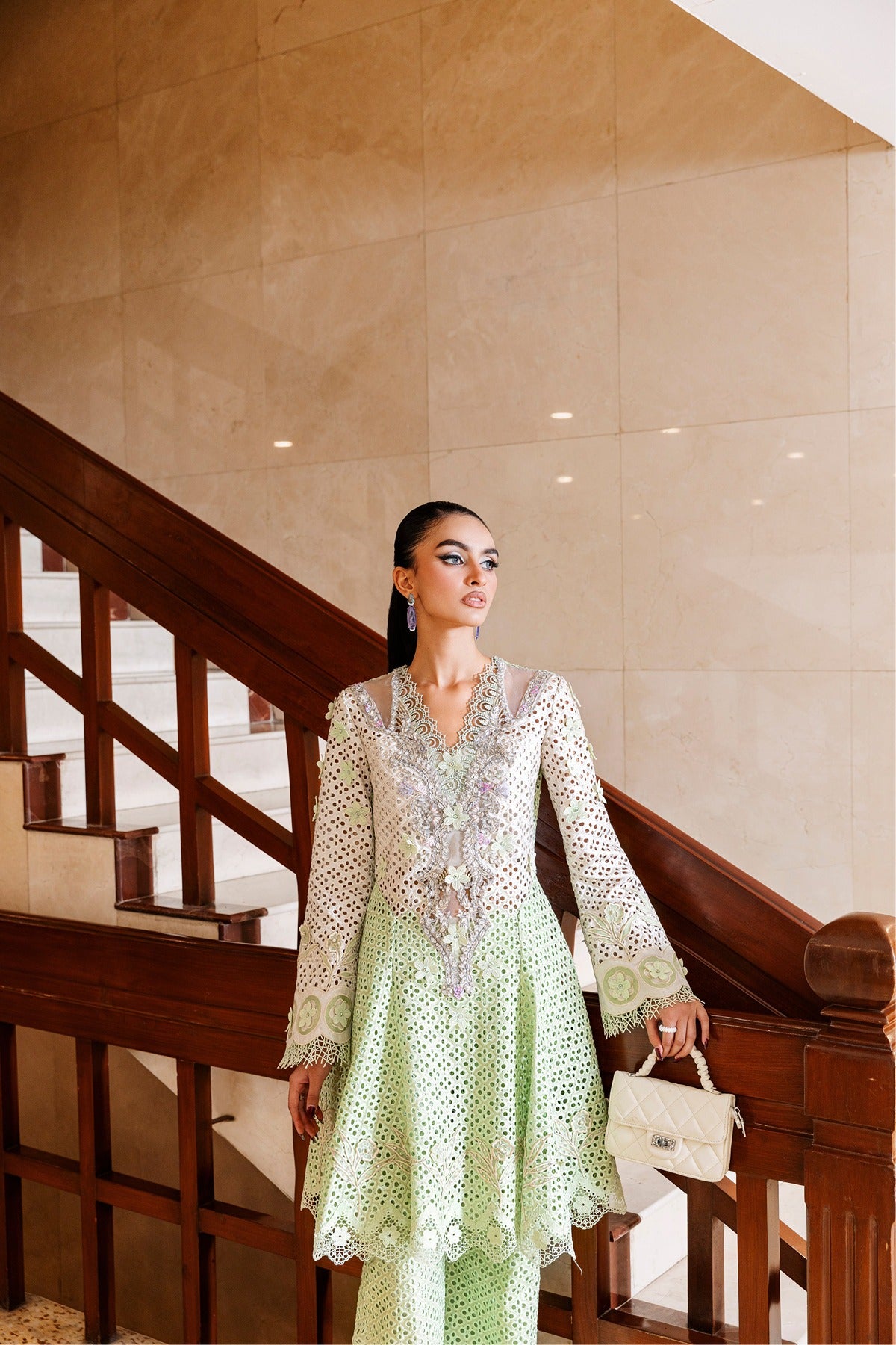Rizka is a new, feminine style made from Shifli embroidered raw silk that combines heritage and humor. The pistachio green wide-leg trousers combine perfectly with a flared long shirt with cutwork features, pearl embellishments, and floral threadwork. Delicate pastel accents, sheer panels, and scalloped hems provide lightness to the design, which is ideal for celebratory brunches or daytime wedding activities.
