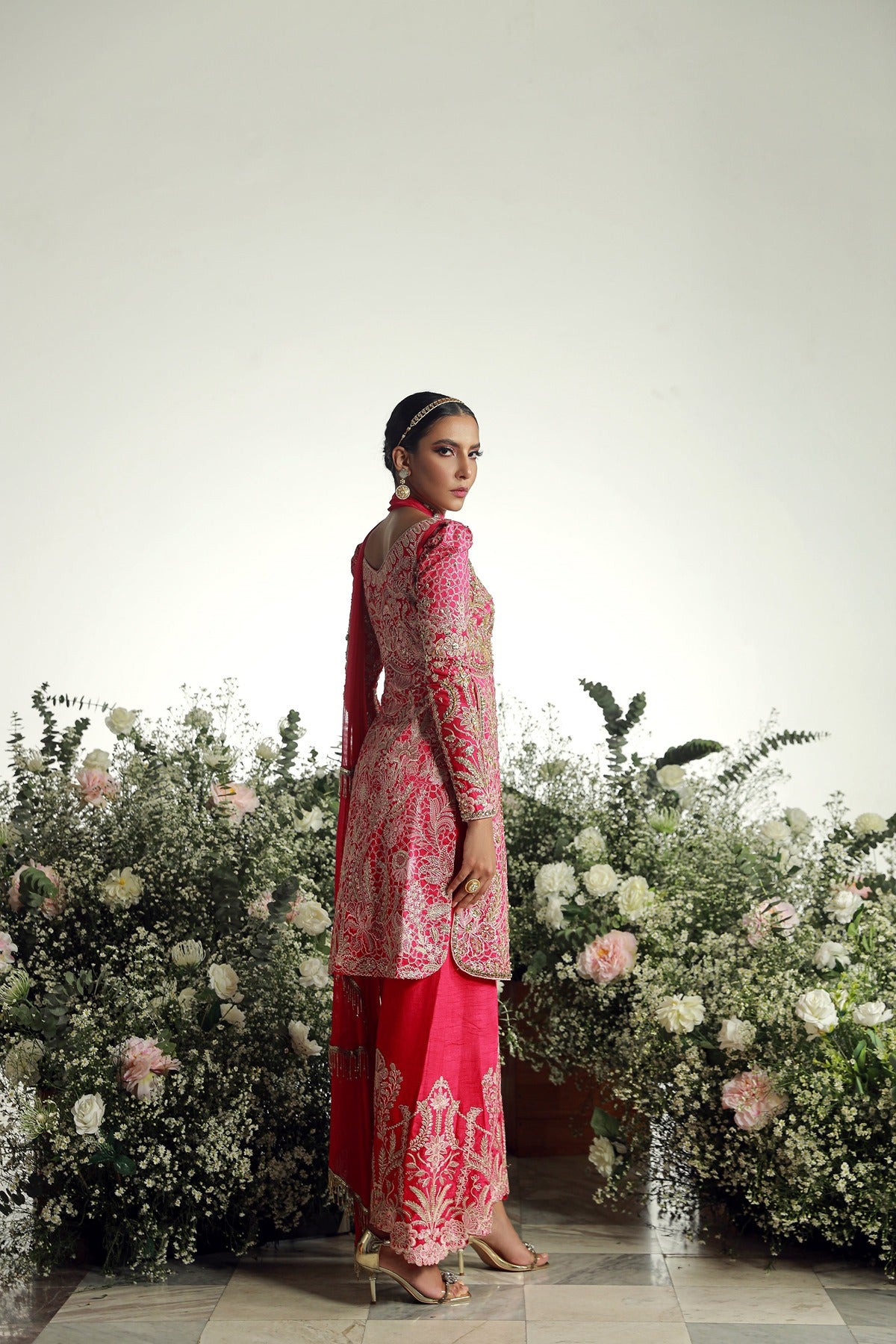 This vivid three-piece costume is ideal for special events. Made from opulent raw silk, it has a strikingly vibrant pink hue and radiates sophistication and elegance. The beautiful gold embroidery on the long kurta and matching salwar lends a timeless feel, while the delicate chiffon dupatta adds an elegant touch. This suit is ideal for weddings or holiday gatherings, combining tradition with modern flair, making it a wardrobe must-have.
