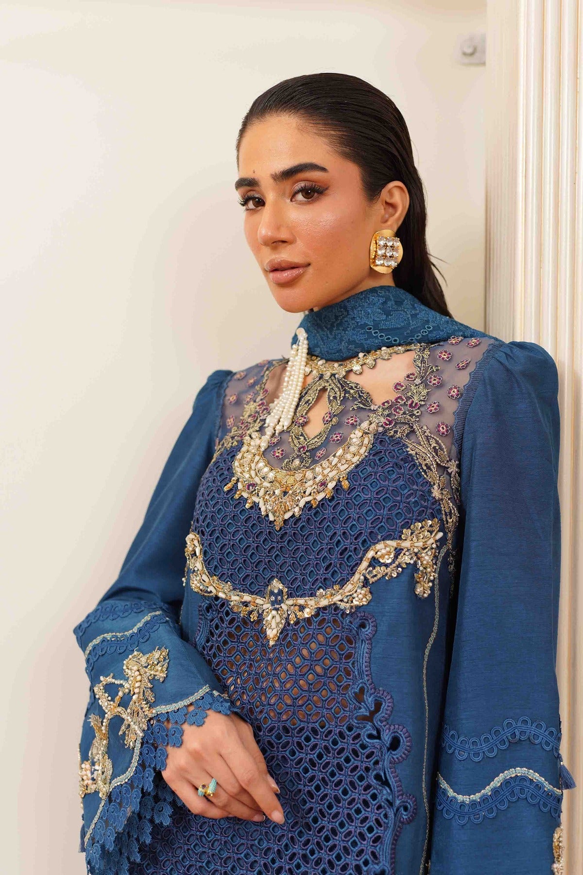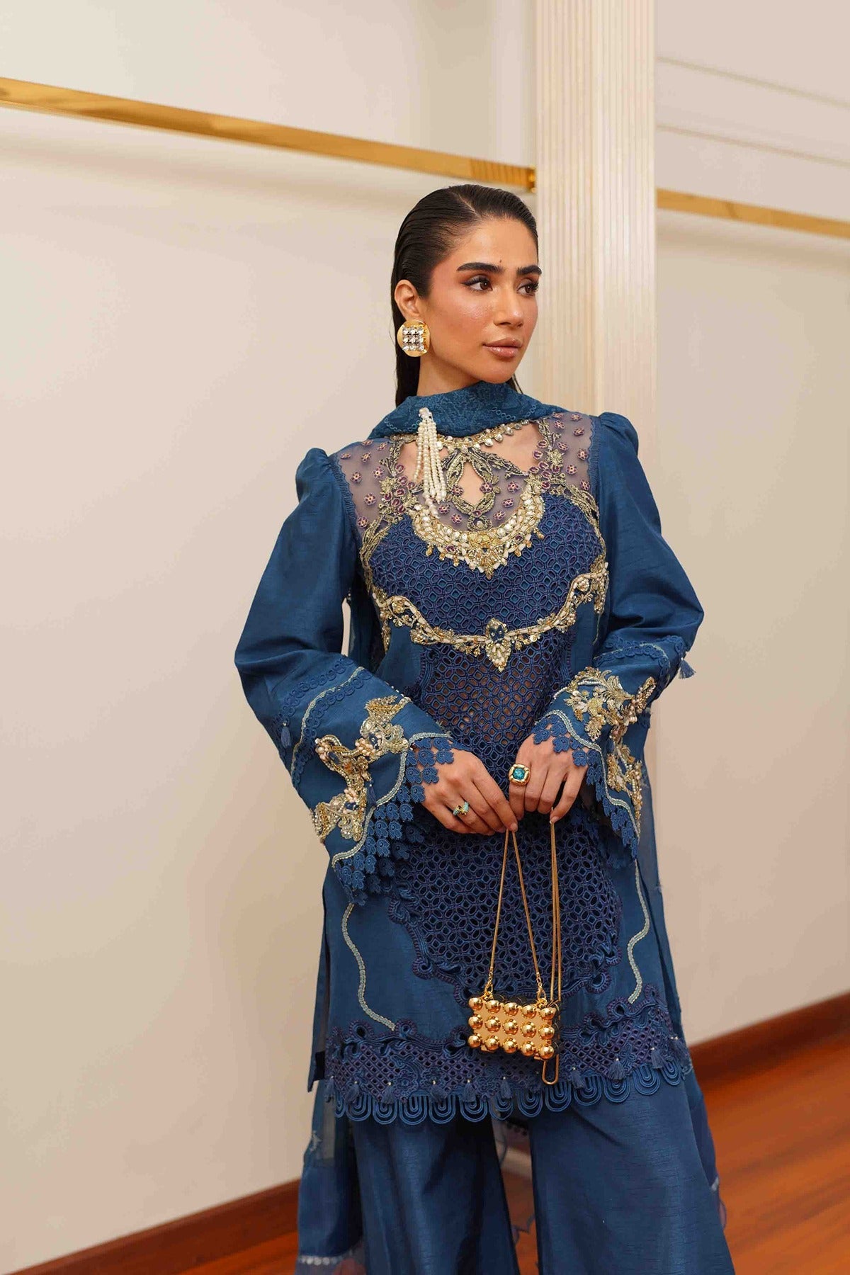 This intriguing three-piece set from Mysie by Tahira, made of fine silk, is a stunning combination of elegance and modern style. The rich blue tone, paired with elaborate embroidery in gold and pearl accents, provides a regal look. The sheer lace design on the bodice, combined with the precisely created decorations on the sleeves and hem, adds another level of refinement. The fabric's flowing drapes and distinctive design accentuate the elegance of contemporary femininity, making it a perfect option for formal settings or evening gatherings.