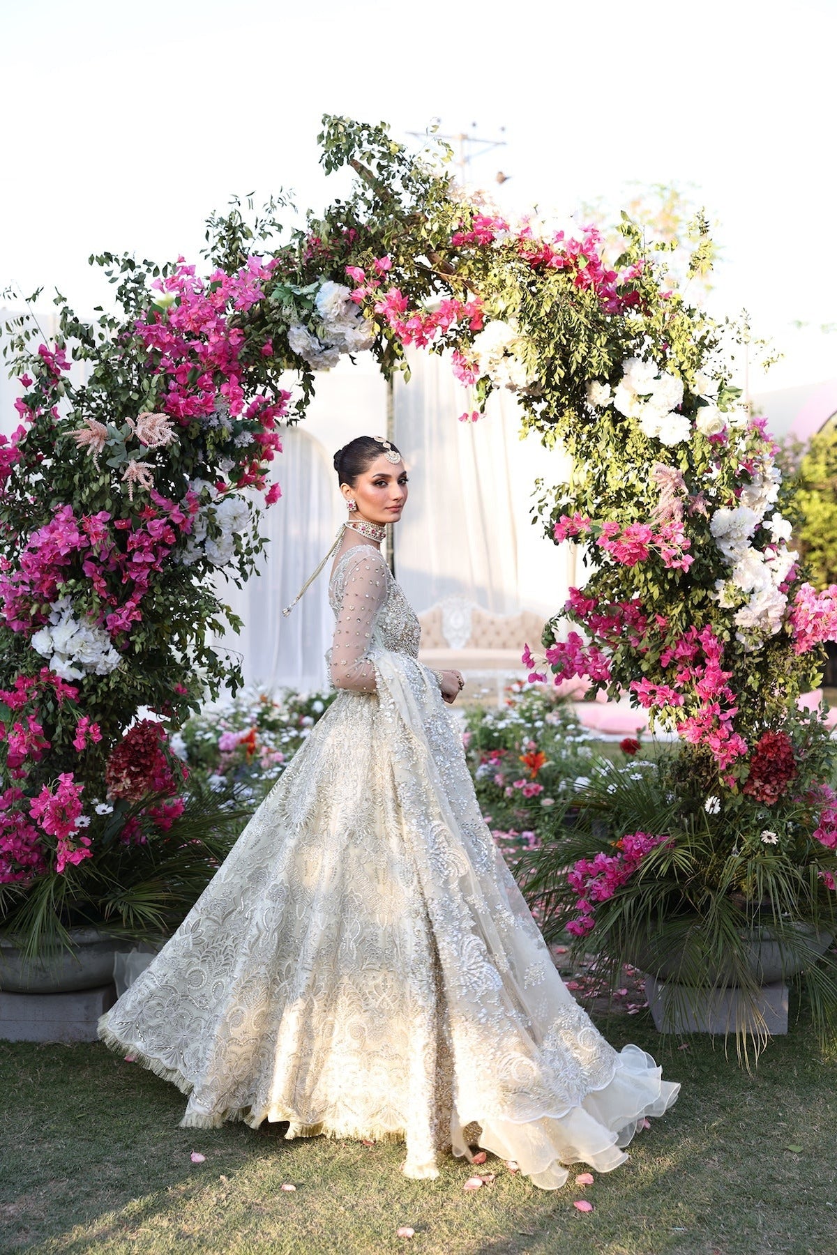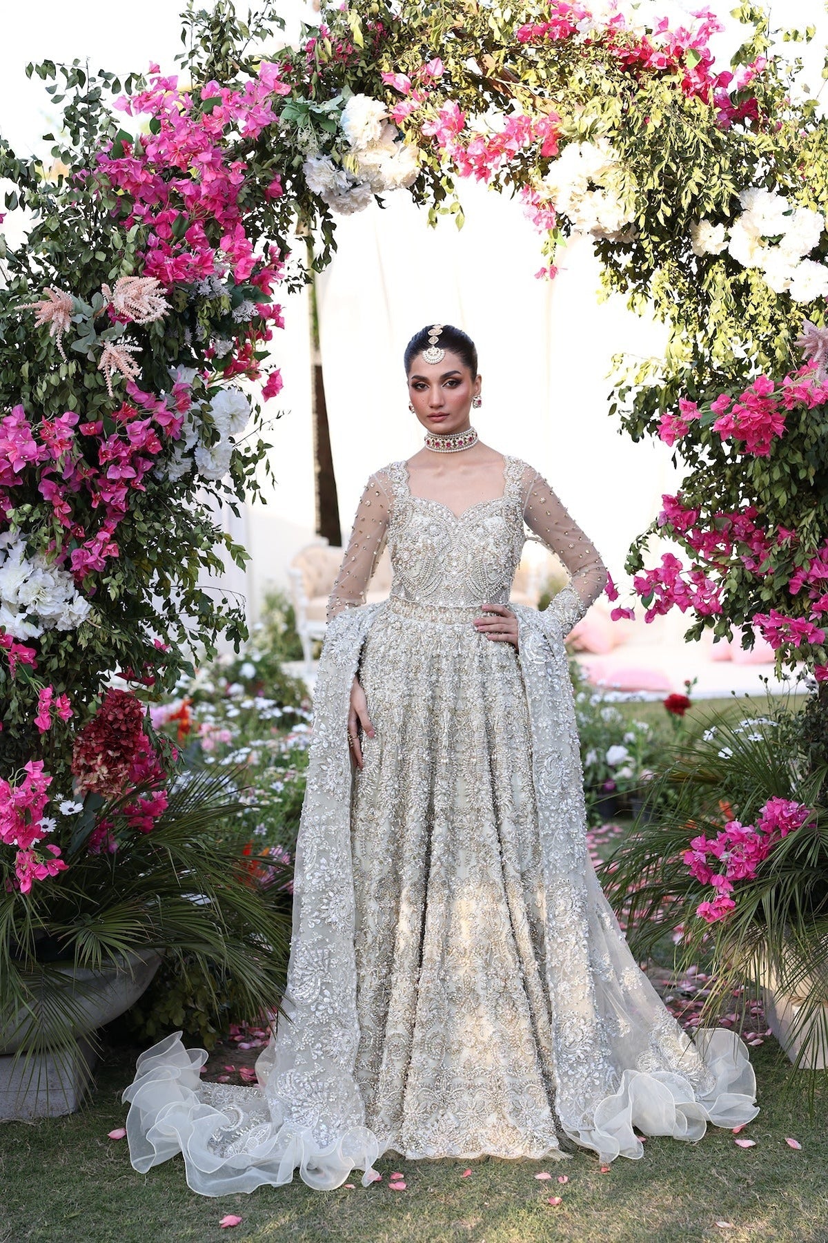 This three-piece off-white net costume combines delicate flower and paisley motifs in gold and silver with elaborate embroidery and beaded. The gown's full-sleeve style and sheer netted sleeves, combined with complementing accessories such as a spectacular necklace, earrings, and headpiece, heighten its luxurious appeal. Set against a backdrop of brilliant pink flowers, the exquisite gown oozes traditional bridal charm, making it ideal for weddings and other special occasions. The wearer will stand out at any festive occasion thanks to the exquisitely designed embellishments, which add an opulent touch.
