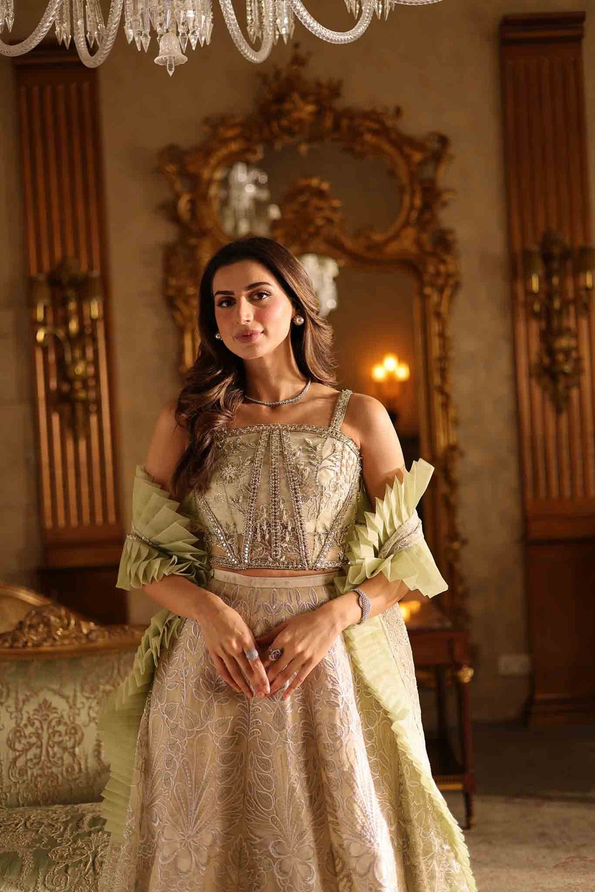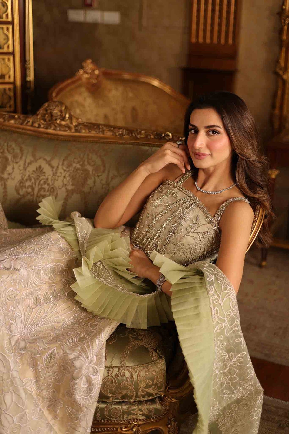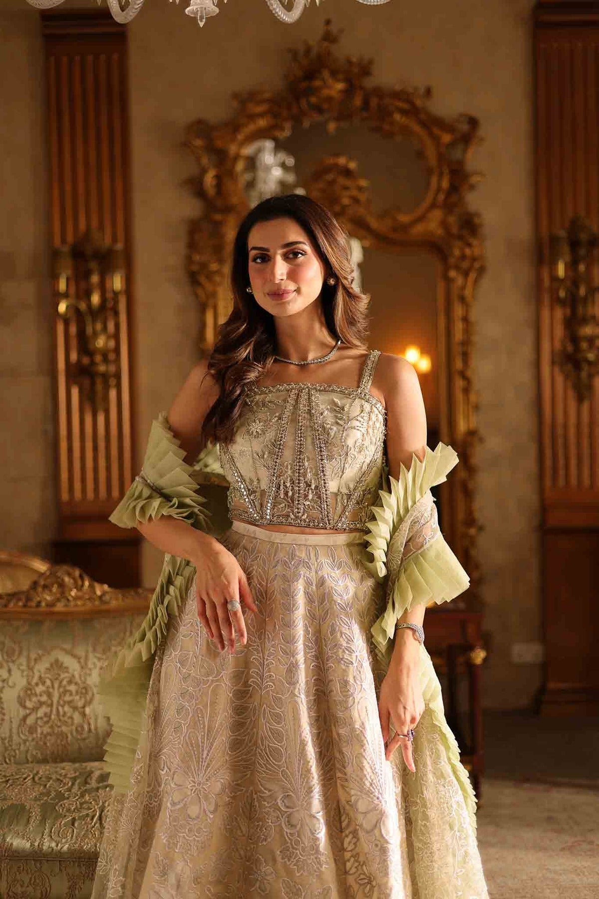 Elegant organza cut-work is employed to create the ensemble, which is a stunning blend of ivory and pastel gold tones. A beautifully embroidered top with elaborate beading and thread work gives the three-piece set a sophisticated yet classic appearance. The flowing skirt is beautifully decorated with matching floral and geometric motifs, adding to its soft, opulent appeal. A light, pistachio green ruffled organza shawl completes the ensemble and gives this otherwise timeless design a dash of contemporary flair. This ensemble is ideal for formal occasions where elegance and flair are combined in the most sophisticated way.