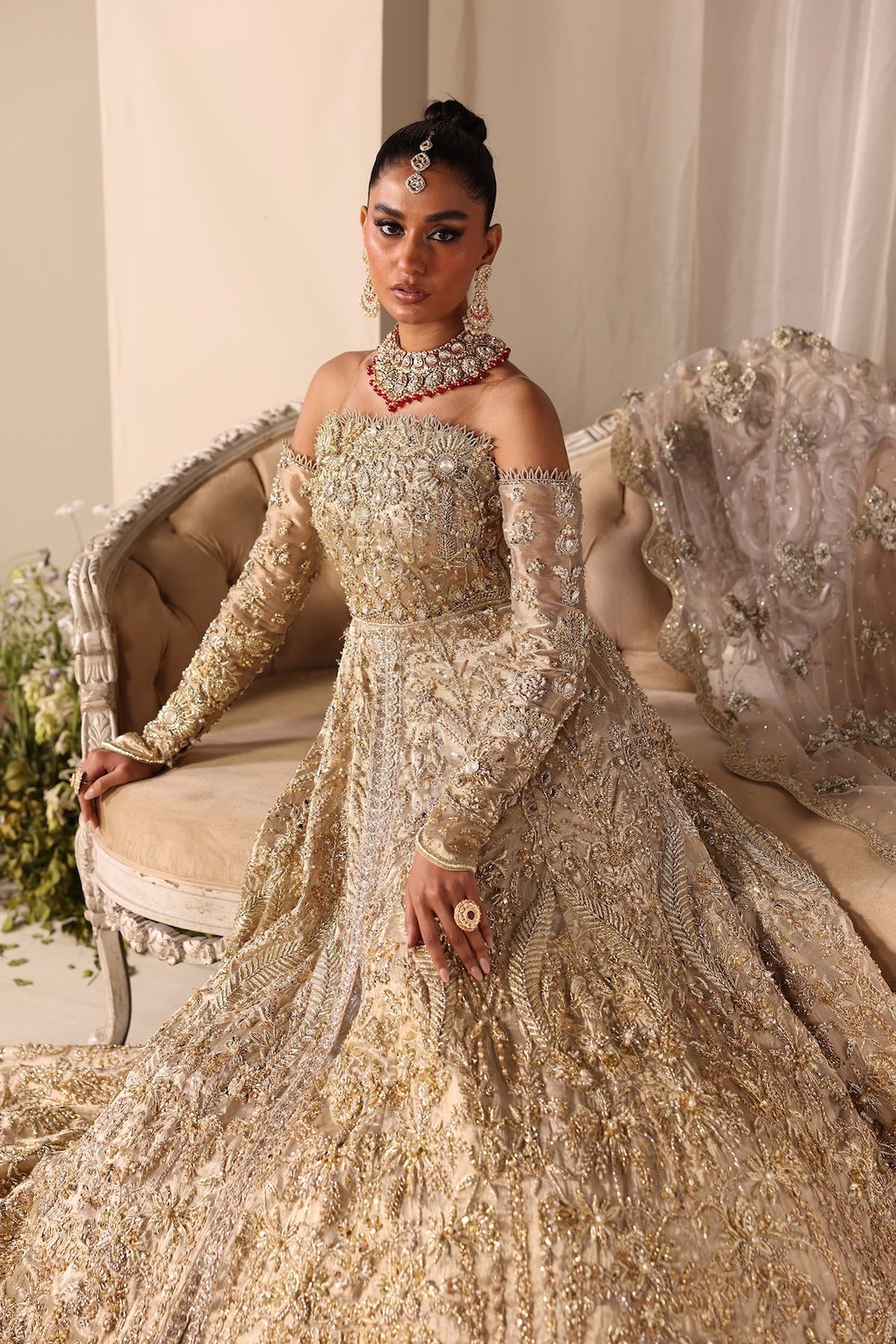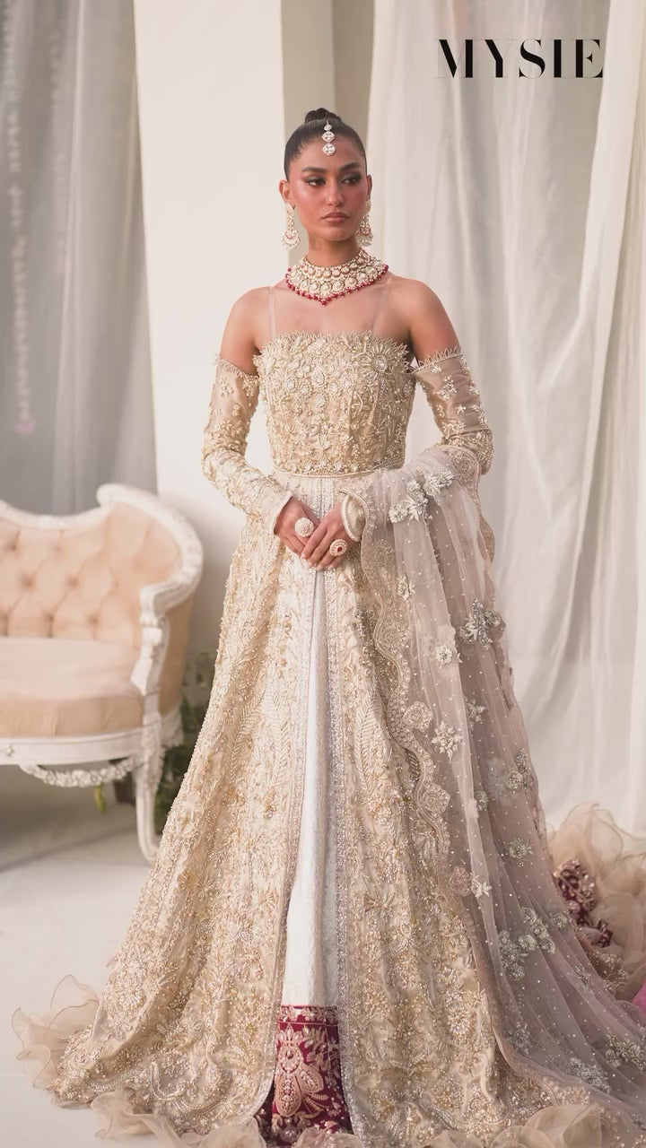 A sumptuous three-piece set of tissue fabric with delicate threadwork and elaborate decorations. The dress combines traditional and modern design elements, with a gorgeous off-the-shoulder neckline and long embroidered sleeves. The matching net dupatta adds elegance and balances the gown's elaborate details. The beautiful, intricately embroidered border completes this bridal ensemble, which exudes elegance and luxury.