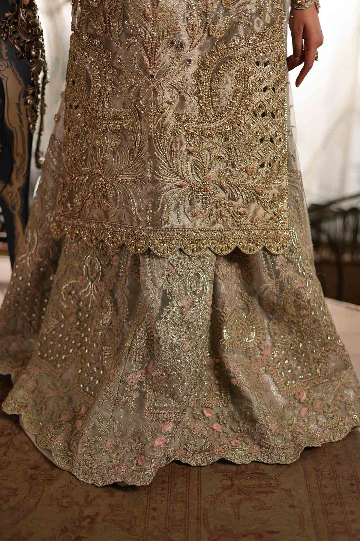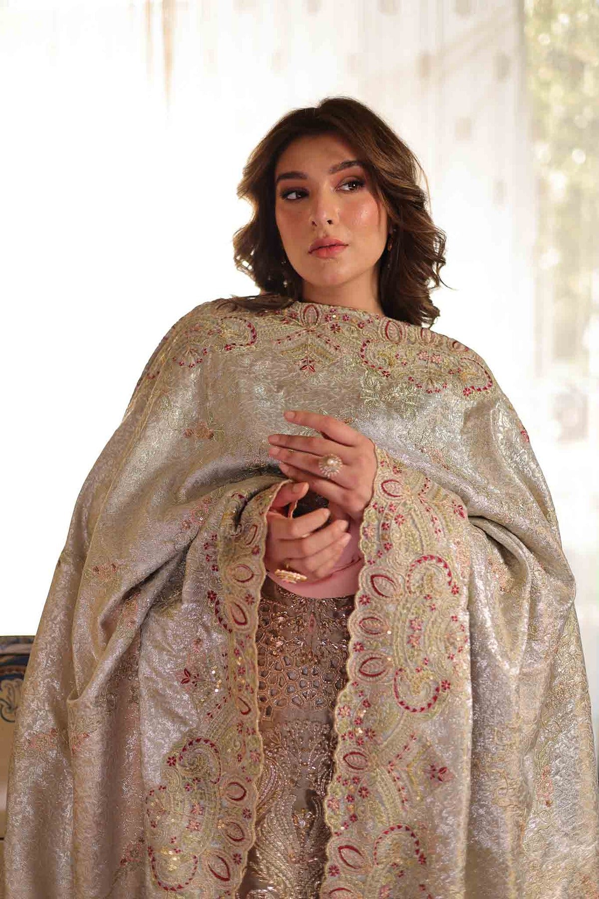 Rich tissue fabric is used to create this exquisite three-piece ensemble, which also has elaborate gold and silver embroidery. The dress looks majestic and elegant thanks to its glittering beadwork and embellishments. With delicate pink highlights and elaborate floral designs all over the fabric, the soft beige tone accentuates the design. The long-sleeved kameez is matched by a rich, matching dupatta that creates an attractive flow in the ensemble. This ensemble is ideal for formal occasions like weddings and radiates classic elegance.