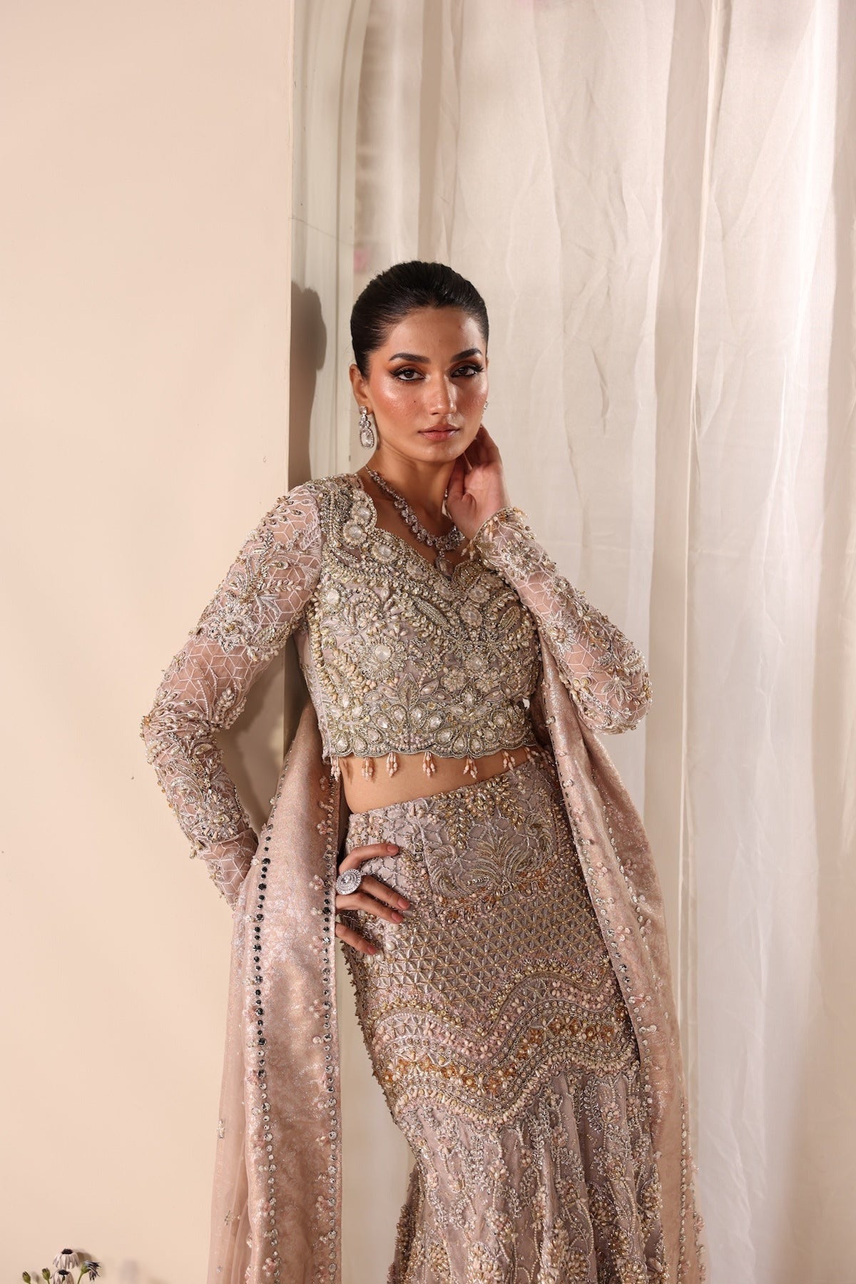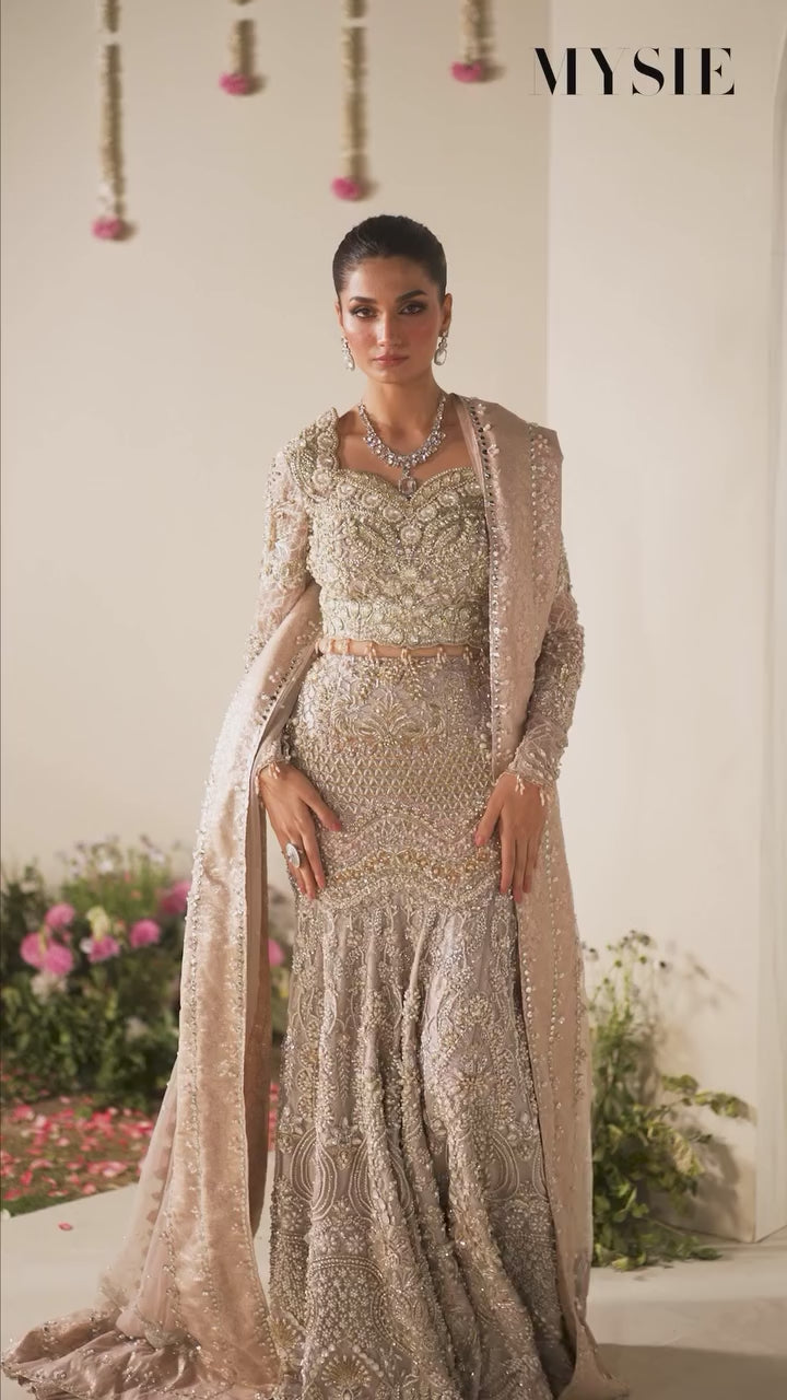 Mysie by Tahira's stunning costume redefines elegance with elaborate decorations and haute craftsmanship. The net fabric, embellished with intricate embroidery and sequins, creates a delicate, shimmering look ideal for a nikkah or other special occasions. The top is exquisitely crafted, highlighting the intricate embroidery, and the skirt flows out nicely, creating a tailored profile. The gentle beige tones are accented with golden and silver threads, creating a royal look. This design is a stunning fusion of traditional and modern couture, accented with a matching embroidered shawl.