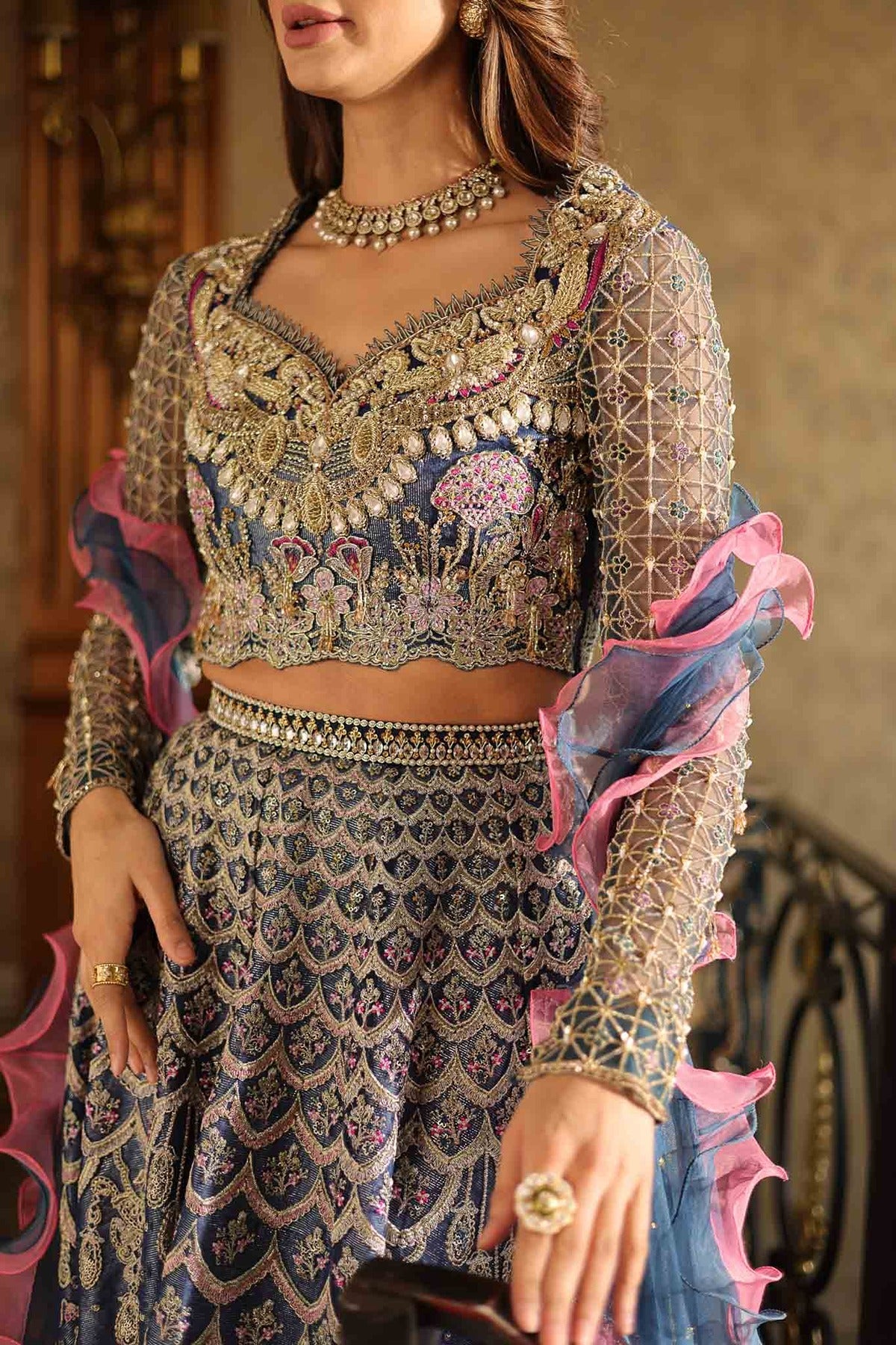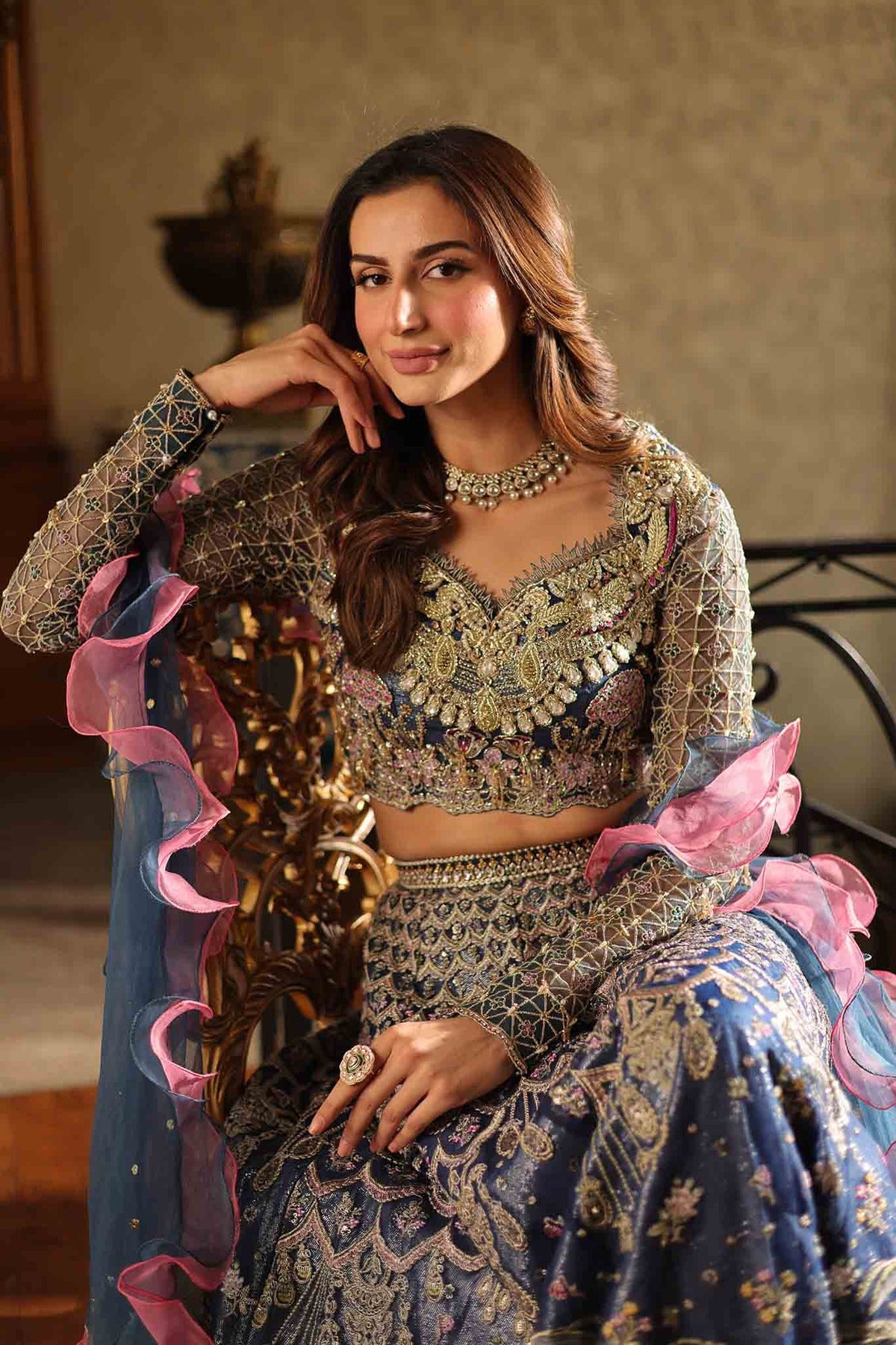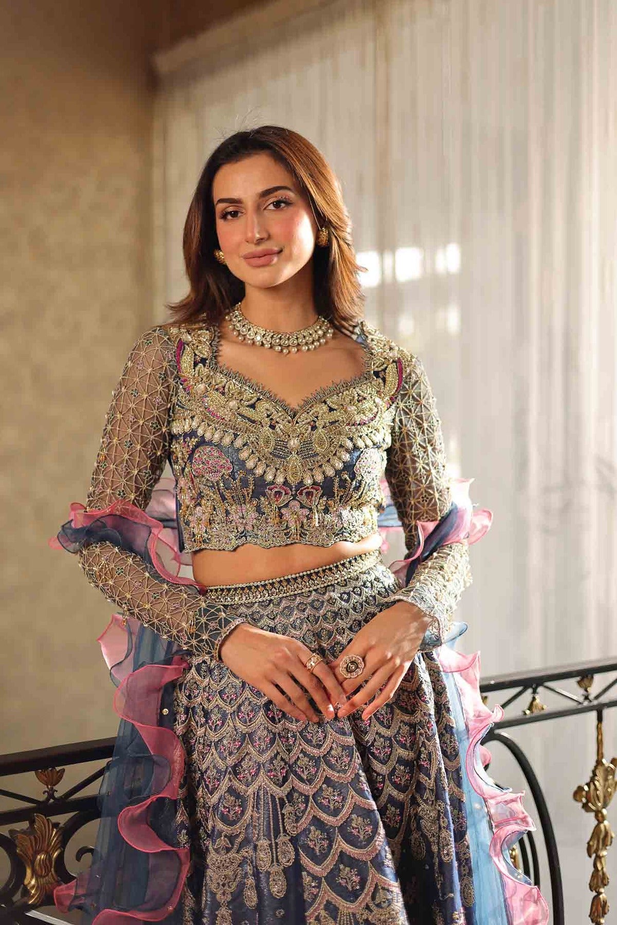 This gorgeous ensemble includes a net lehenga choli with intricate details in shades of pink, gold, and blue. With pearls, sequins, and metallic threads as accents, the choli is elaborately adorned with geometric and floral patterns. It has soft, sweet touches because the sleeves are decorated with ruffled sheer pink tulle. The lehenga has a rich golden and blue embroidered pattern, which is complemented by delicate tulle ruffles at the waistline and hem, giving it a modern yet regal look. A striking necklace and rings finish the ensemble, making it ideal for a wedding or other joyous occasion. Deep blues, gentle pinks, and gold tones make up this ensemble's color scheme, which produces a unified and opulent look.