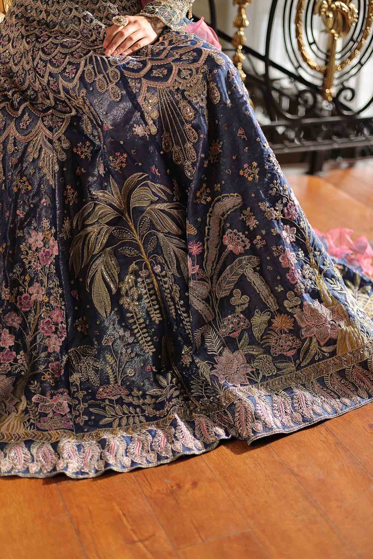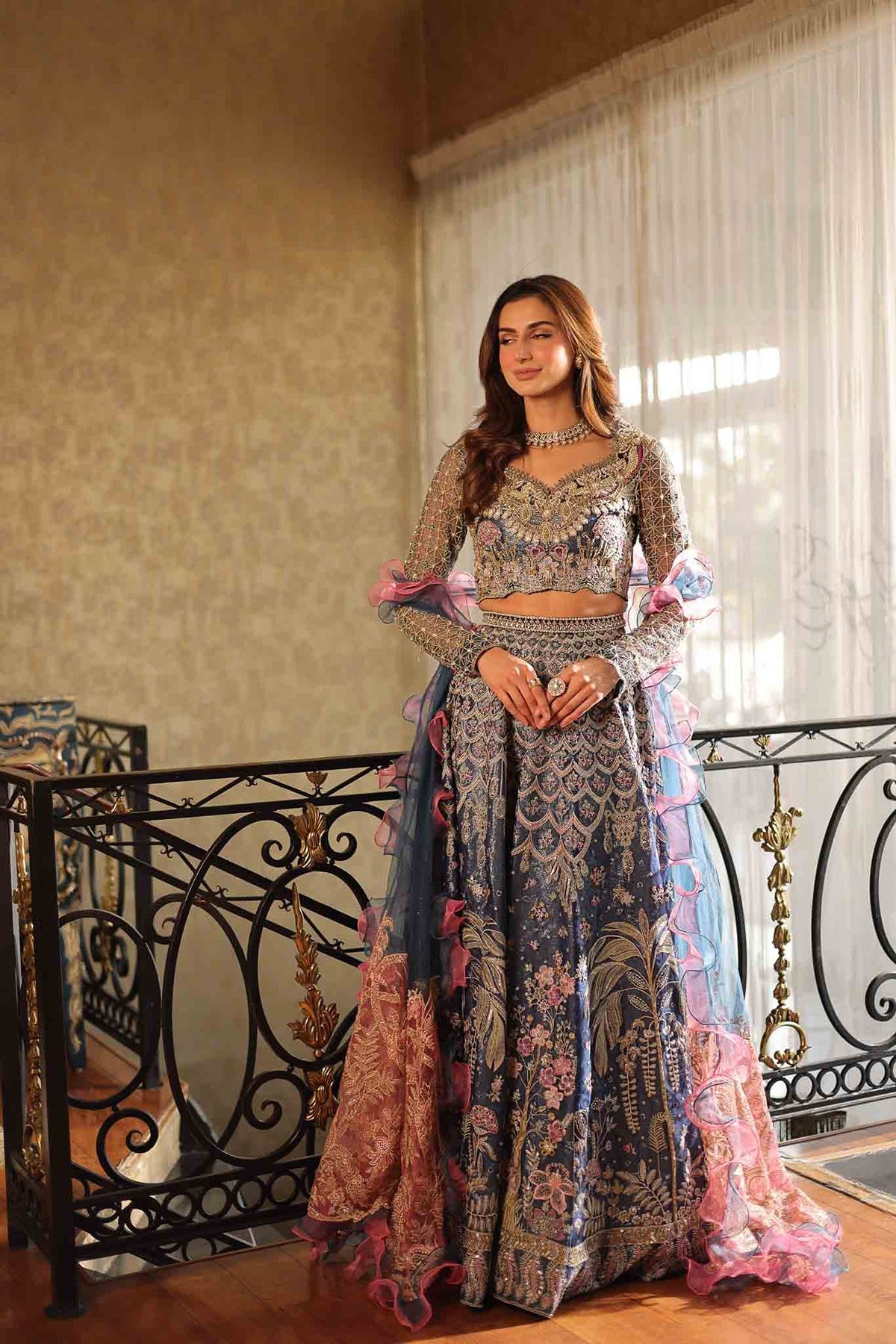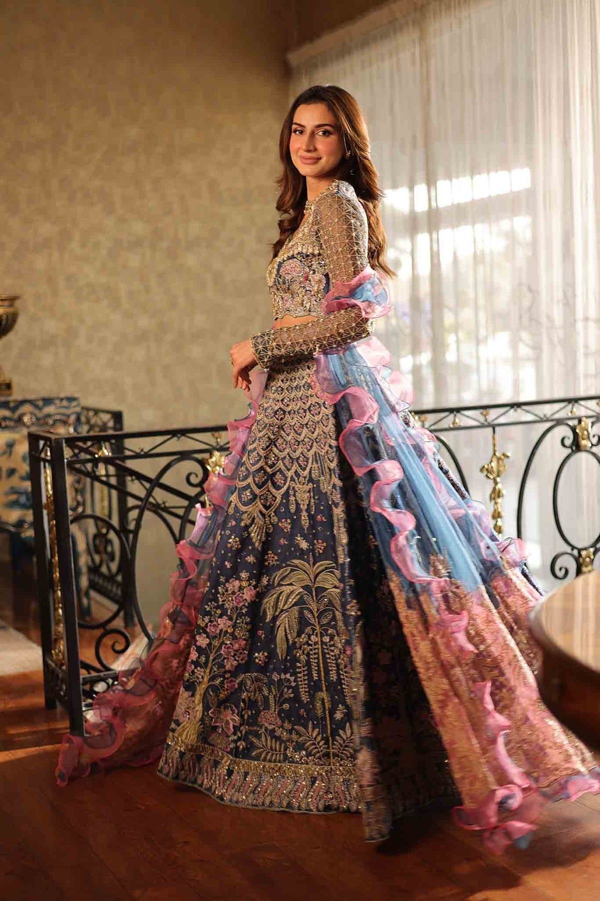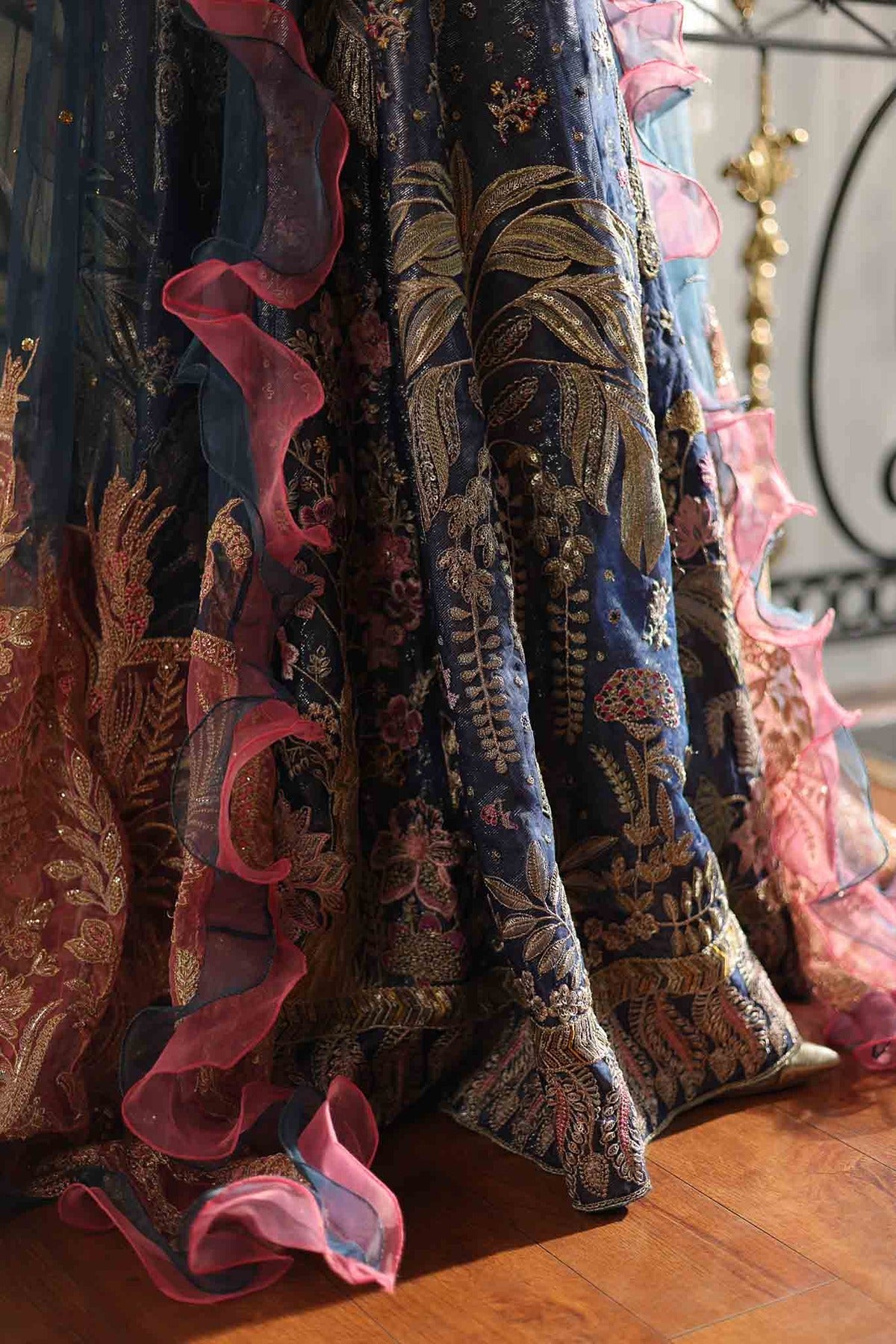 This gorgeous ensemble includes a net lehenga choli with intricate details in shades of pink, gold, and blue. With pearls, sequins, and metallic threads as accents, the choli is elaborately adorned with geometric and floral patterns. It has soft, sweet touches because the sleeves are decorated with ruffled sheer pink tulle. The lehenga has a rich golden and blue embroidered pattern, which is complemented by delicate tulle ruffles at the waistline and hem, giving it a modern yet regal look. A striking necklace and rings finish the ensemble, making it ideal for a wedding or other joyous occasion. Deep blues, gentle pinks, and gold tones make up this ensemble's color scheme, which produces a unified and opulent look.