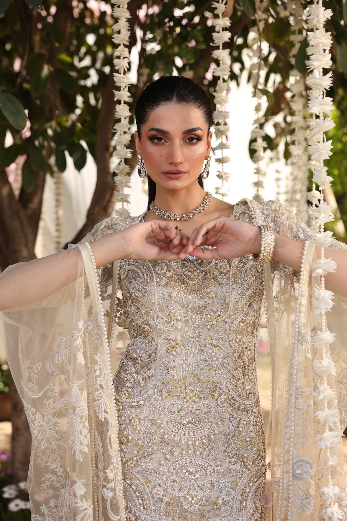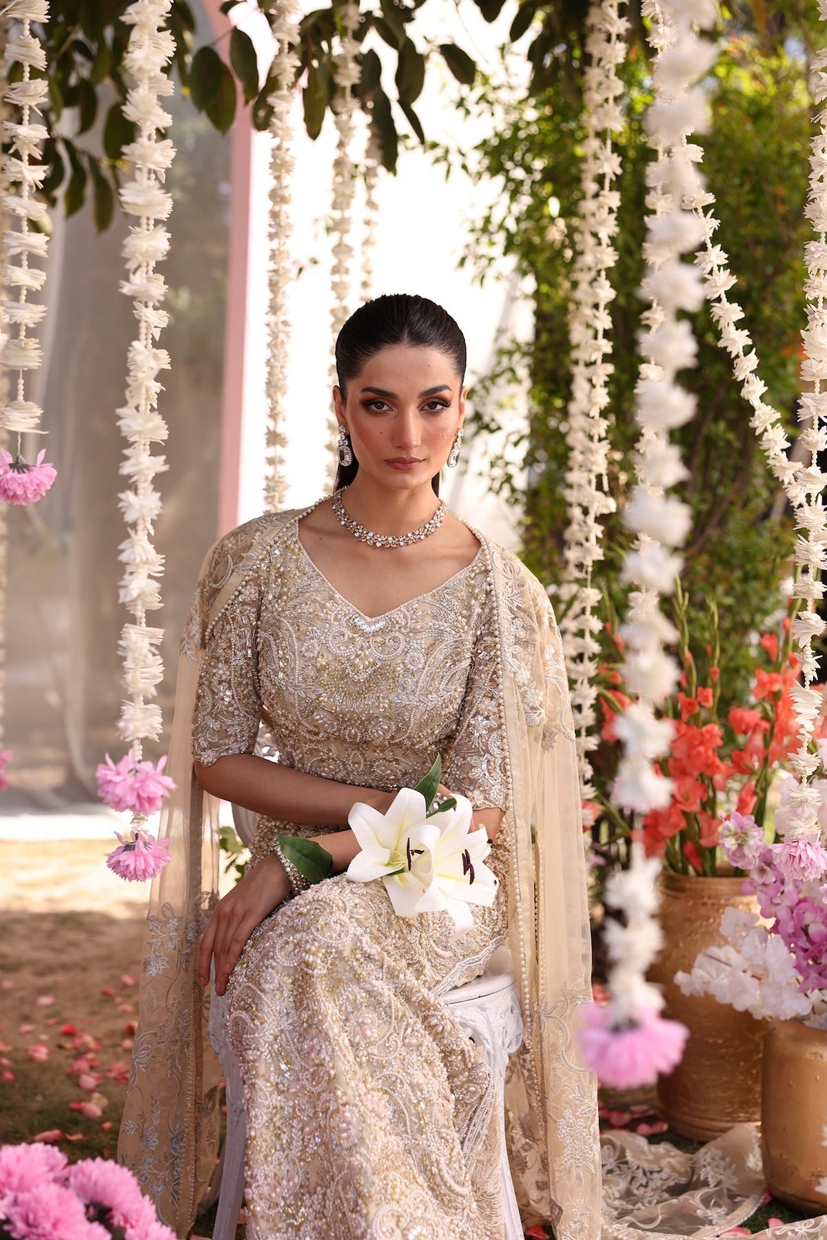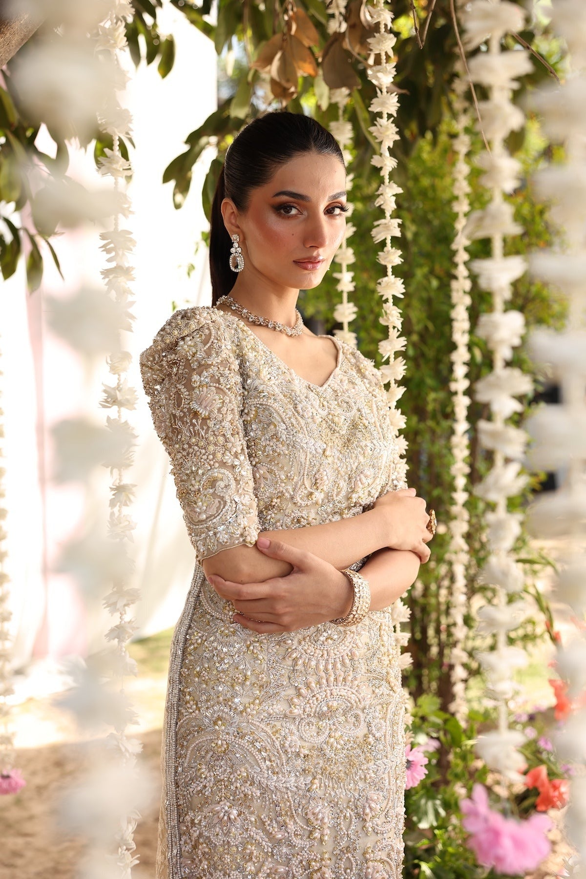 This sophisticated gown is a breathtaking demonstration of exquisite craftsmanship and glitz. Its delicate net fabric, embellished with threadwork and glittering beads, makes it ideal for an elegant occasion. With its delicate pastel colors and metallic accents, the color scheme gives the whole design a sophisticated, dreamy appearance. The two-piece set's form-fitting style draws attention to the figure, and the intricate embellishments give it a beautiful touch. When paired with complementary accessories, this ensemble radiates elegance and wealth.