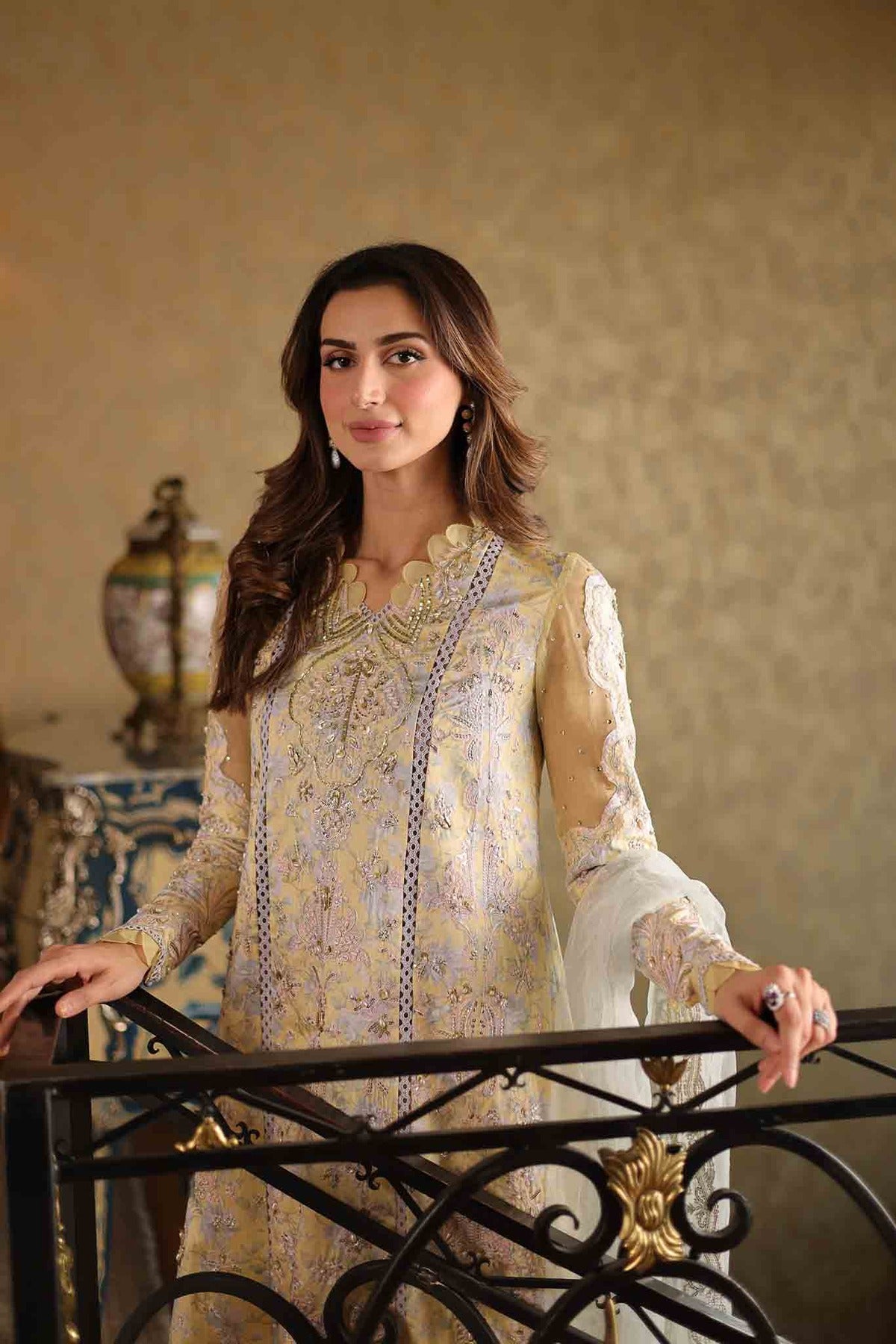 This gorgeous dress is made of delicately printed raw silk fabric that exudes grace and richness. This outfit is ideal for any celebratory occasion because of the elaborate embellishments all over the body, which provide an air of luxury. Fine needlework in gentle pastel tones excellently complements the delicate yellow tint, giving the piece a calm and refined appearance. A sheer, flowing organza dupatta completes the look, adding lightness to the design while also adding a subtle touch of refinement. This delicate design, with its timeless elegance, is the ideal combination of heritage and current style.