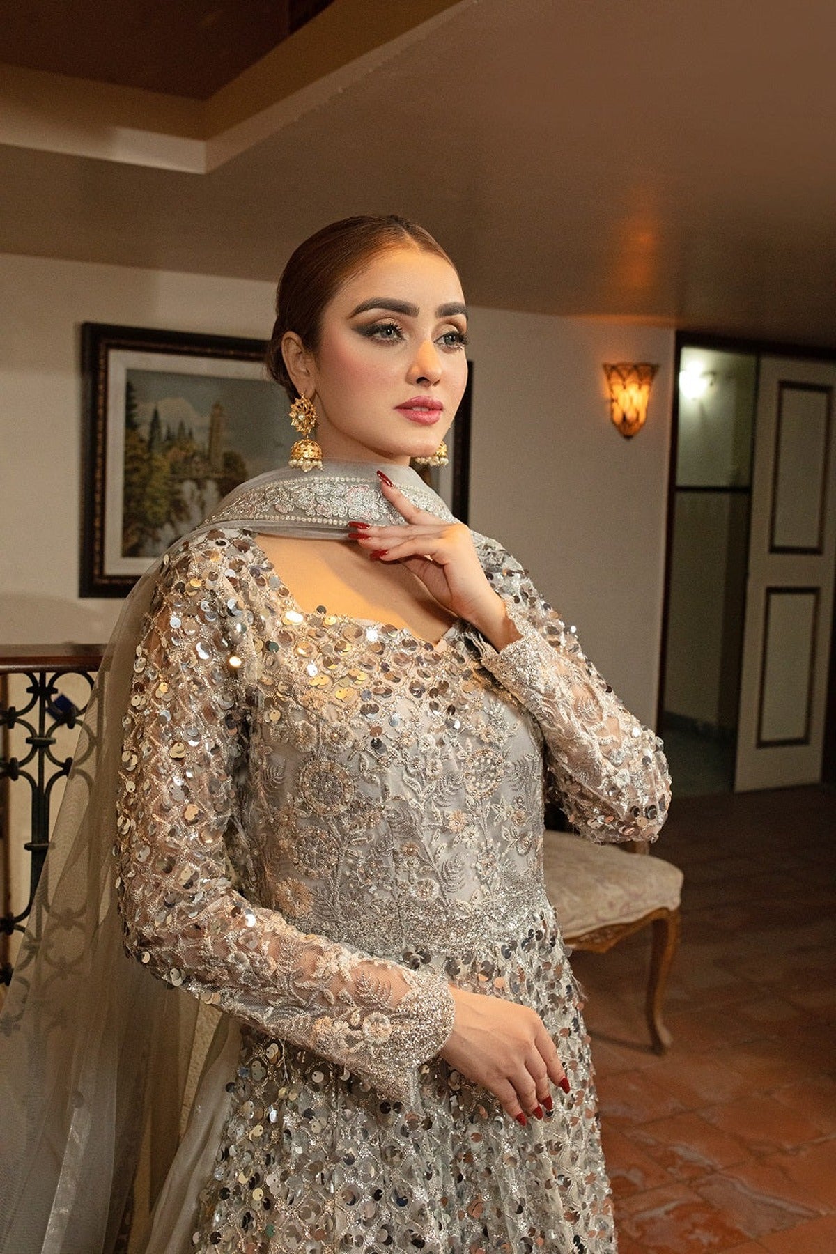 NAKOOSH | BRIDAL | NB-5023 SILVER LONG STITCHED 3PC DRESS