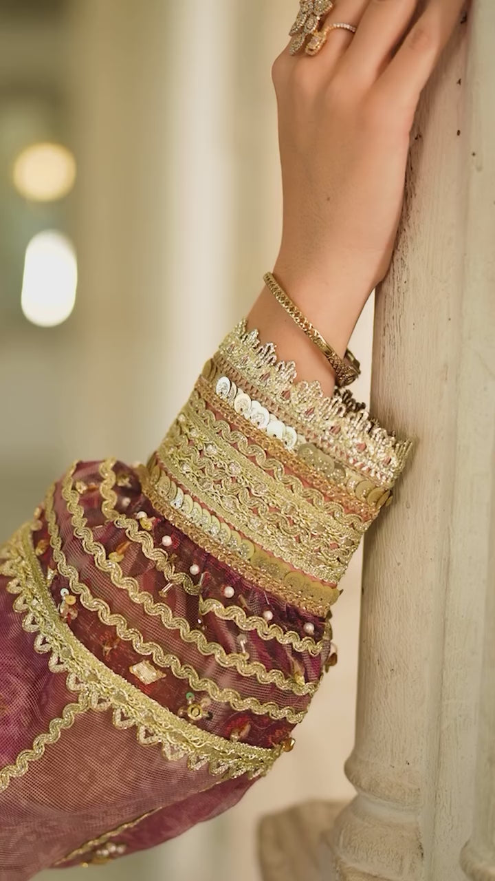 This cotton net ensemble blooms with a digitally illustrated paneled print, softly merging two shades of old rose pink in graceful contrast. Hand embellishments trace the design with delicate shimmer, elevating the artful base into a timeless statement of sophistication.