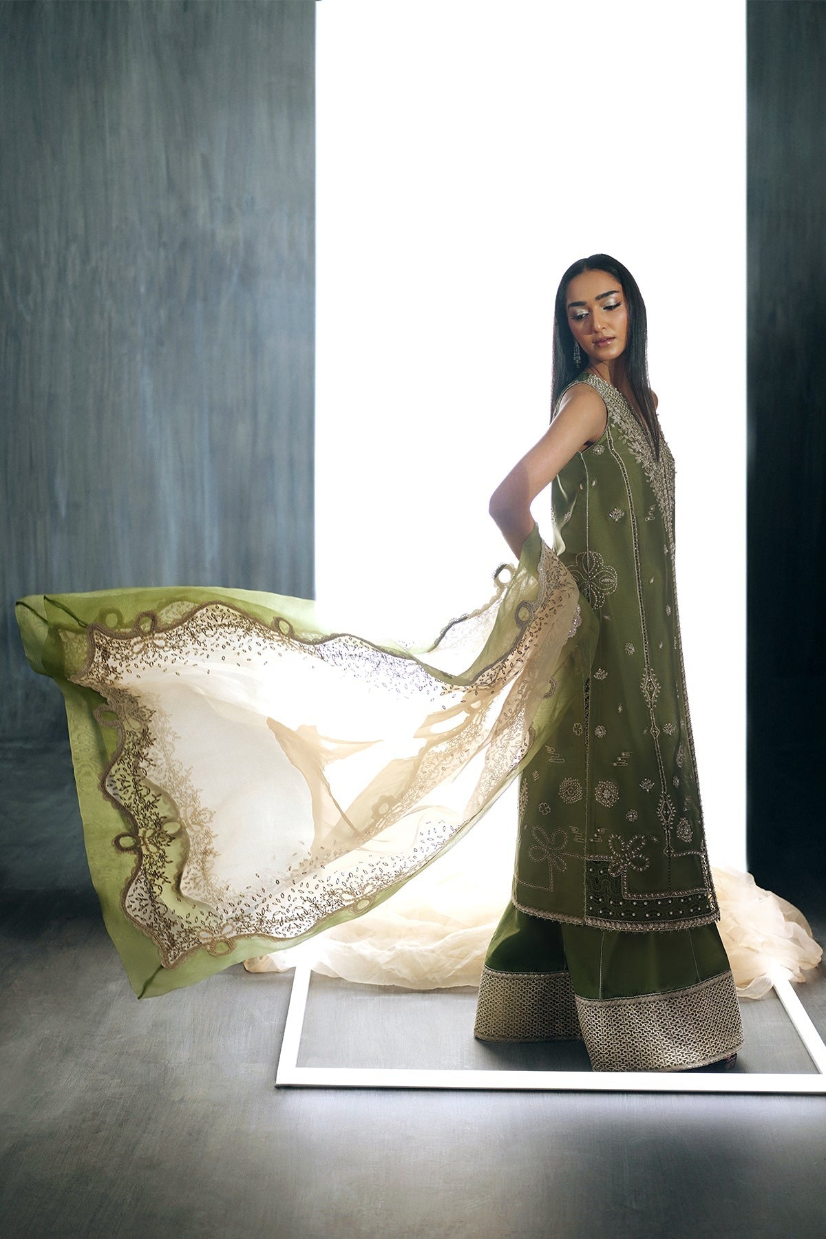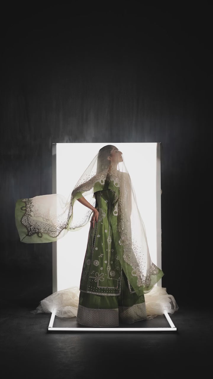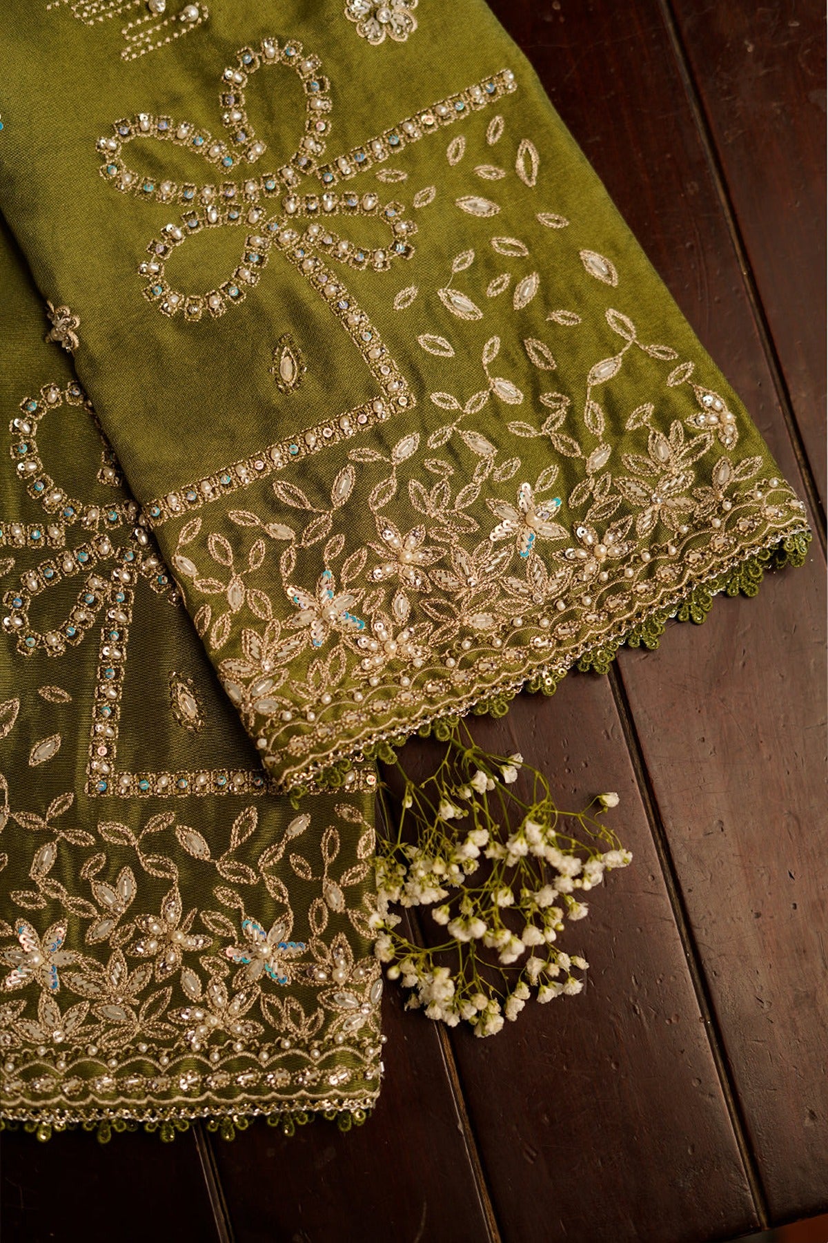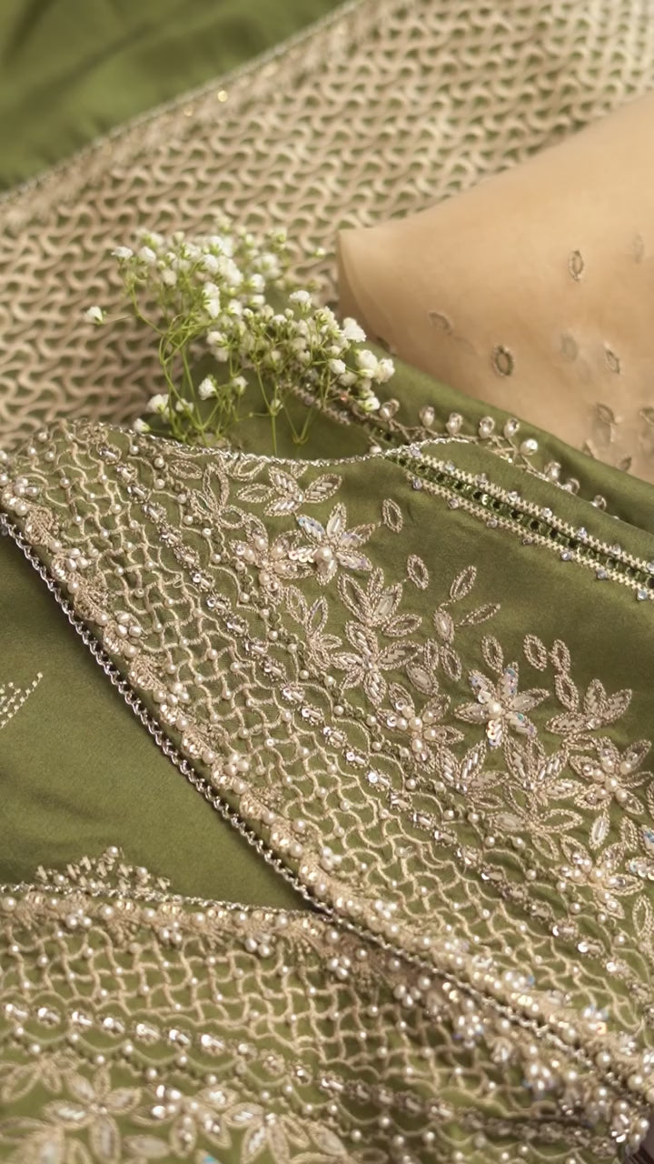 Bella is a stunning ensemble crafted from luxurious Shirt and Trouser Silk, paired with an elegant Organza dupatta. The shirt features intricate floral embroidery with Tilla and Cut Dana work, enhanced by shimmering sequins and sitar embellishments. Lustrous pearls in varying sizes add depth and sophistication. The matching silk trousers and delicate organza dupatta complete this timeless look, offering a perfect blend of tradition, grace, and modern luxury.