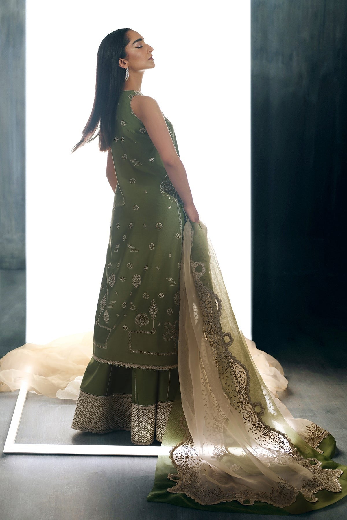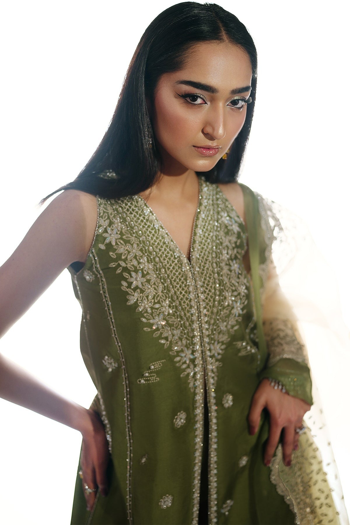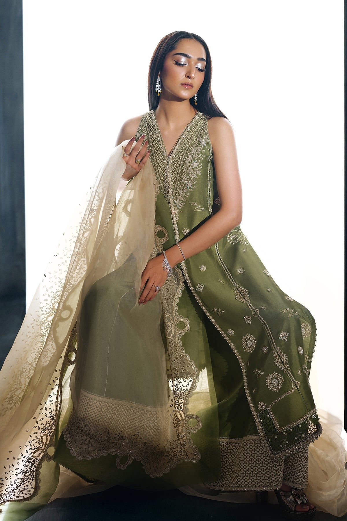 Bella is a stunning ensemble crafted from luxurious Shirt and Trouser Silk, paired with an elegant Organza dupatta. The shirt features intricate floral embroidery with Tilla and Cut Dana work, enhanced by shimmering sequins and sitar embellishments. Lustrous pearls in varying sizes add depth and sophistication. The matching silk trousers and delicate organza dupatta complete this timeless look, offering a perfect blend of tradition, grace, and modern luxury.
